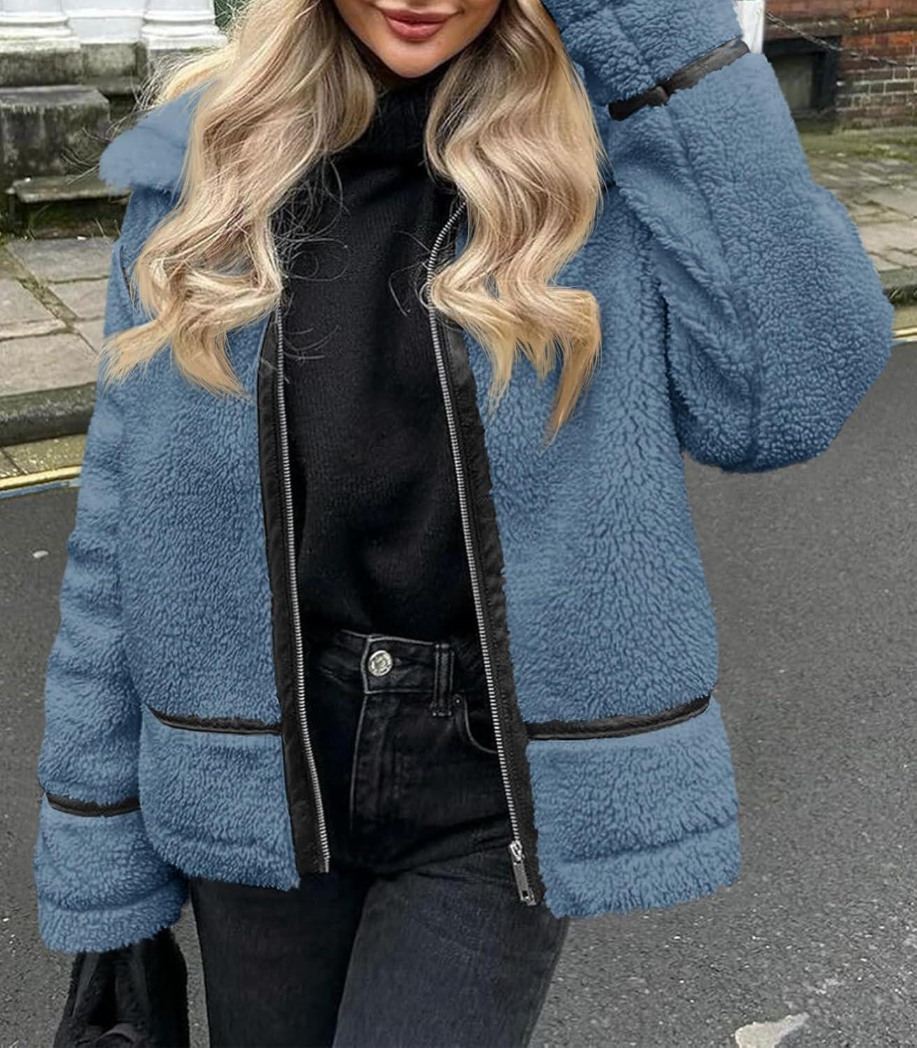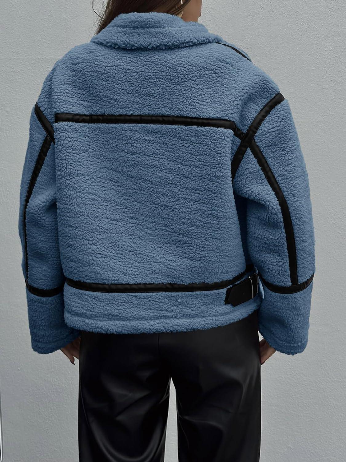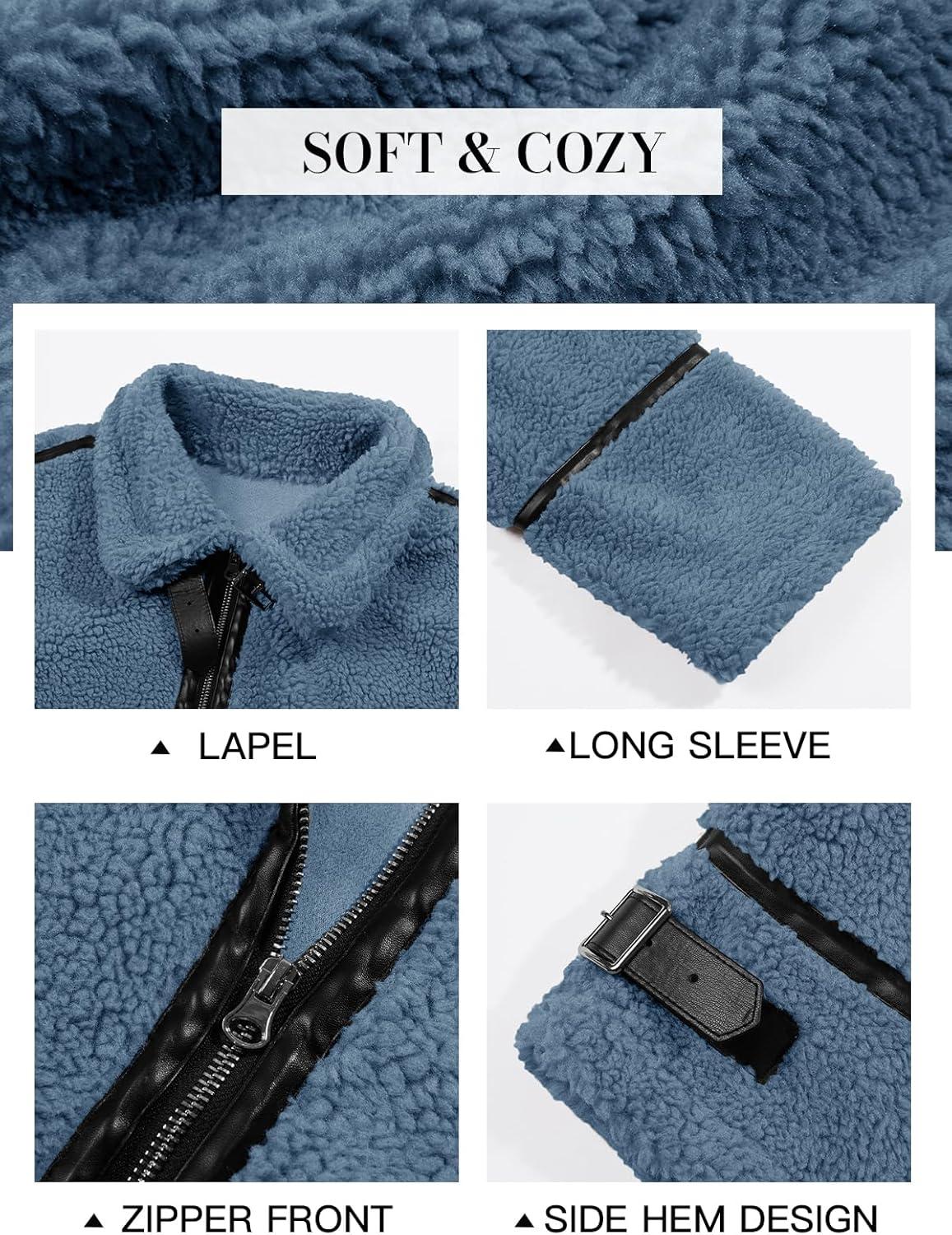 Tankaneo Womens Faux Fur Jackets Winter Trendy Sherpa Moto Leather Patchwork Zip Up Coat(Blue)