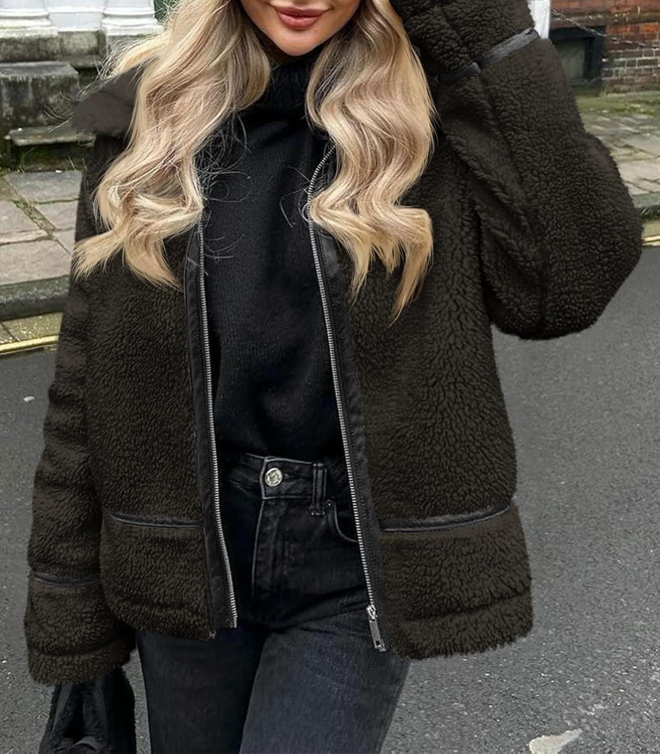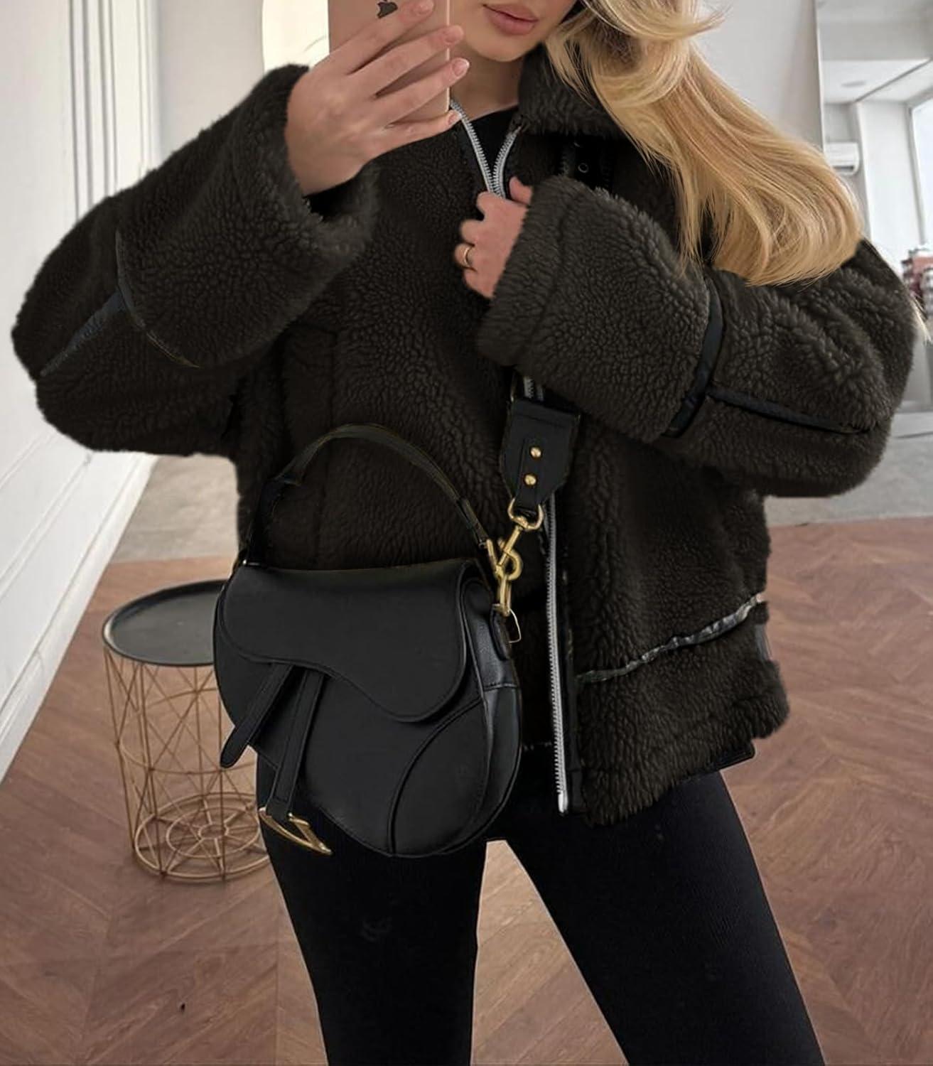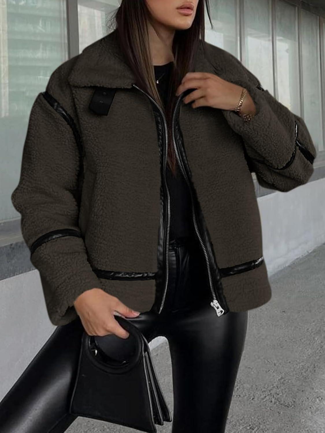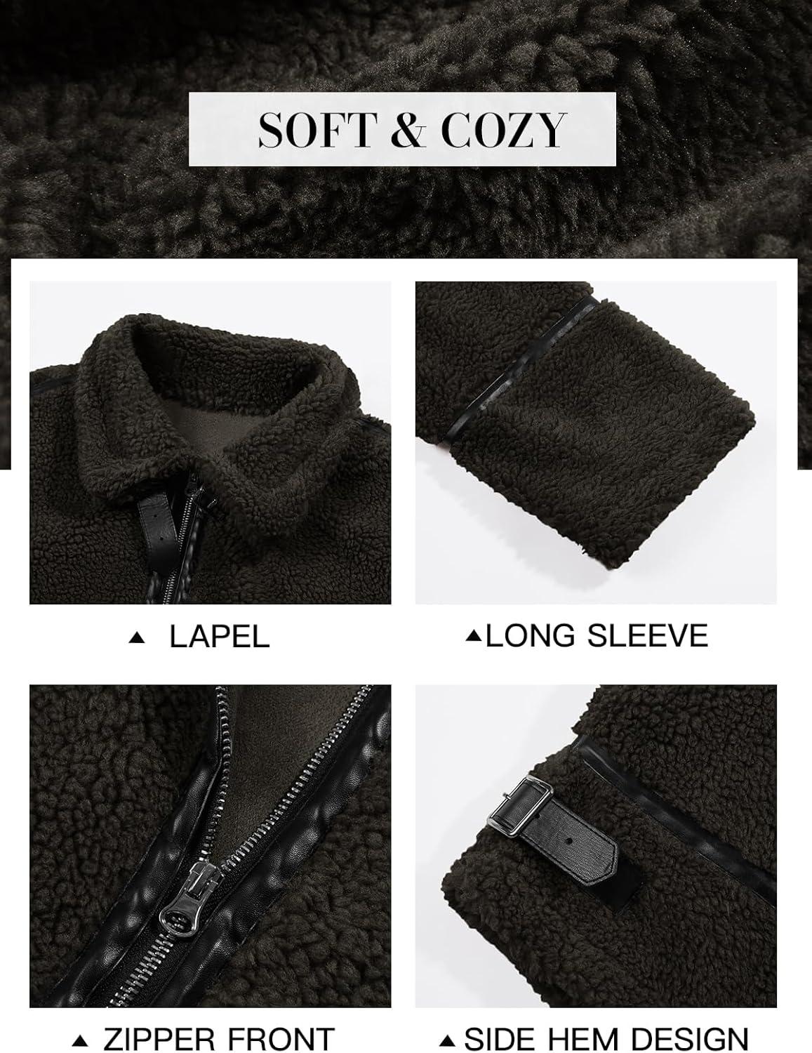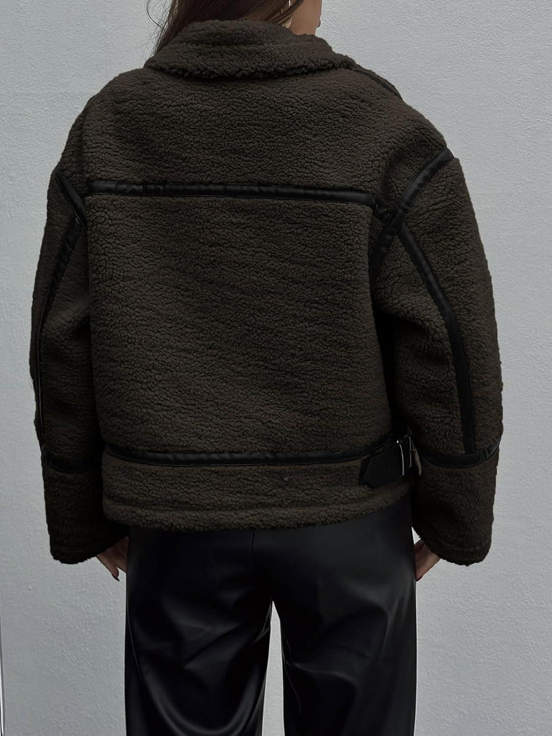 Tankaneo Womens Faux Fur Jackets Winter Trendy Sherpa Moto Leather Patchwork Zip Up Coat(Brown)