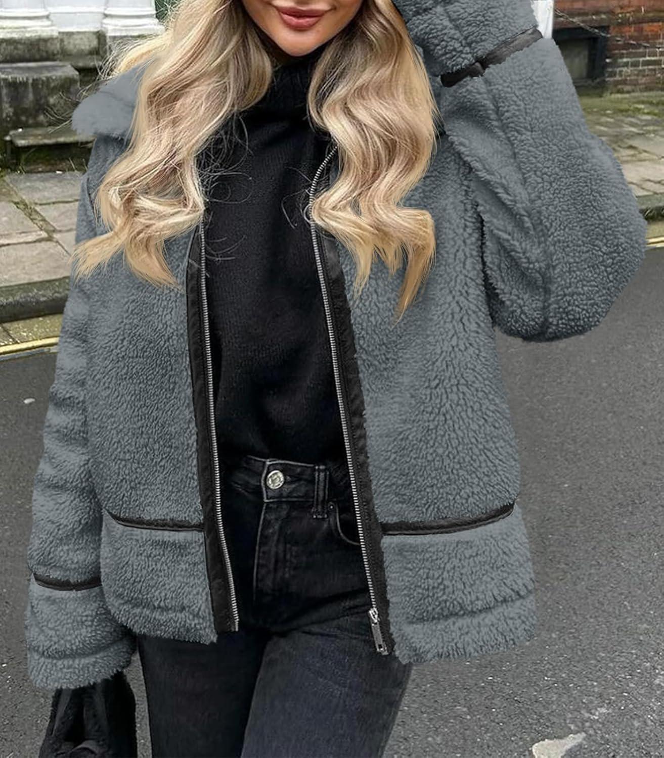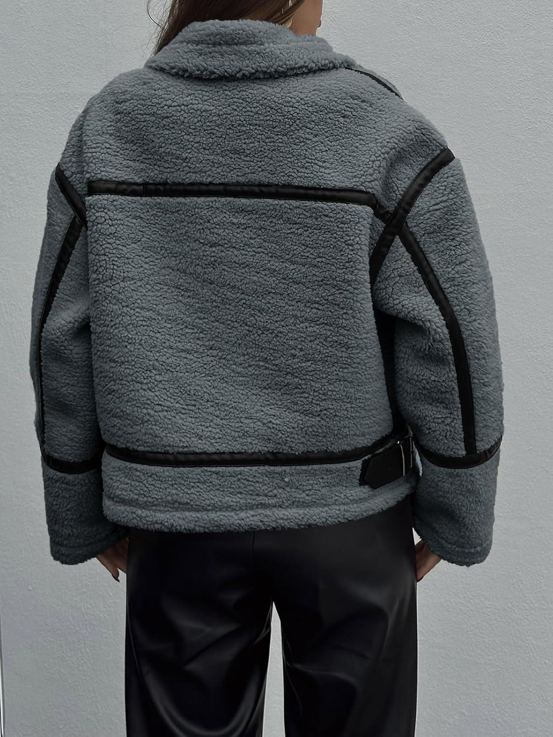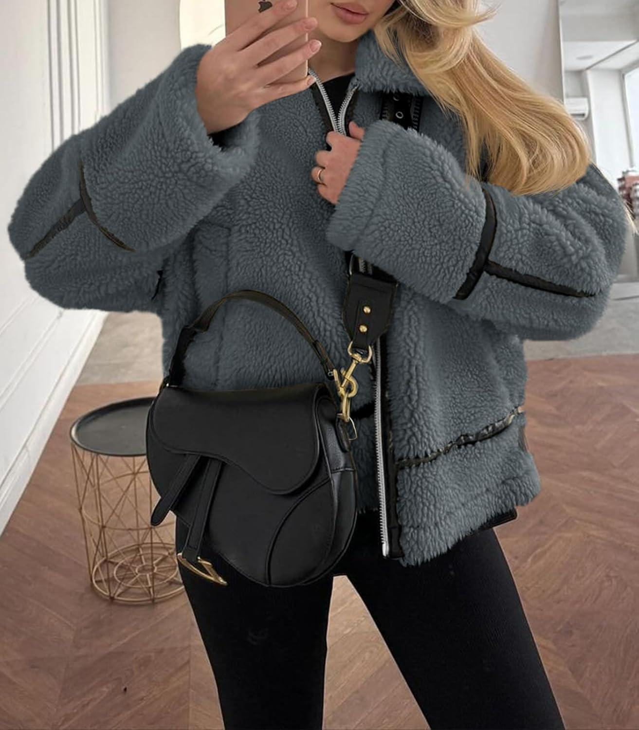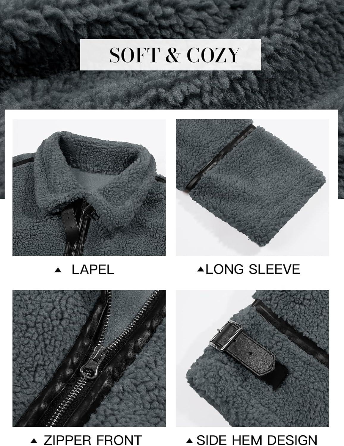 Tankaneo Womens Faux Fur Jackets Winter Trendy Sherpa Moto Leather Patchwork Zip Up Coat(Dark Grey)