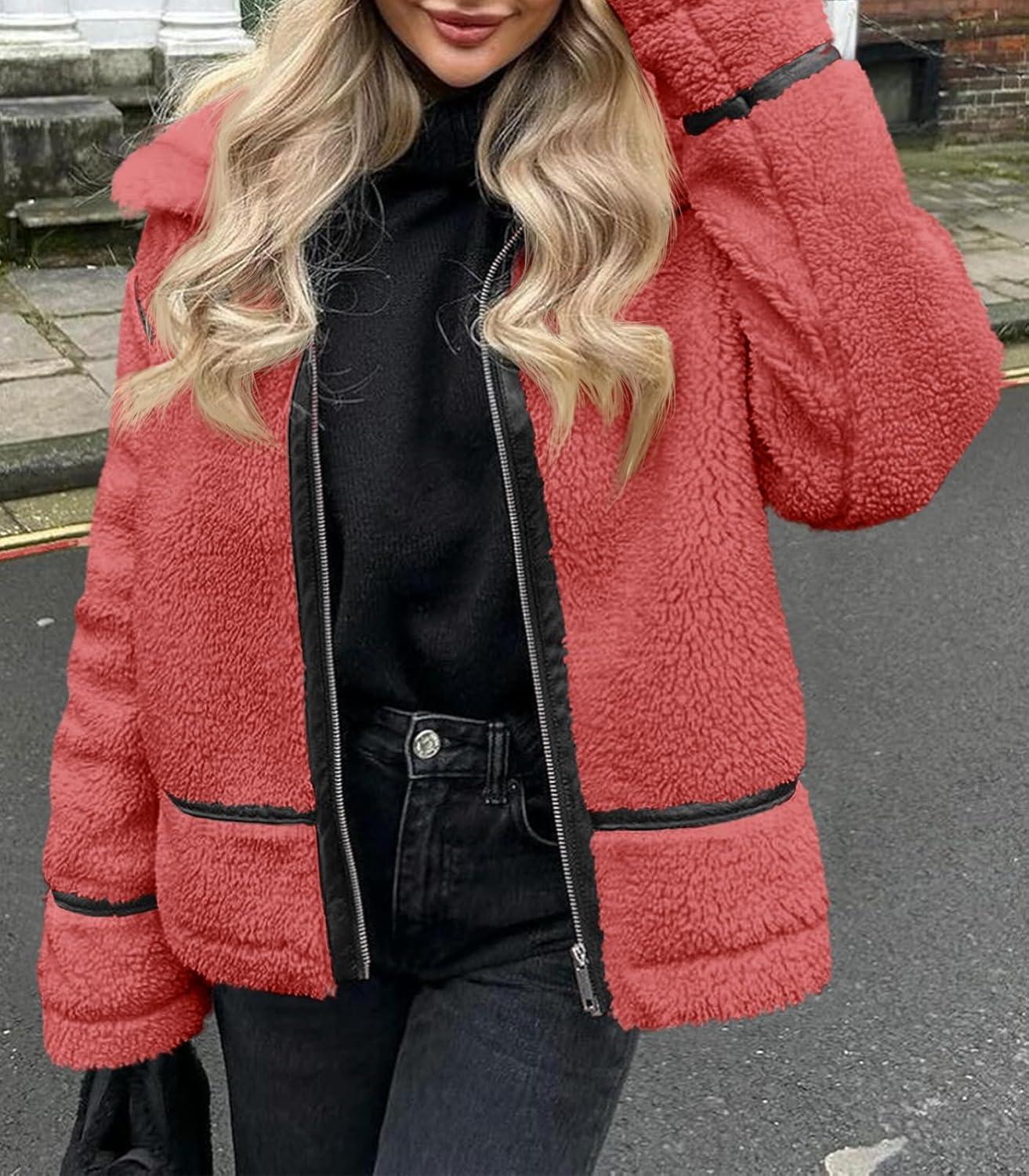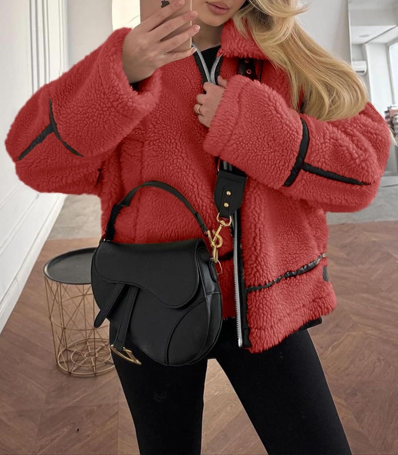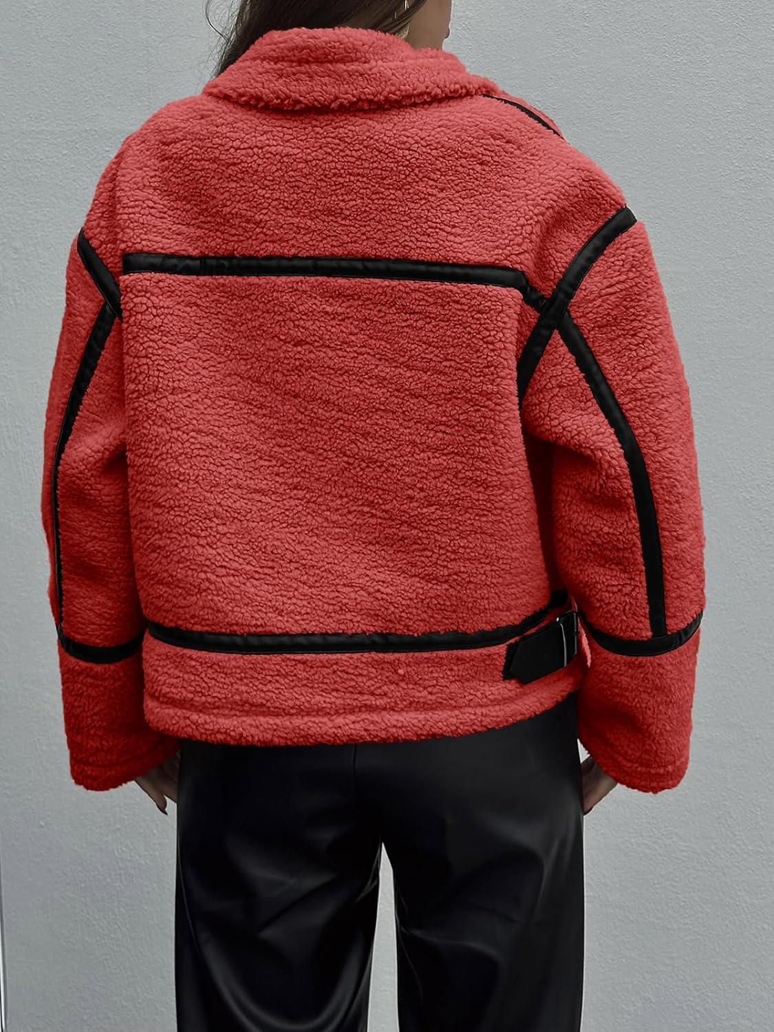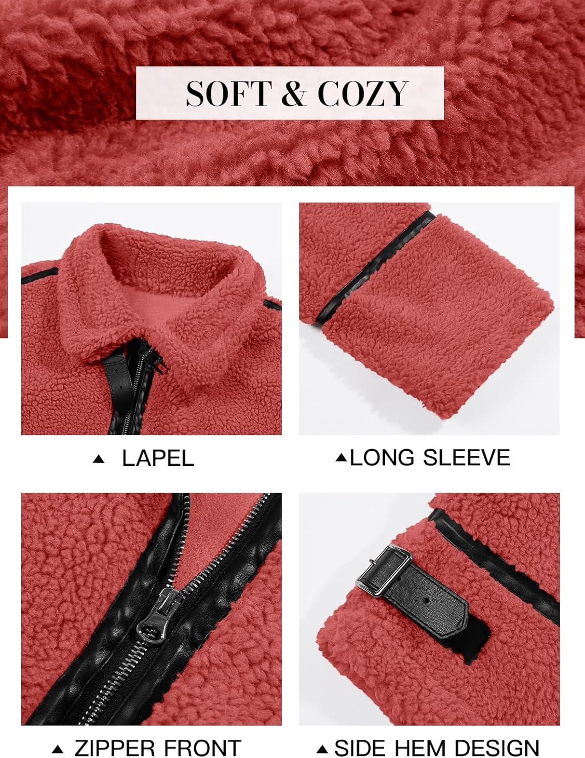 Tankaneo Womens Faux Fur Jackets Winter Trendy Sherpa Moto Leather Patchwork Zip Up Coat(Red)