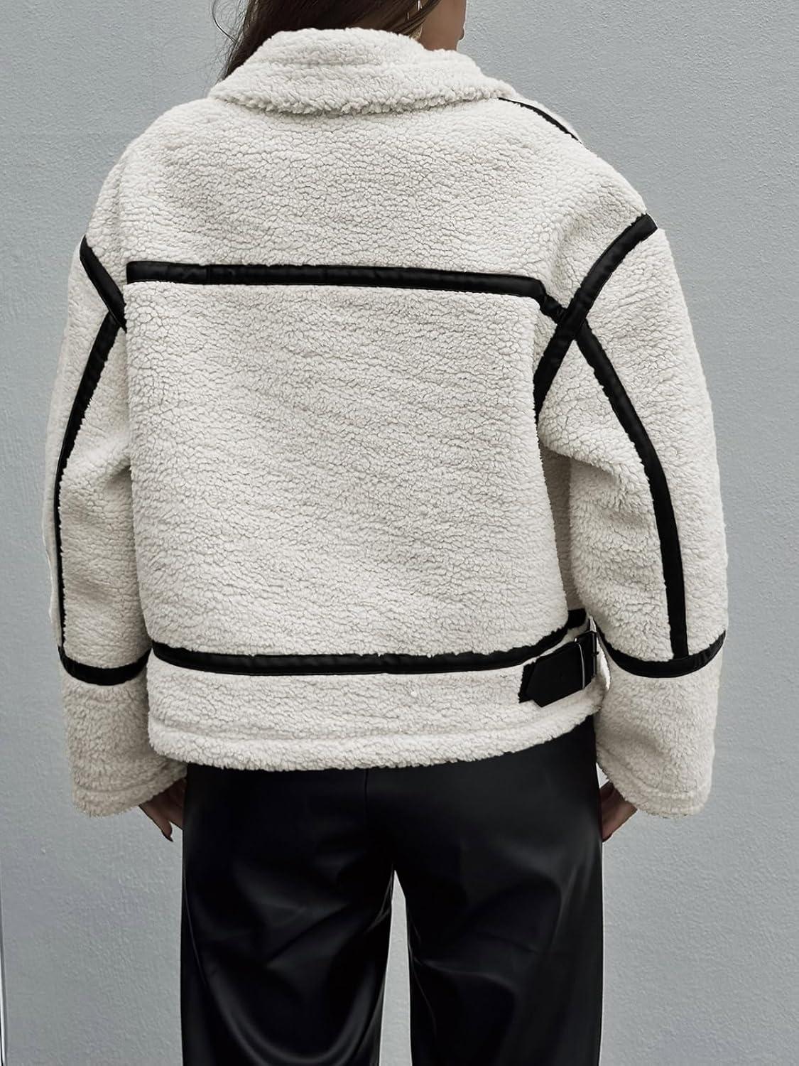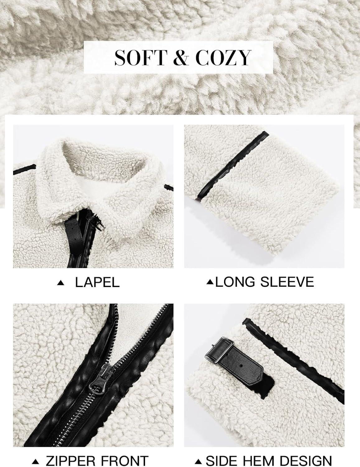 Tankaneo Womens Faux Fur Jackets Winter Trendy Sherpa Moto Leather Patchwork Zip Up Coat(White)
