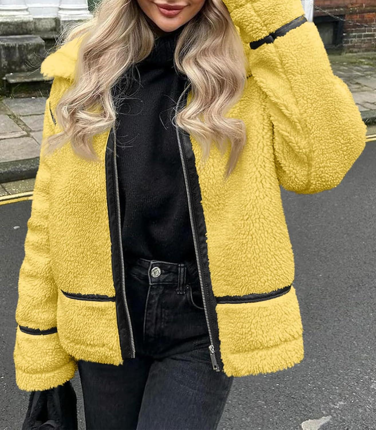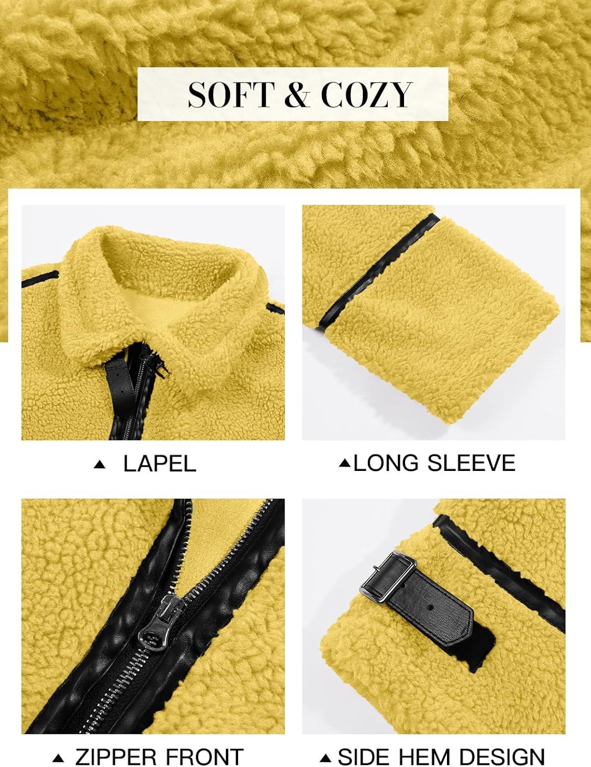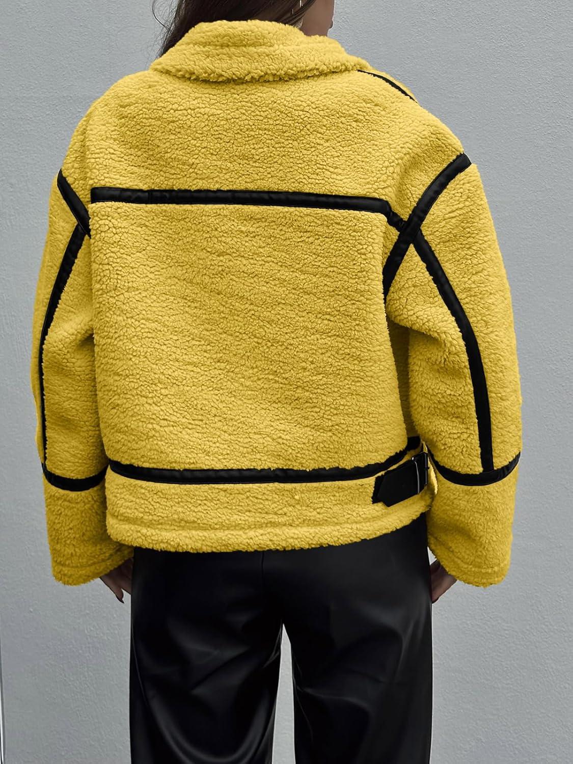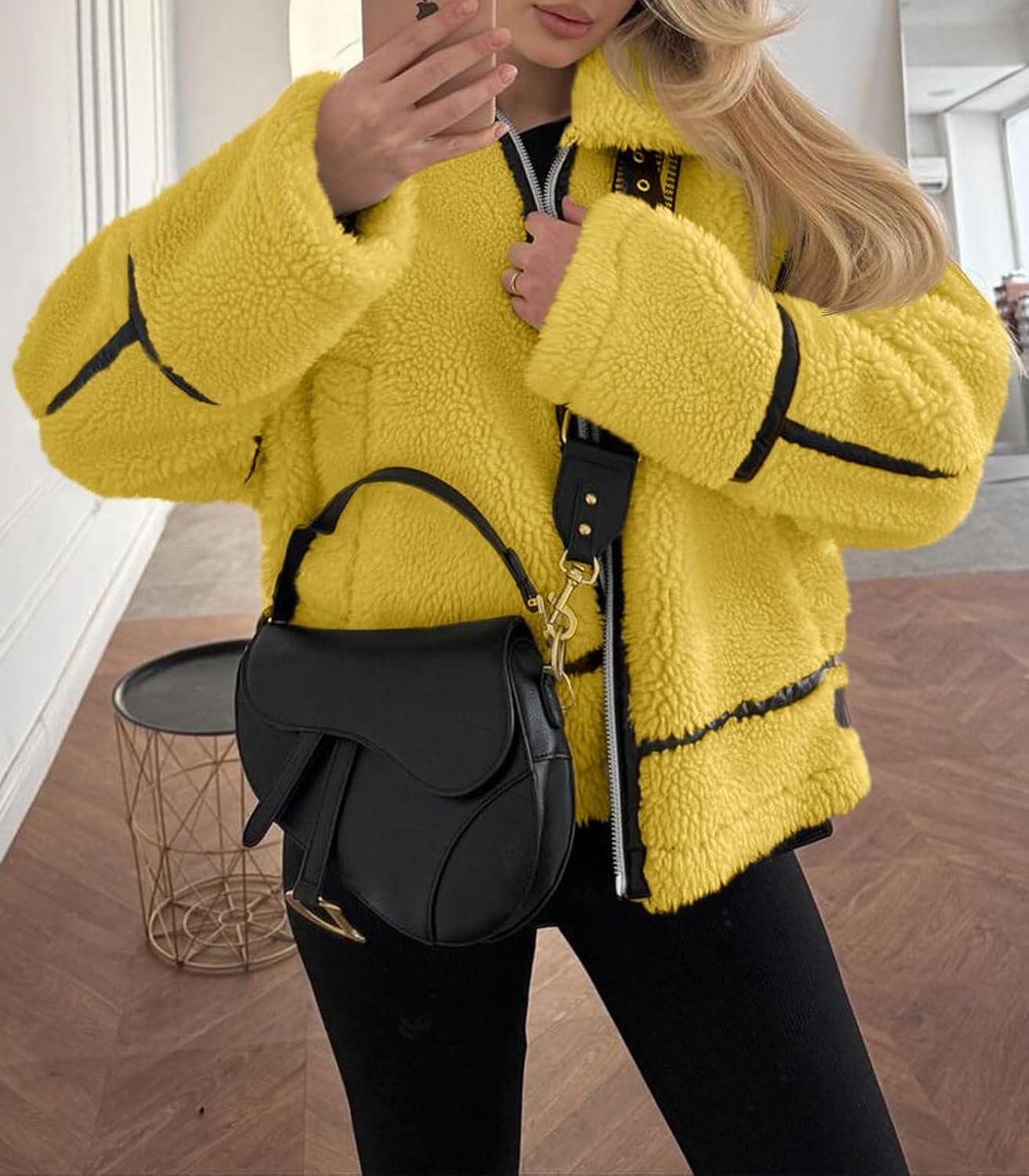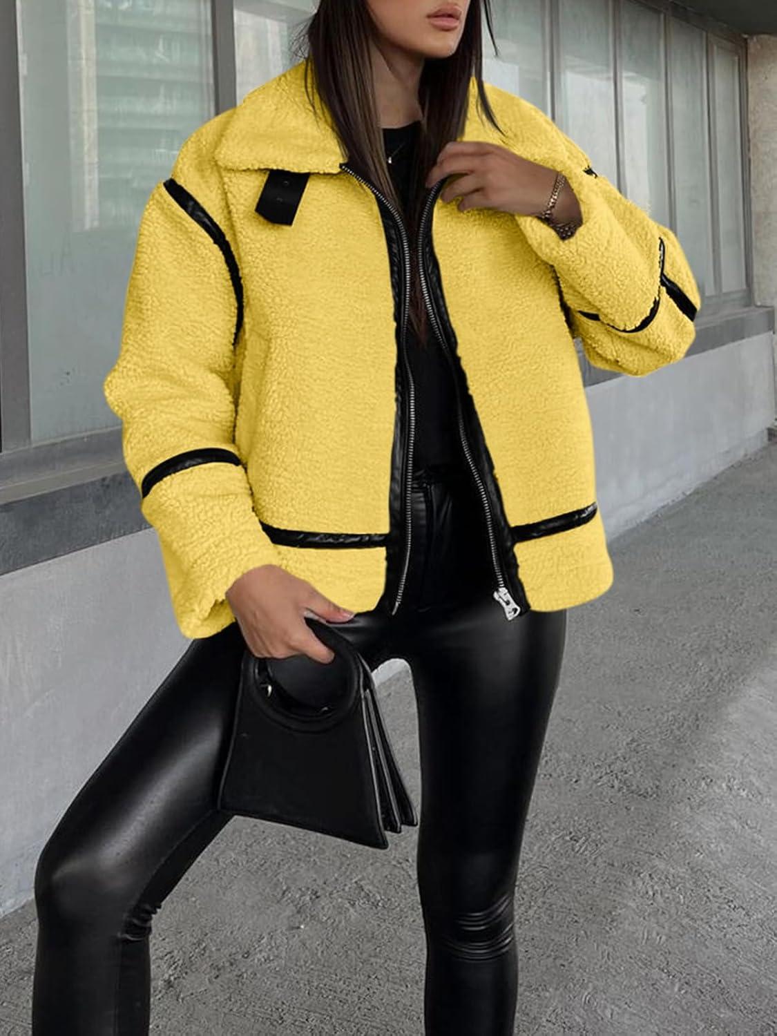 Tankaneo Womens Faux Fur Jackets Winter Trendy Sherpa Moto Leather Patchwork Zip Up Coat(Yellow)