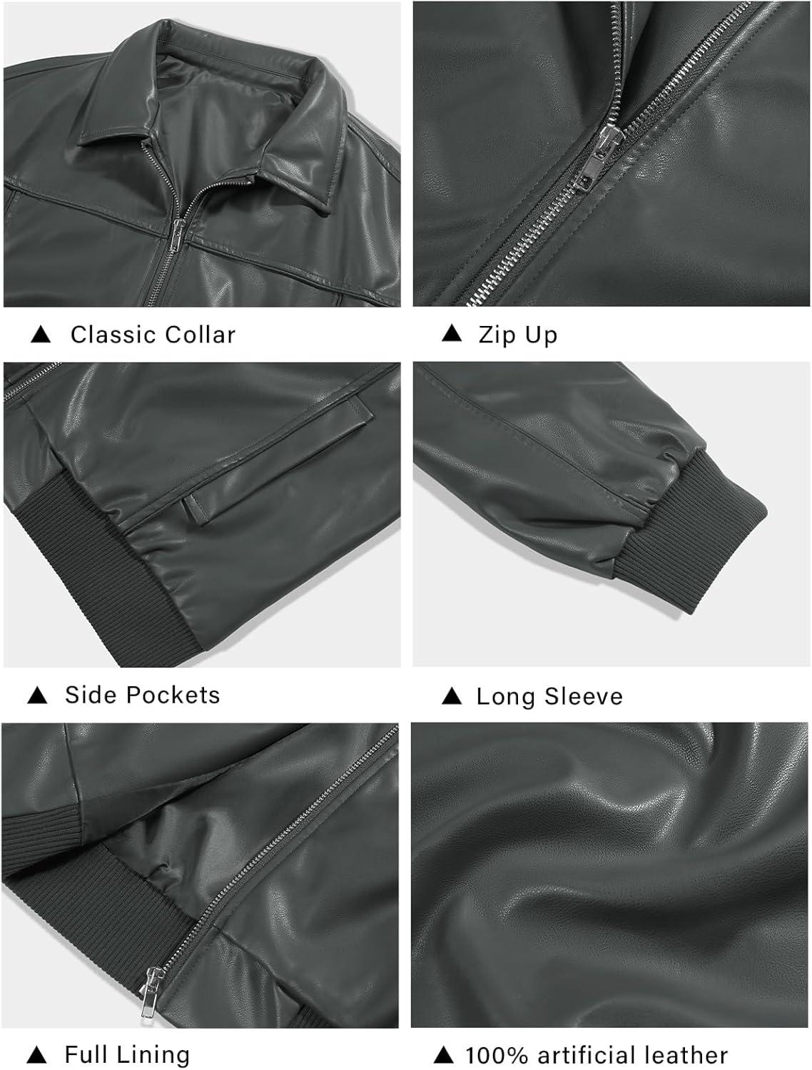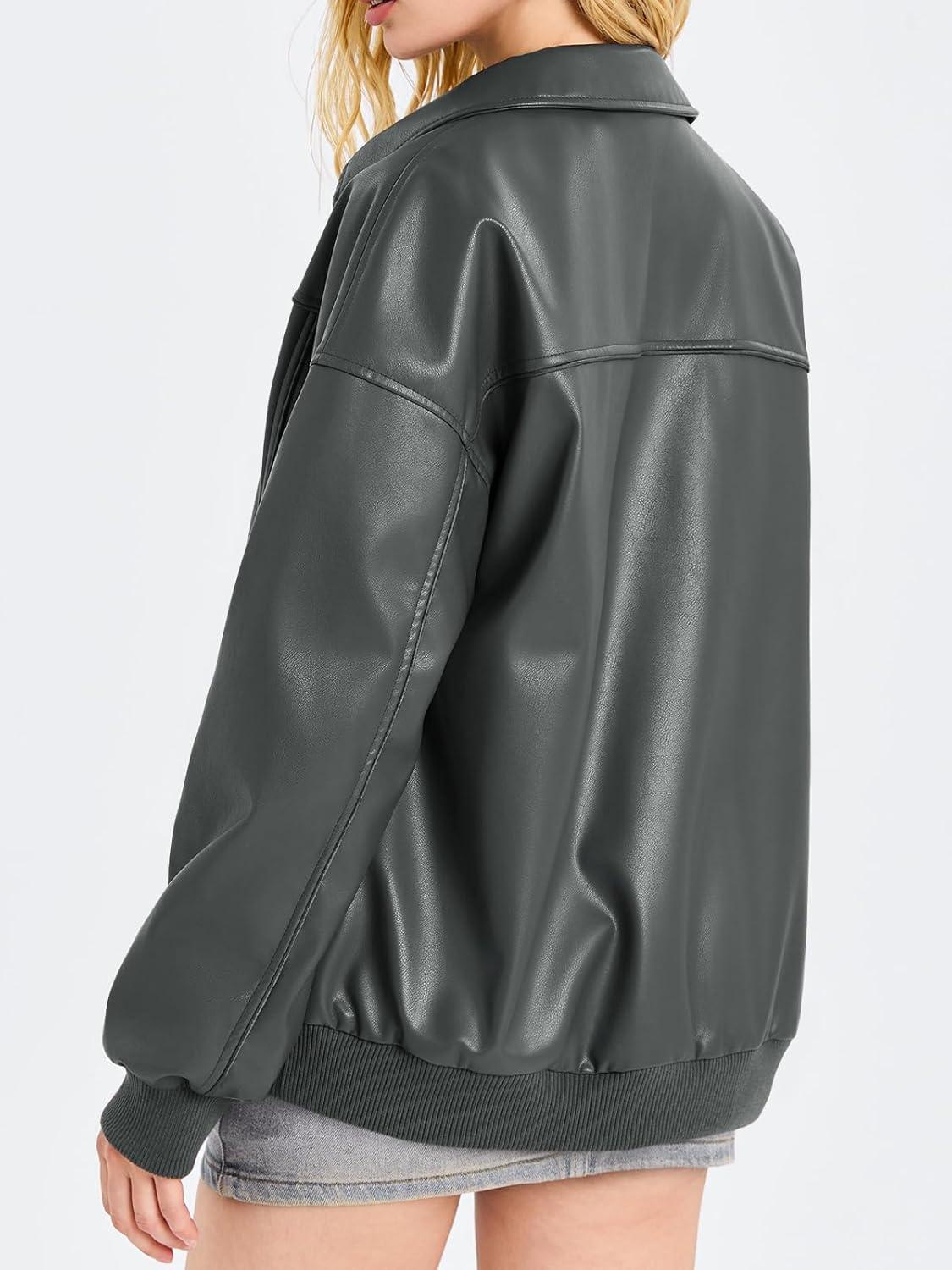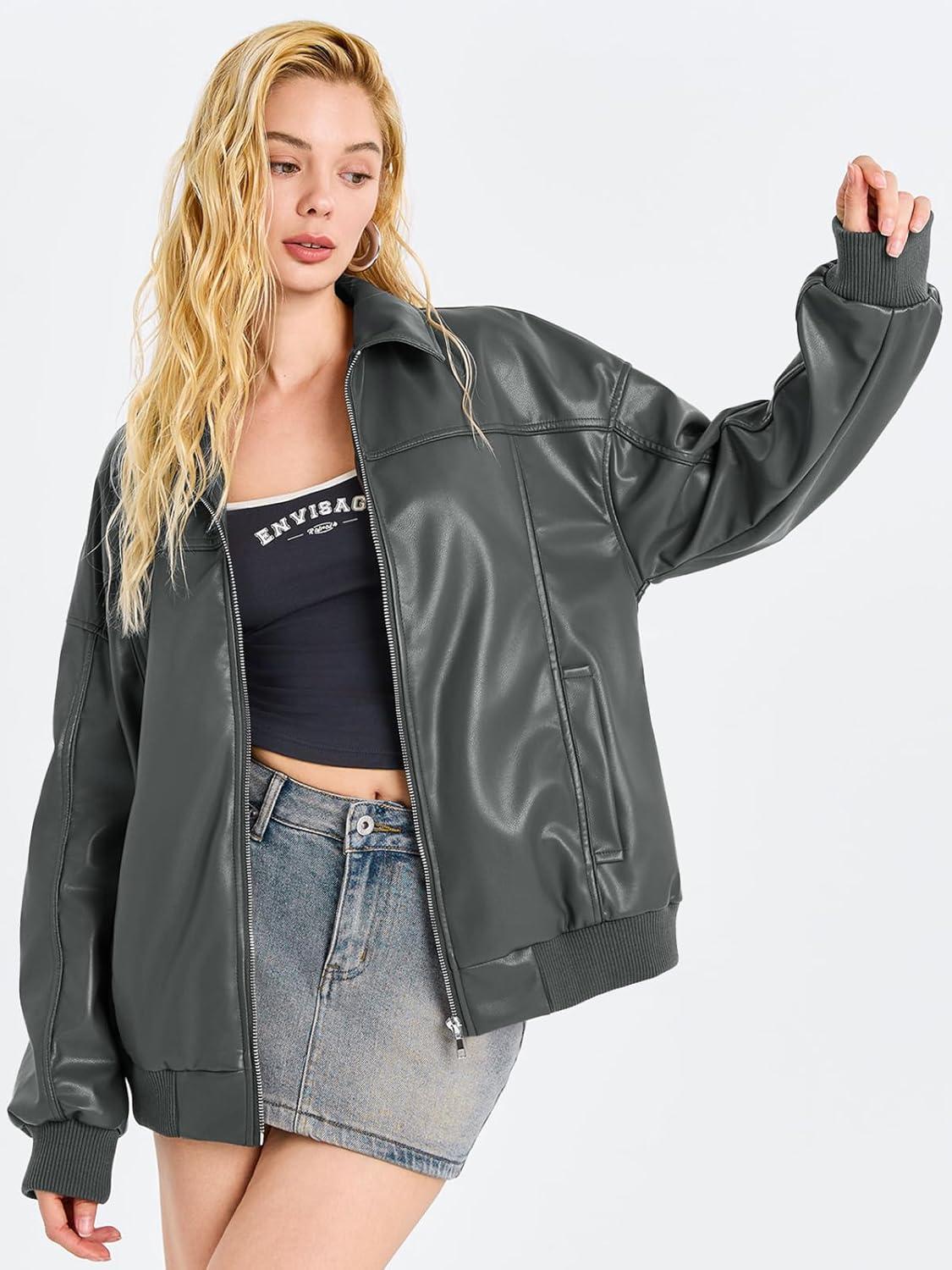Tankaneo Womens Faux Leather Jackets Oversized Bomber Casual Fall Fashion Zip Up Moto Biker Coats(Grey Green)