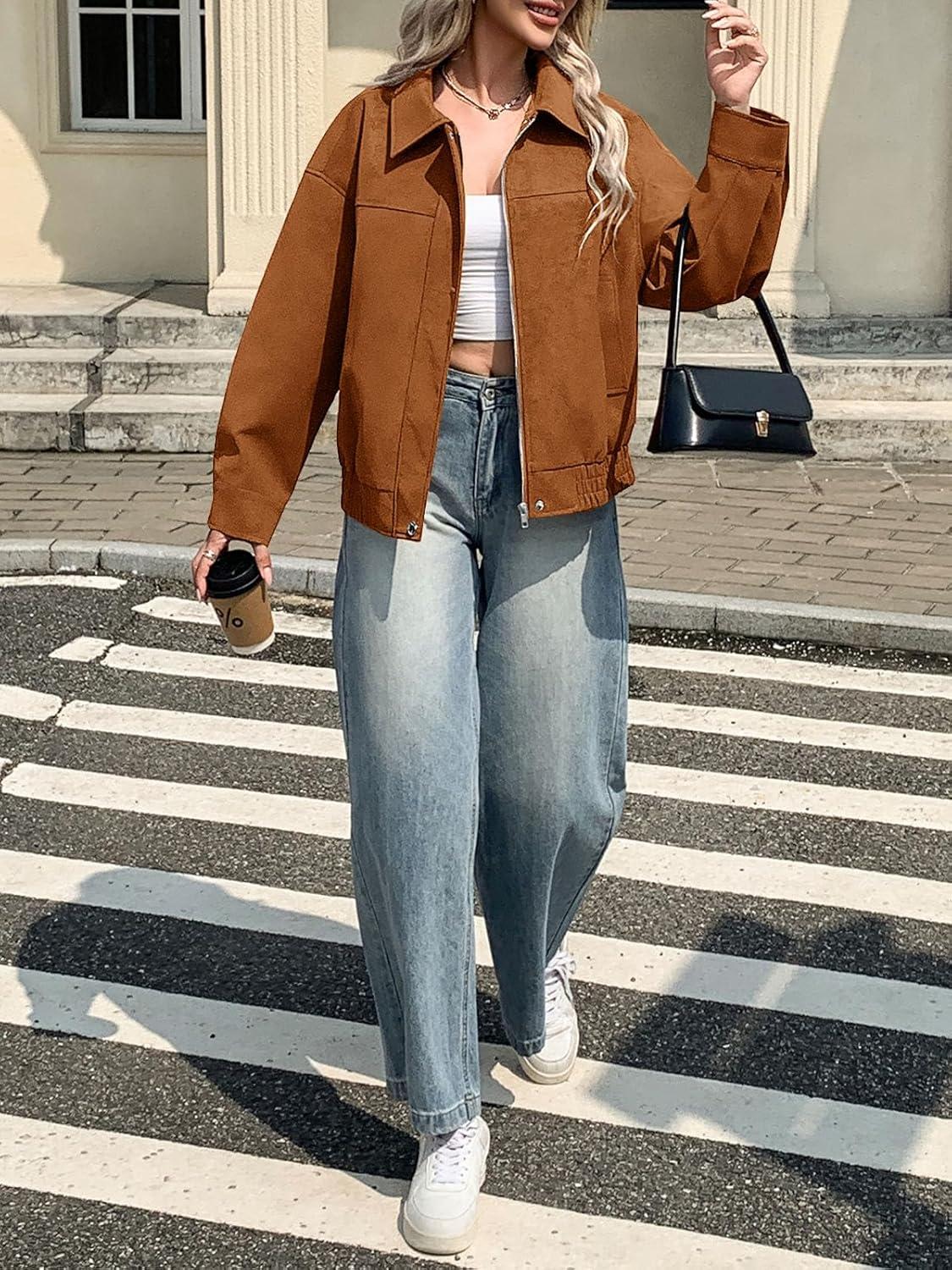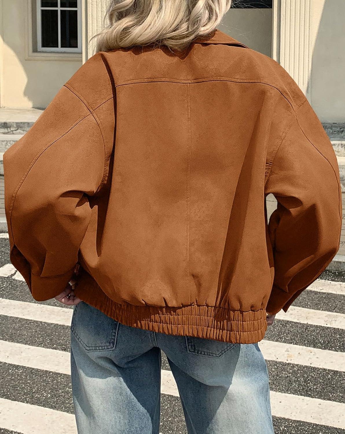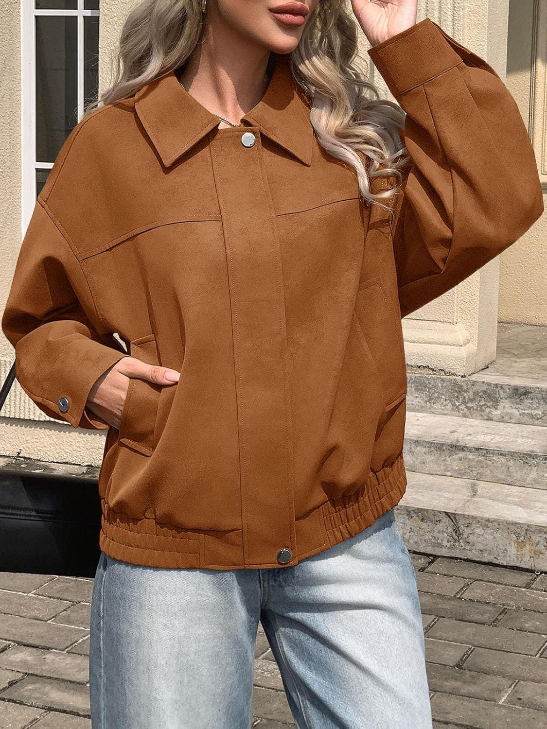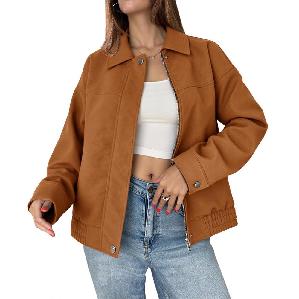 Tankaneo Women’s Faux Suede Motorcycle Jackets Oversized Zip Up Bomber Coats Fall Fashion Winter Outerwear(Brown)