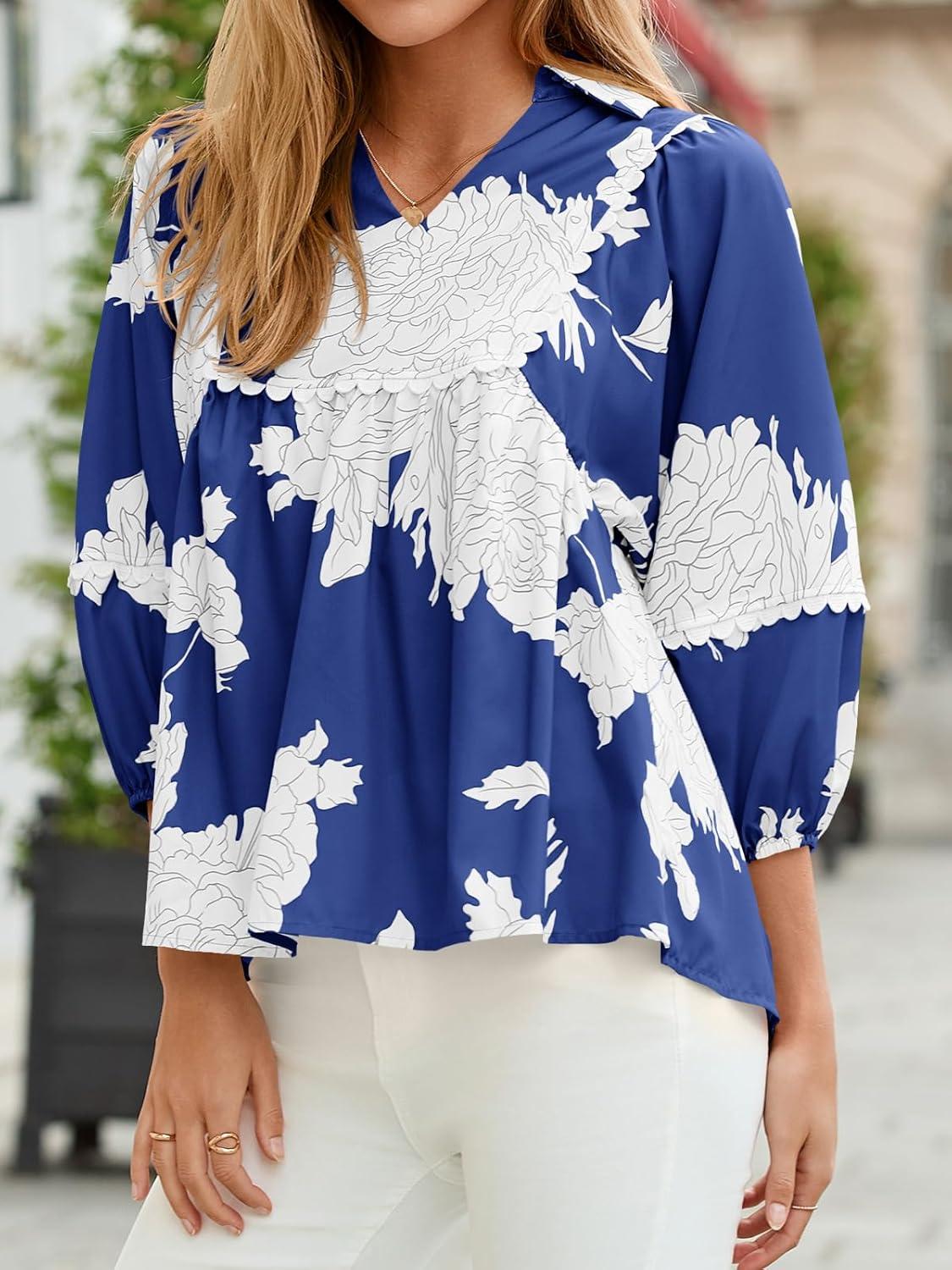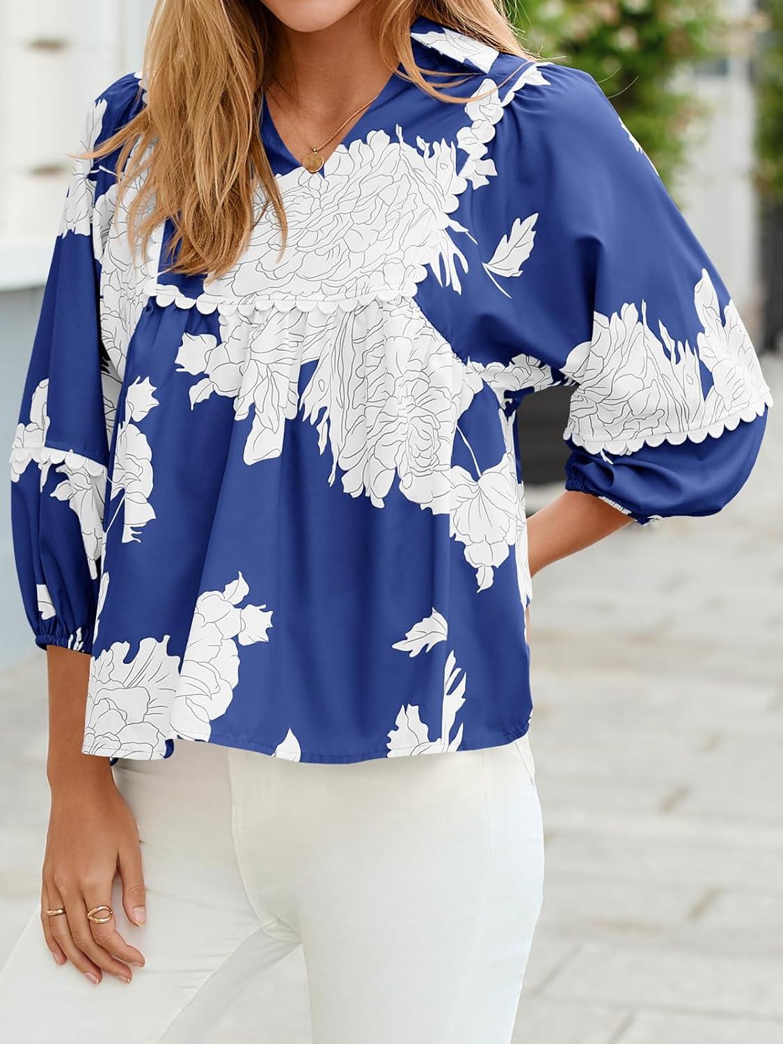 Tankaneo Womens Floral Peplum Babydoll Tops 3/4 Puff Sleeve Pleated Blouse Cute Casual V Neck Loose Fit Flowy Boho Shirts(Navy)