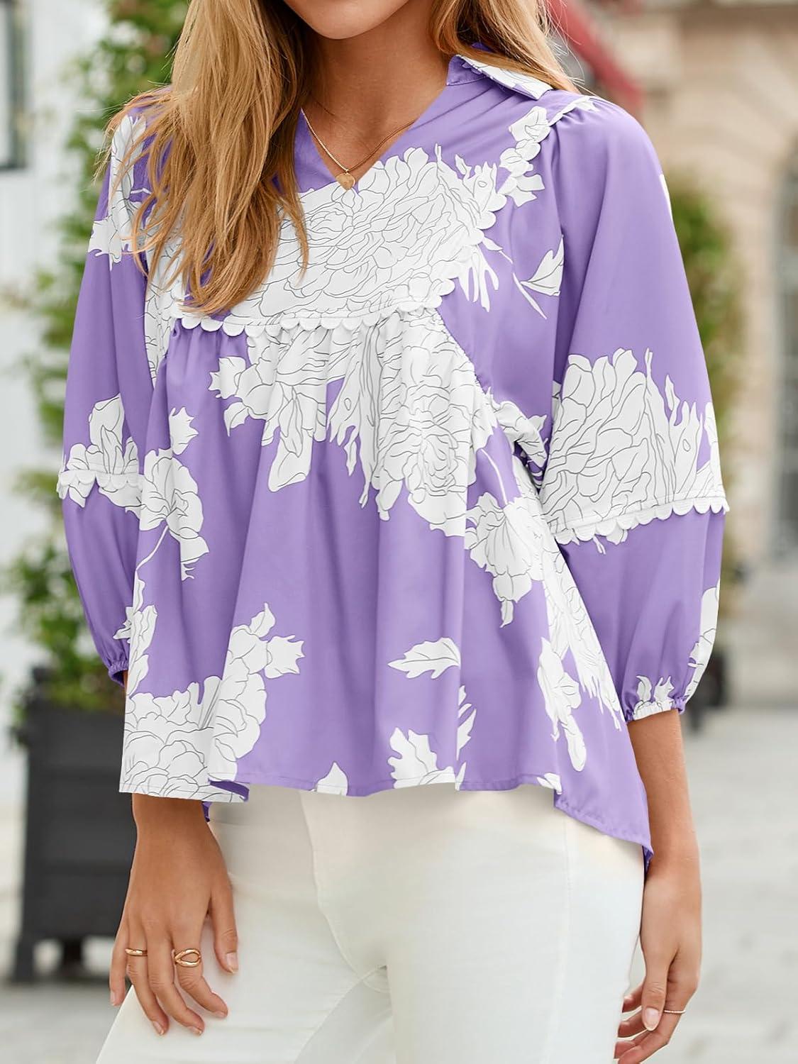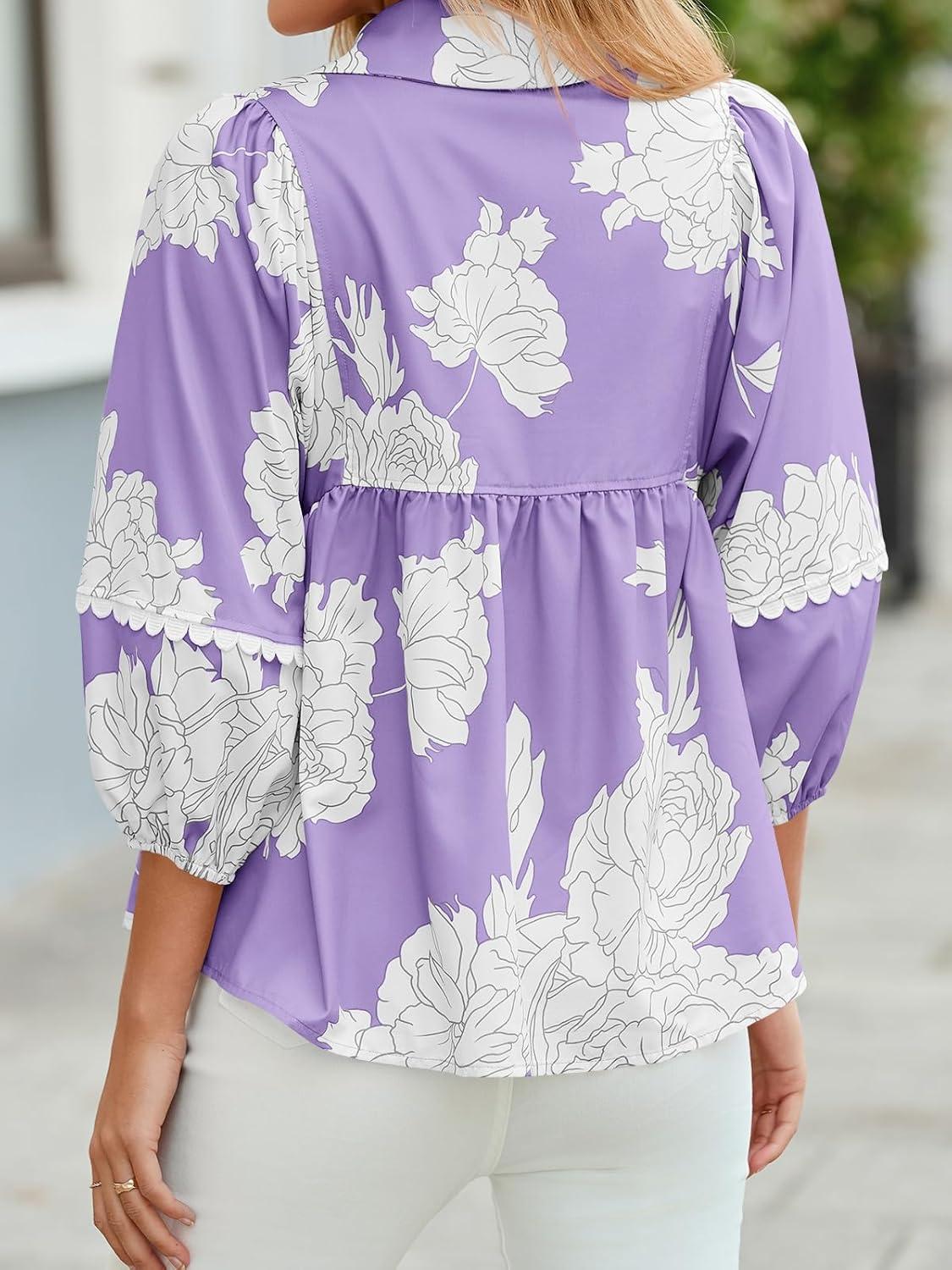 Tankaneo Womens Floral Peplum Babydoll Tops 3/4 Puff Sleeve Pleated Blouse Cute Casual V Neck Loose Fit Flowy Boho Shirts(Purple)