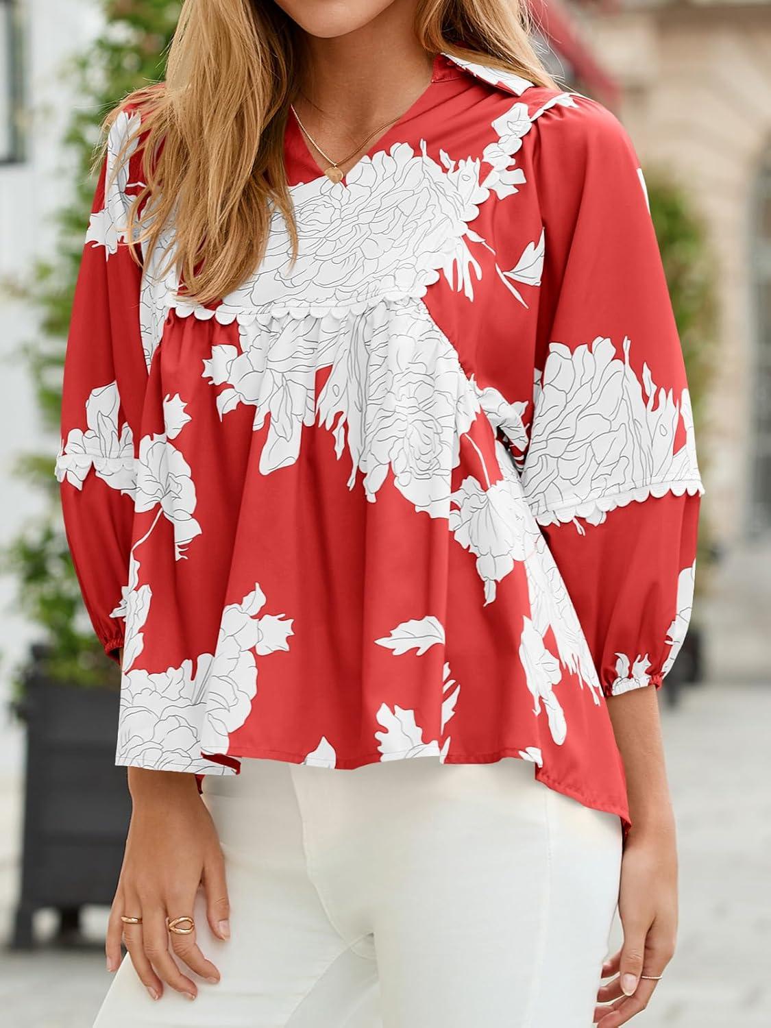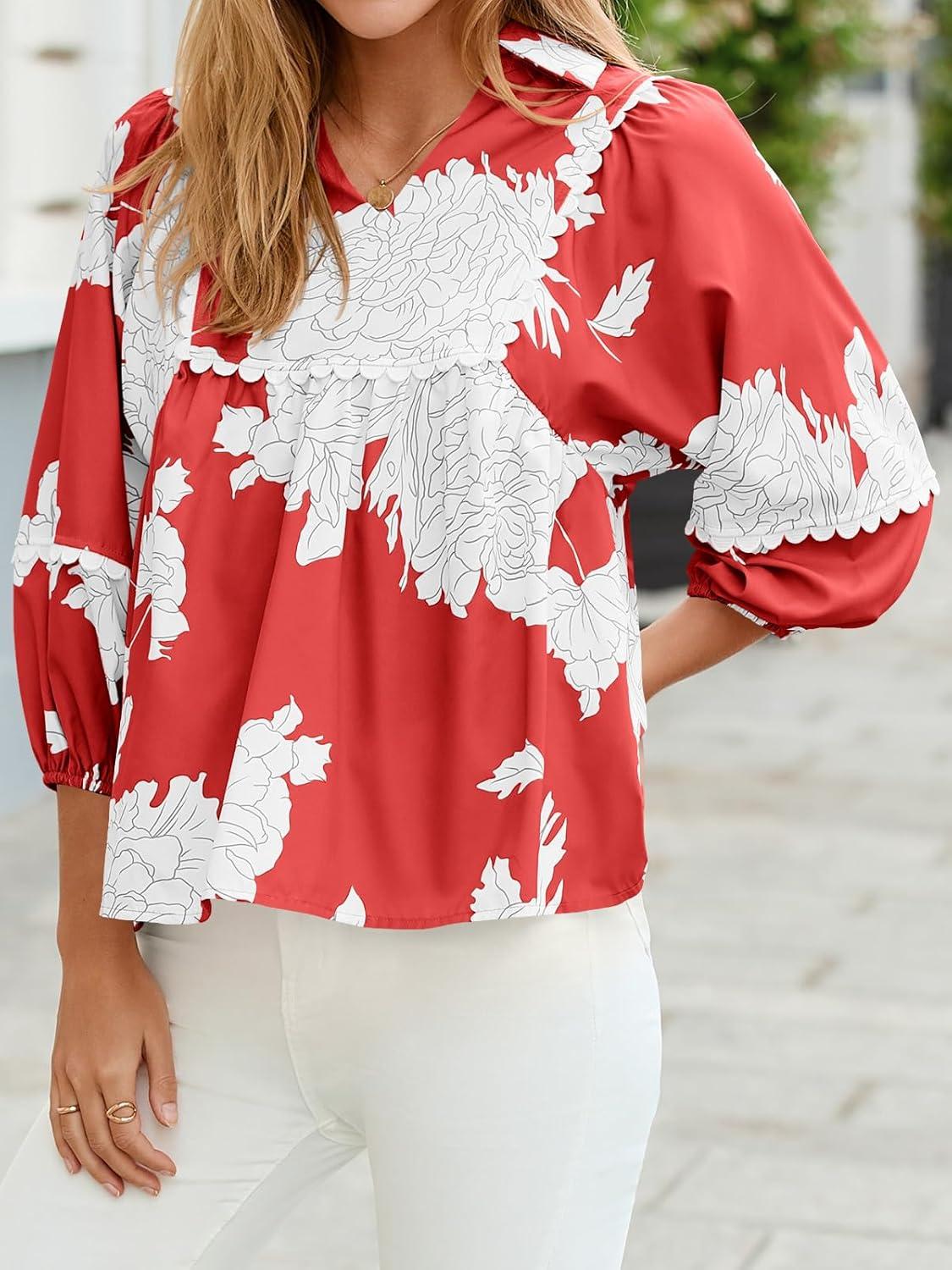Tankaneo Womens Floral Peplum Babydoll Tops 3/4 Puff Sleeve Pleated Blouse Cute Casual V Neck Loose Fit Flowy Boho Shirts(Red)