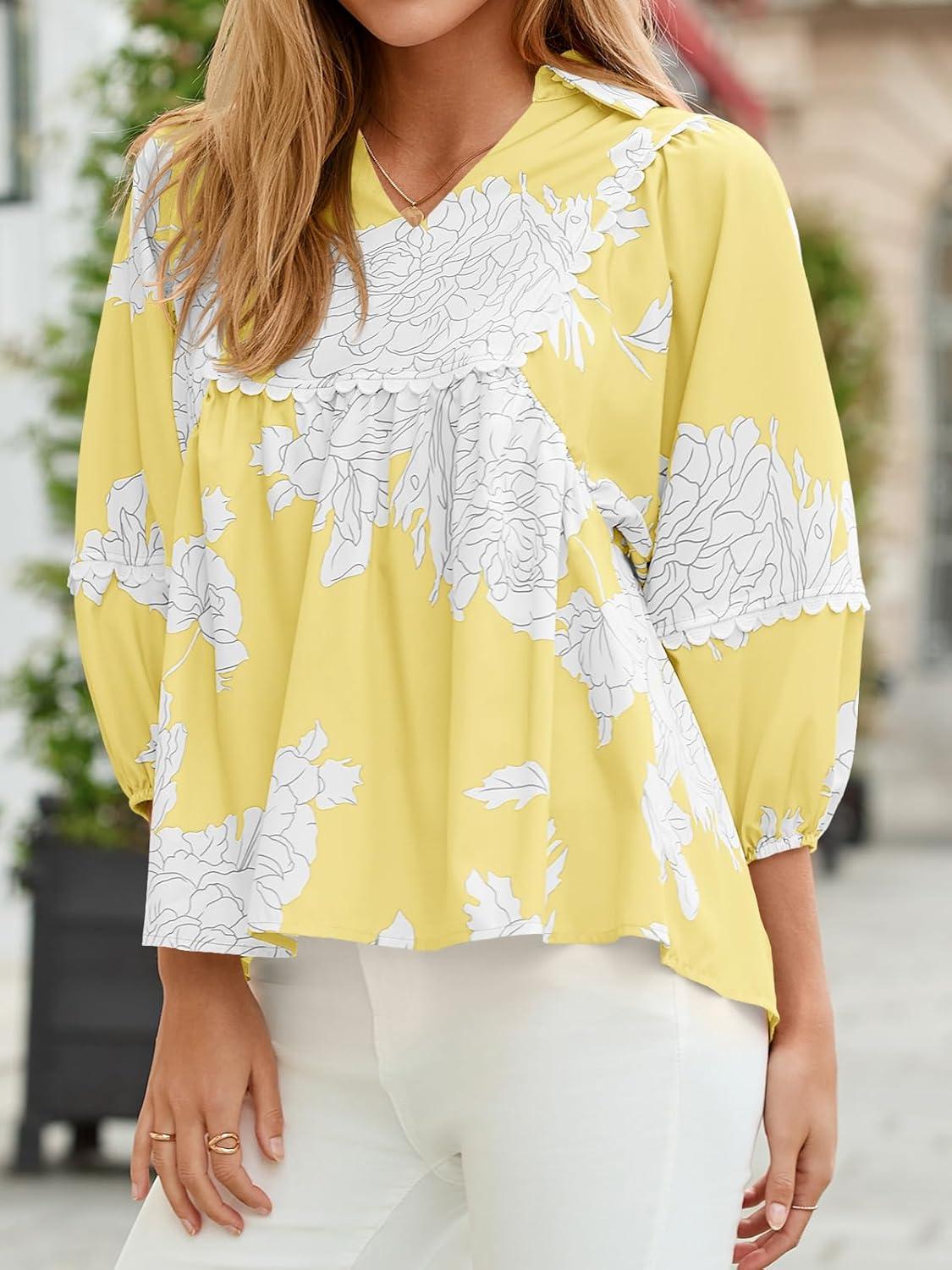 Tankaneo Womens Floral Peplum Babydoll Tops 3/4 Puff Sleeve Pleated Blouse Cute Casual V Neck Loose Fit Flowy Boho Shirts(Yellow)