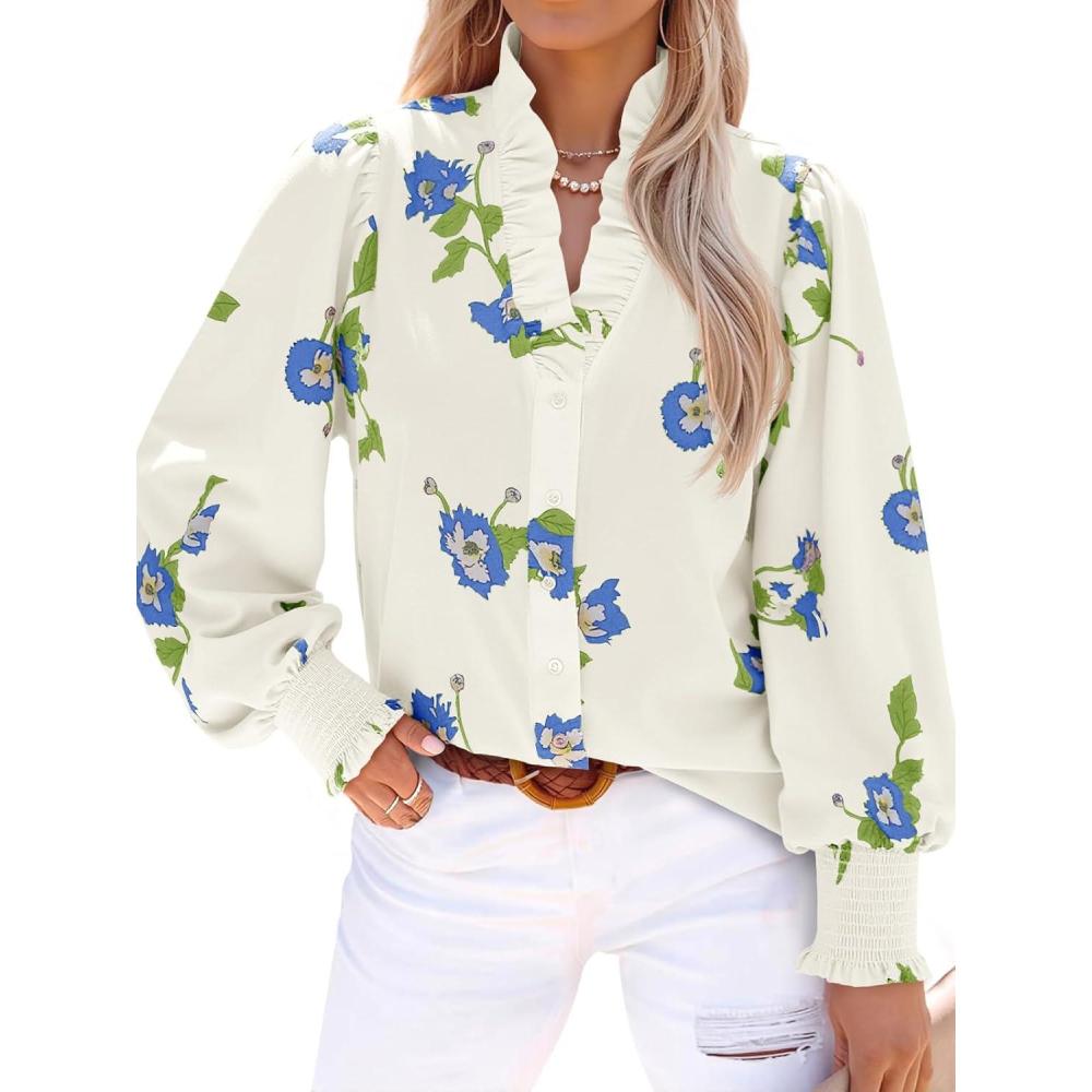 Tankaneo Womens Floral Ruffle Blouses Dressy Casual Long Puff Sleeve Boho Tops V Neck Button Down Shirts(White)