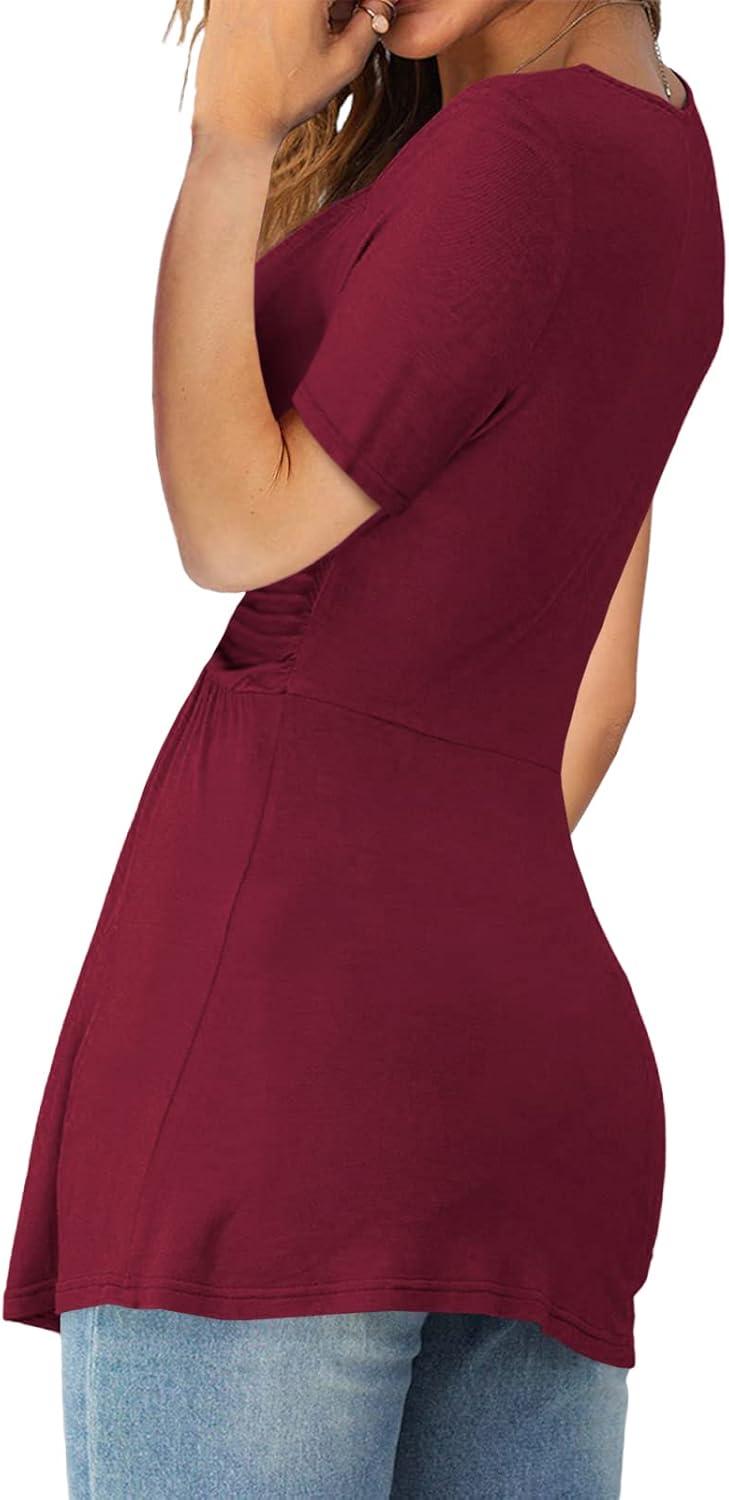 Tankaneo Womens Front Knotted V-Neck Blouse T Shirt Short Sleeve Oversized Tunic Tops Summer Solid Pullover Tees(B02-wine Red)