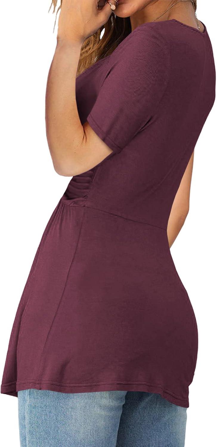 Tankaneo Womens Front Knotted V-Neck Blouse T Shirt Short Sleeve Oversized Tunic Tops Summer Solid Pullover Tees(B04-fuchsia)