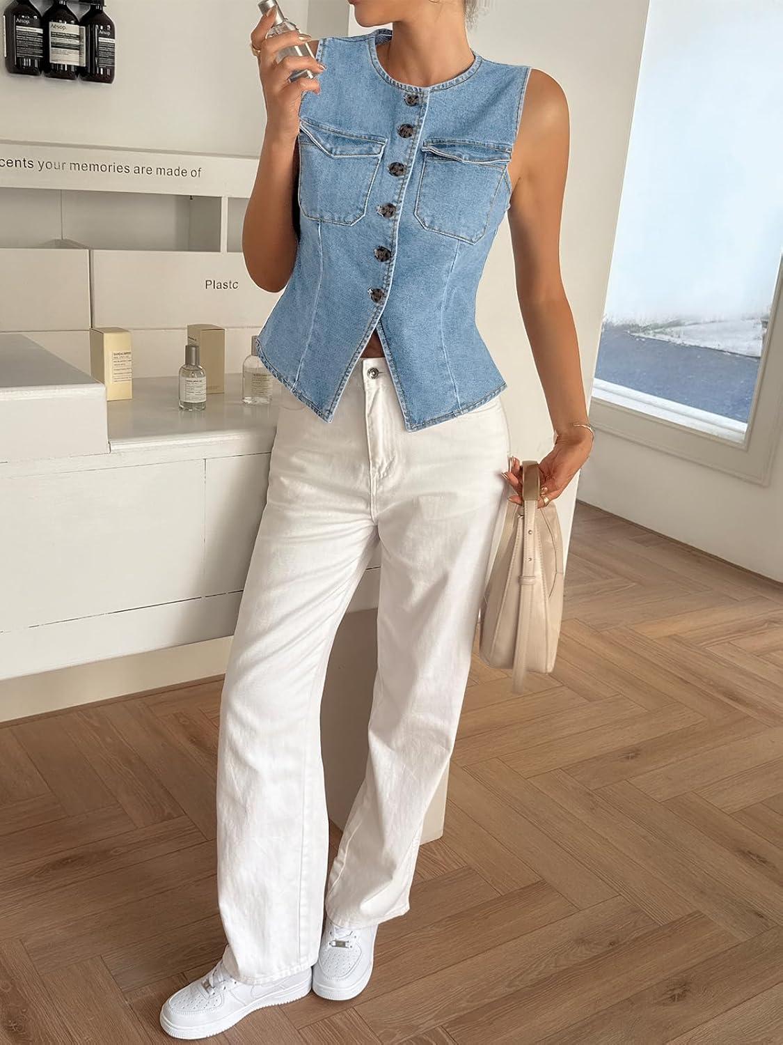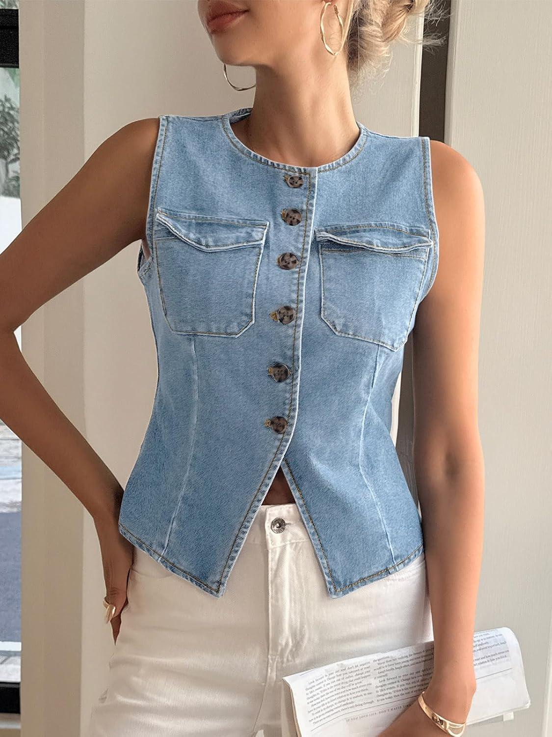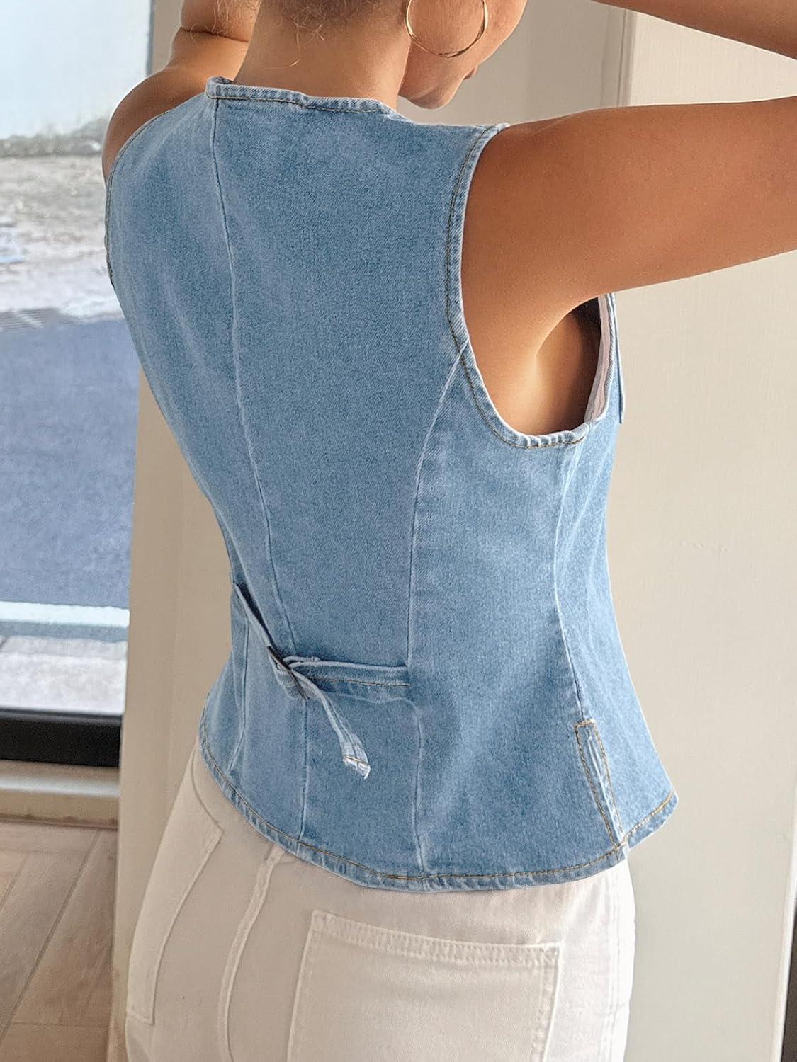 Tankaneo Womens Going Out Denim Vest Tops Trendy Cropped Sleeveless Button Down Fitted Jean Tank Tops Y2K Waistcoat(Light Blue)