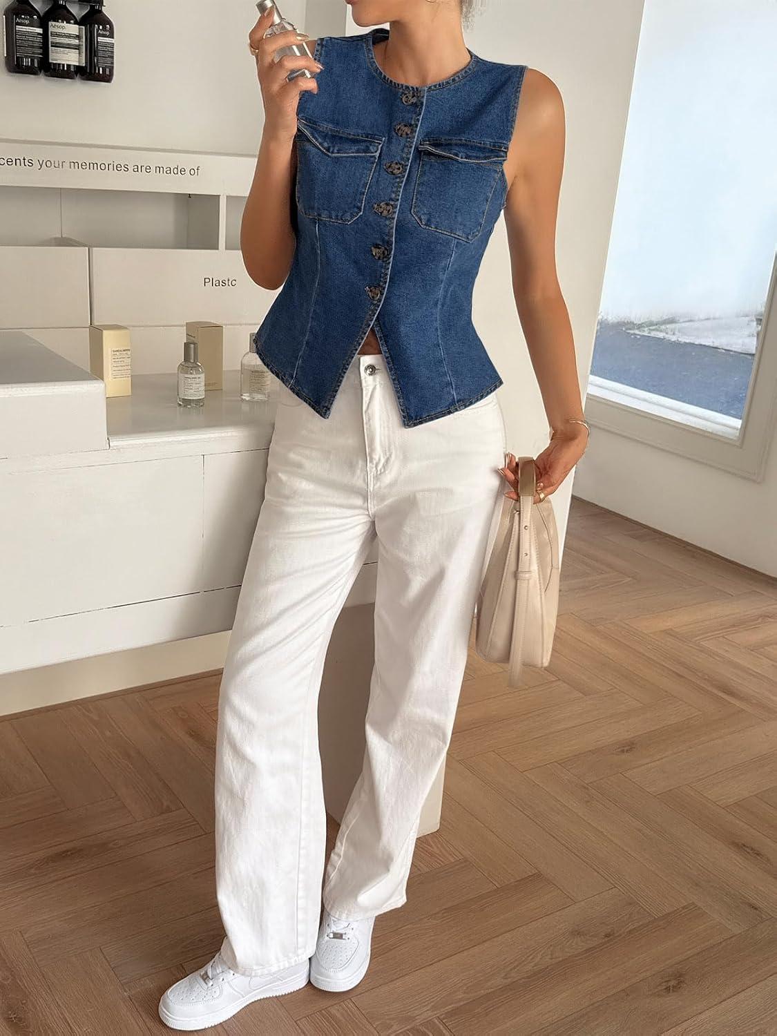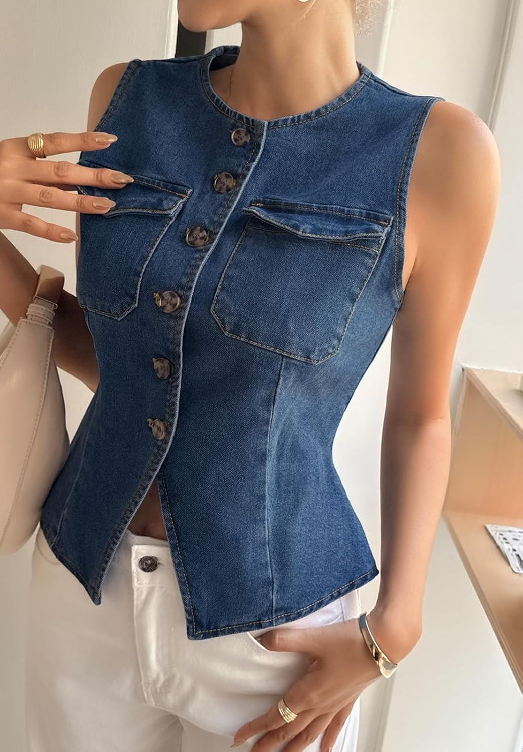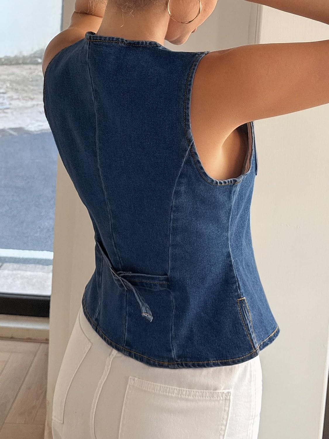 Tankaneo Womens Going Out Denim Vest Tops Trendy Cropped Sleeveless Button Down Fitted Jean Tank Tops Y2K Waistcoat(Navy)