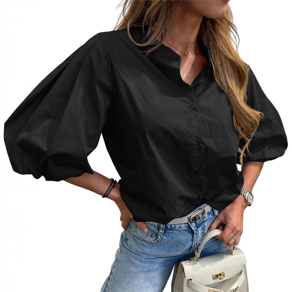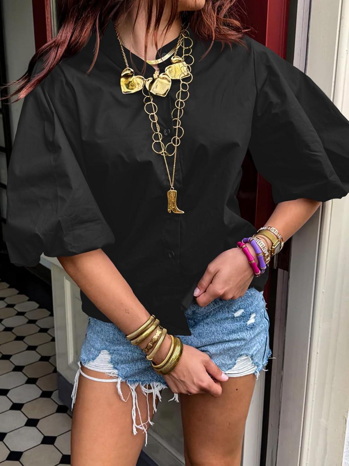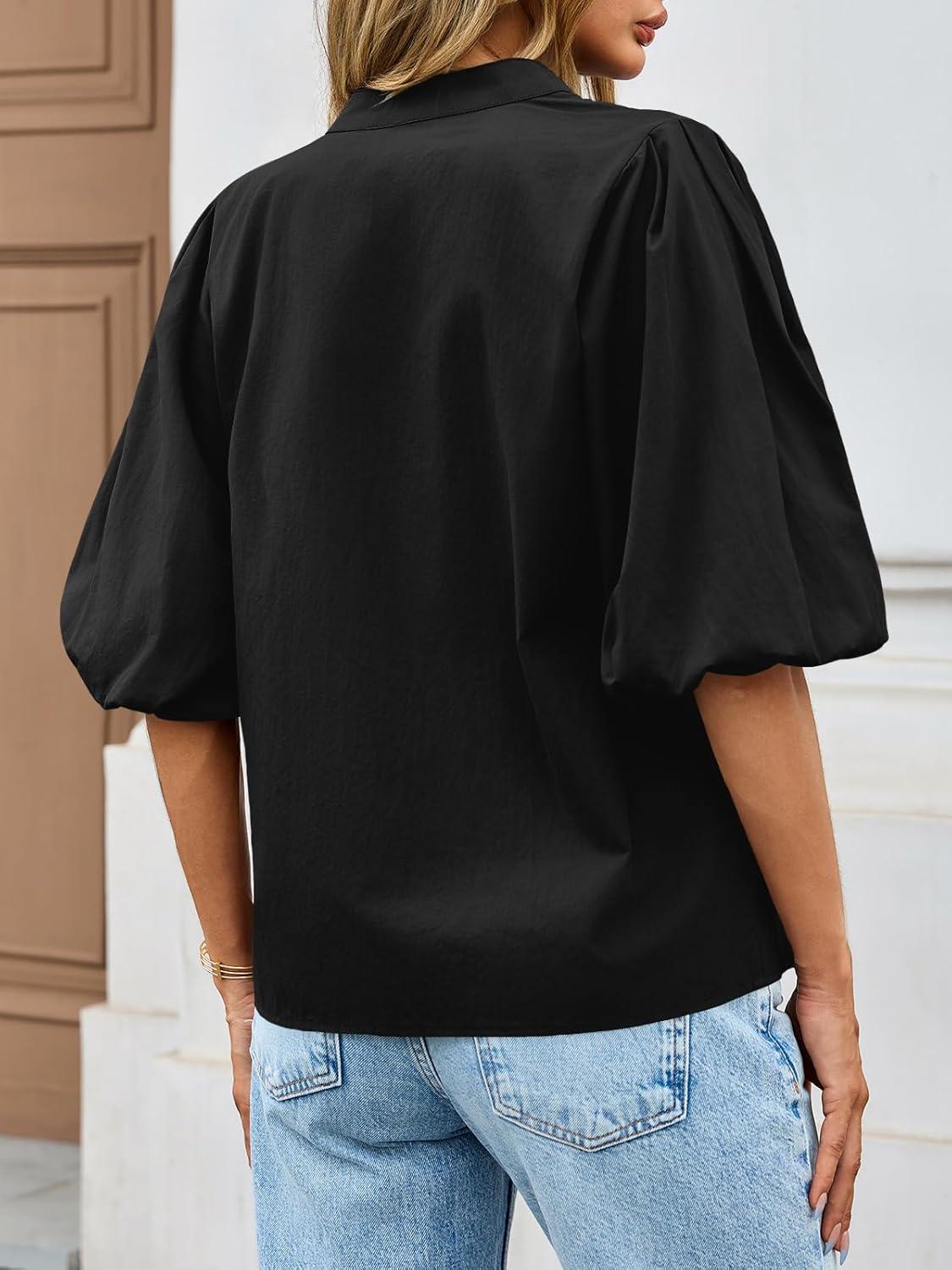 Tankaneo Womens Half Puff Sleeve Button Down Shirts Cotton Loose Fit Tops Summer Dressy Casual Blouses(Black)