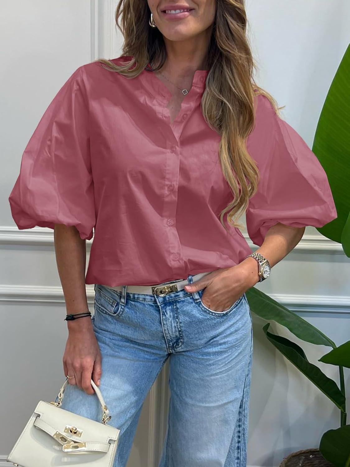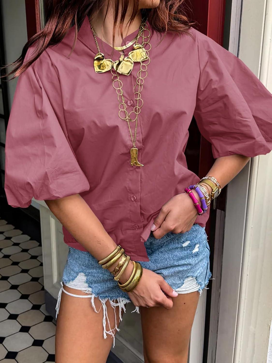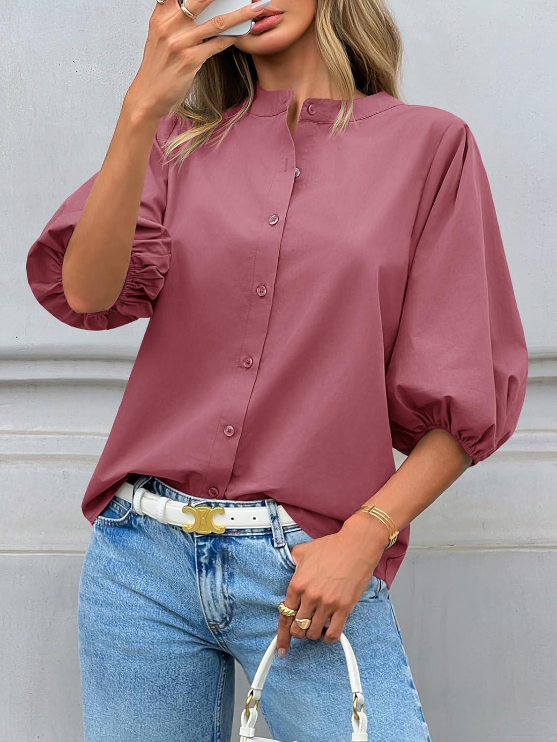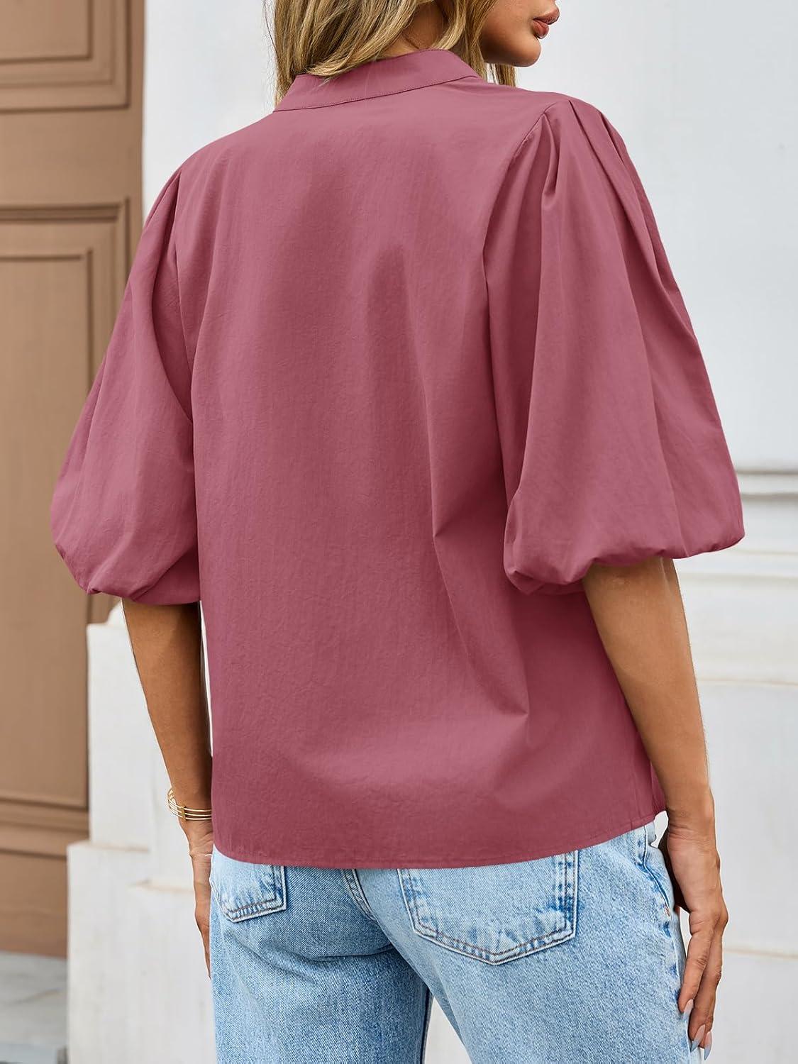Tankaneo Womens Half Puff Sleeve Button Down Shirts Cotton Loose Fit Tops Summer Dressy Casual Blouses(Brick Red)