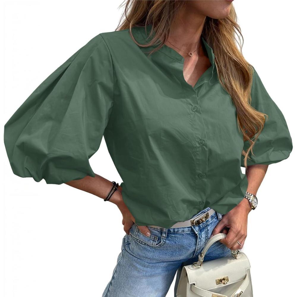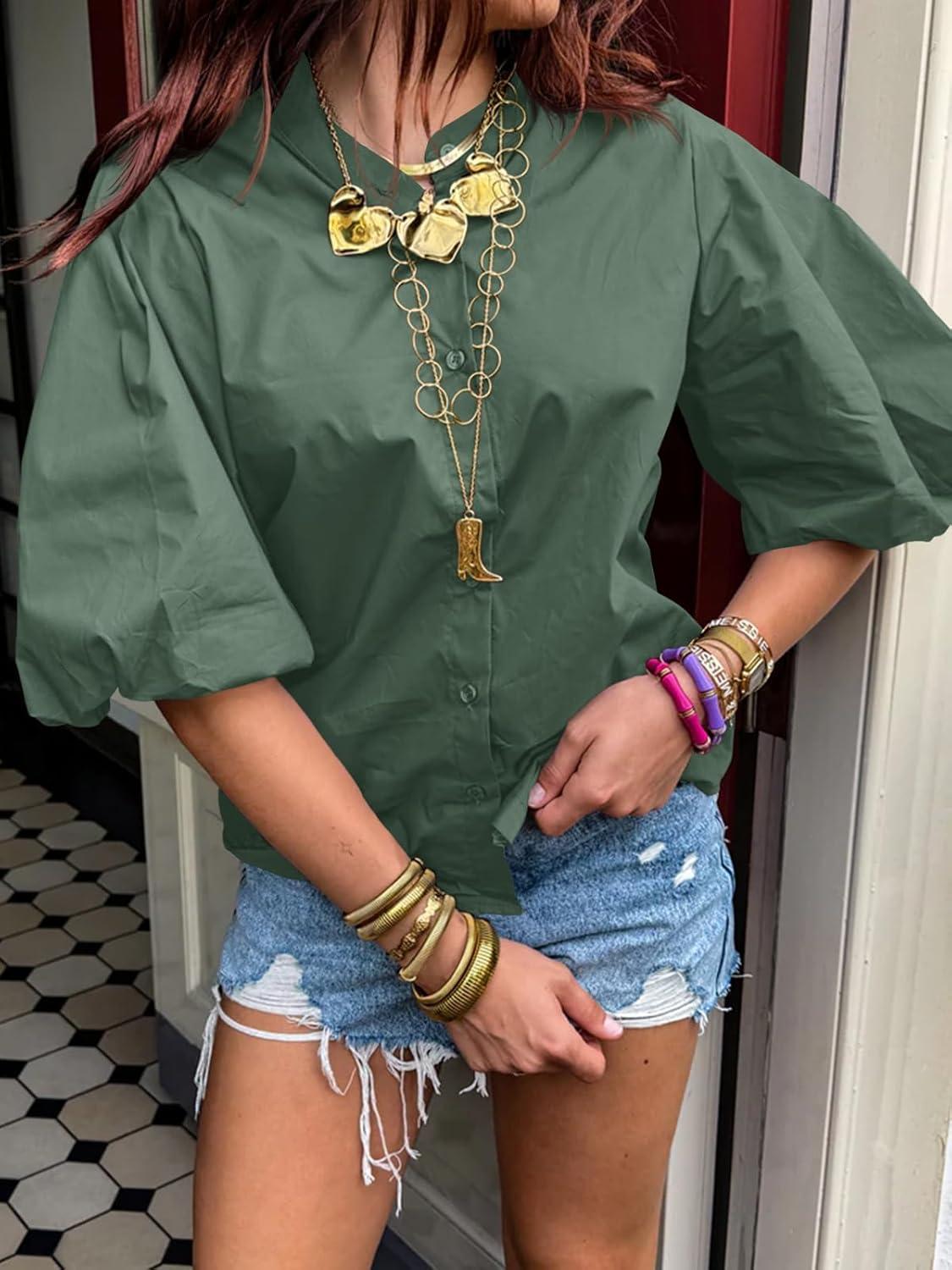 Tankaneo Womens Half Puff Sleeve Button Down Shirts Cotton Loose Fit Tops Summer Dressy Casual Blouses(Dark Green)
