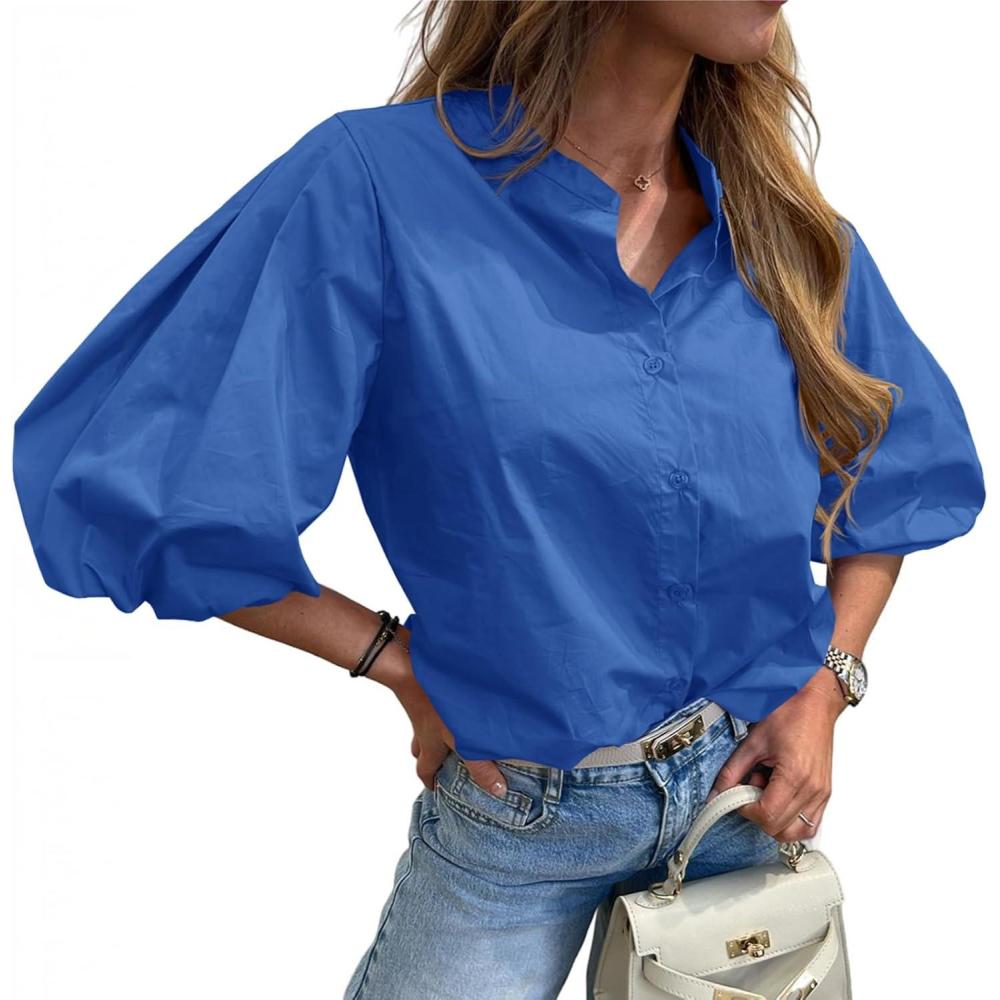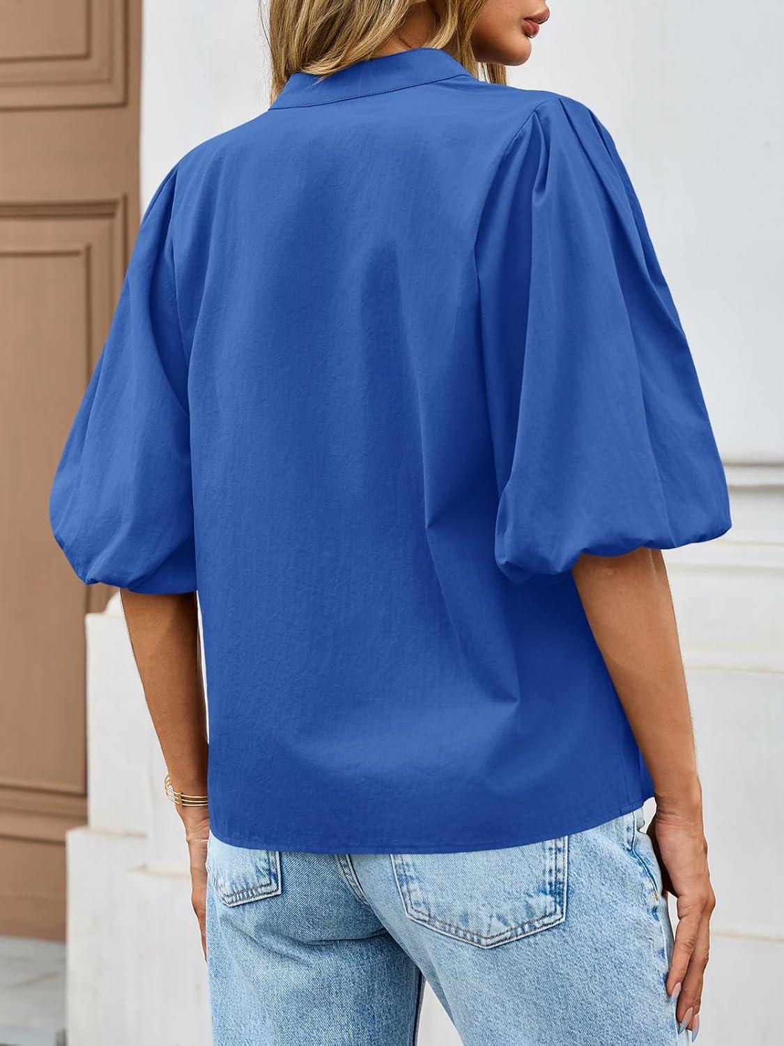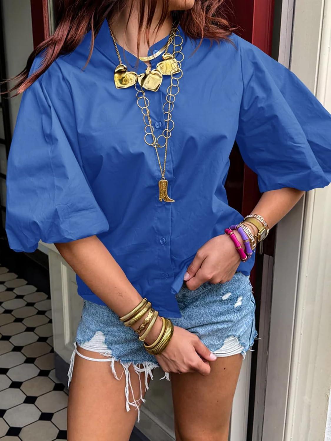 Tankaneo Womens Half Puff Sleeve Button Down Shirts Cotton Loose Fit Tops Summer Dressy Casual Blouses(Royal Blue)