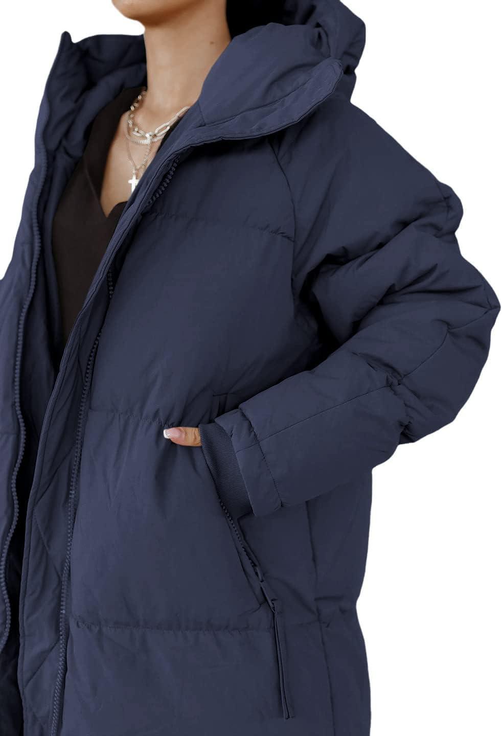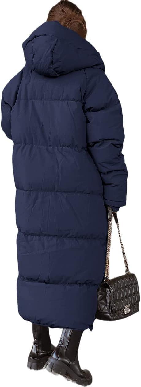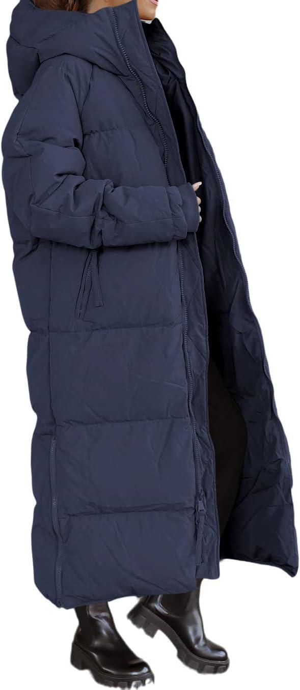 Tankaneo Womens Hooded Long Quilted Coat Maxi Length Long Sleeve Puffer Jacket Warm Padded Coat Thick Winter Outerwear(Navy)