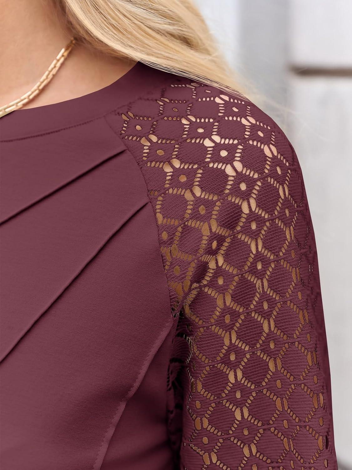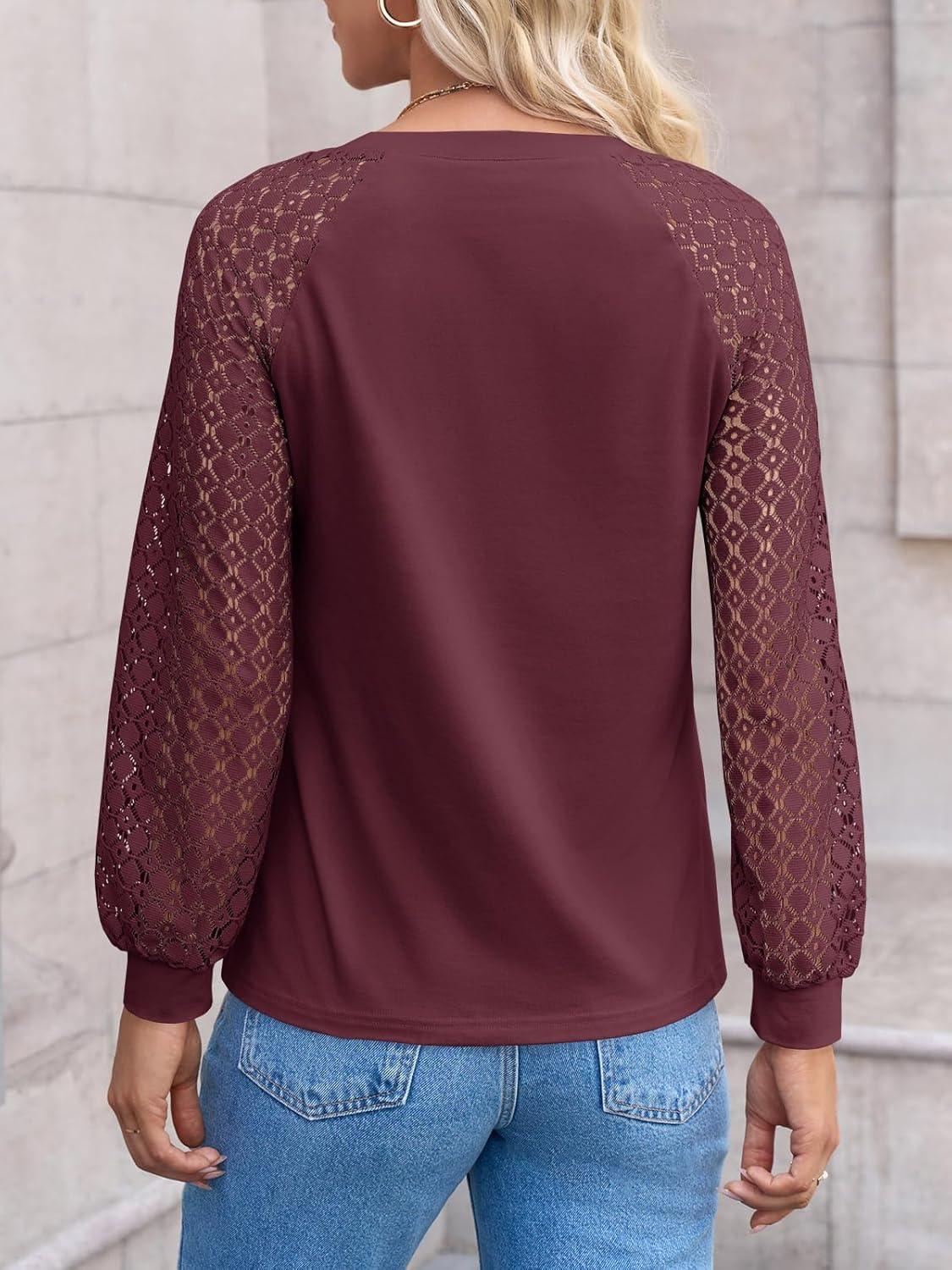 Tankaneo Womens Lace Puff Long Sleeve Tunic Tops Hollow Out Casual Dressy Work Blouse Loose Fit Crew Neck Seam Shirts(Burgundy)