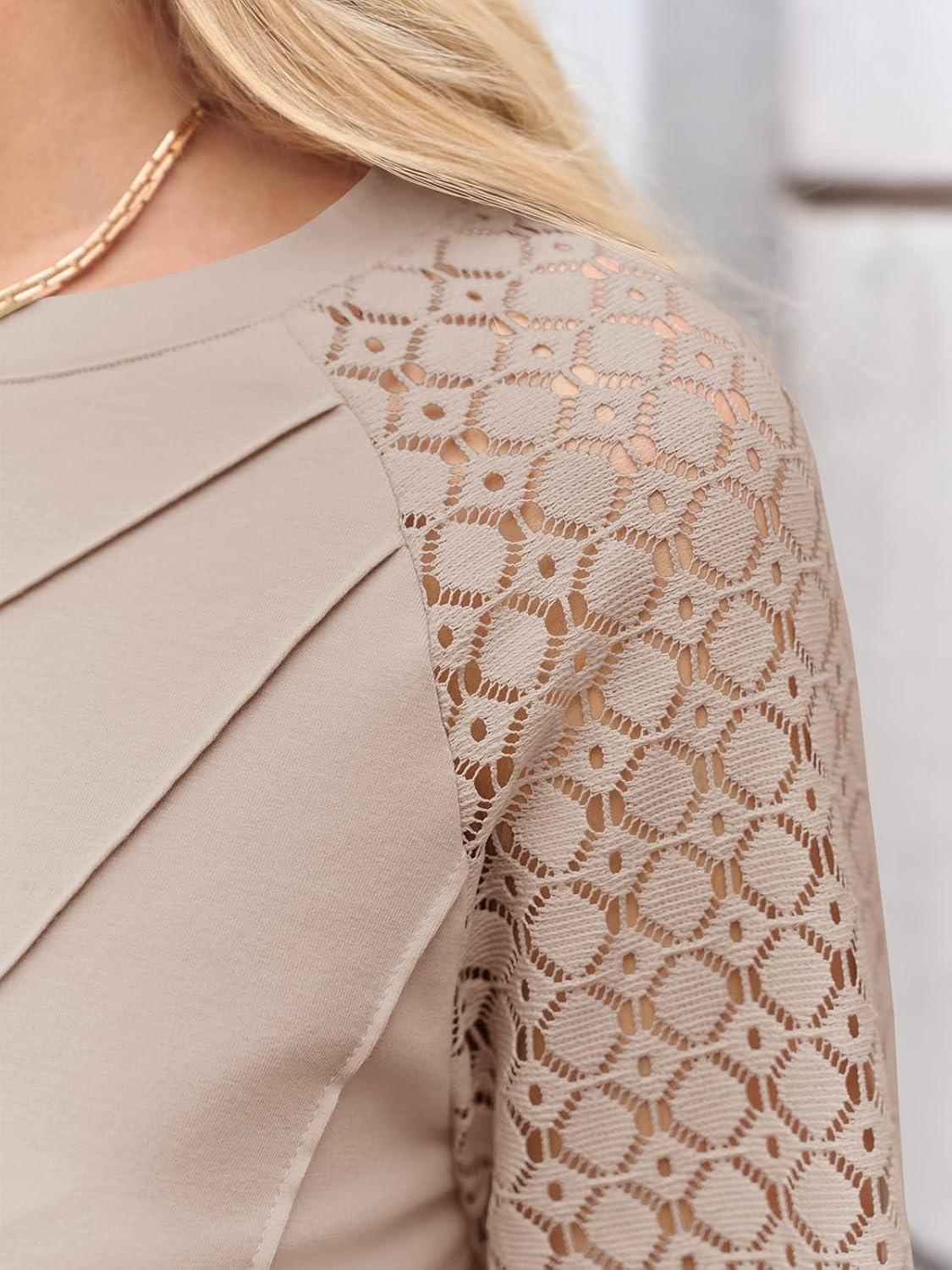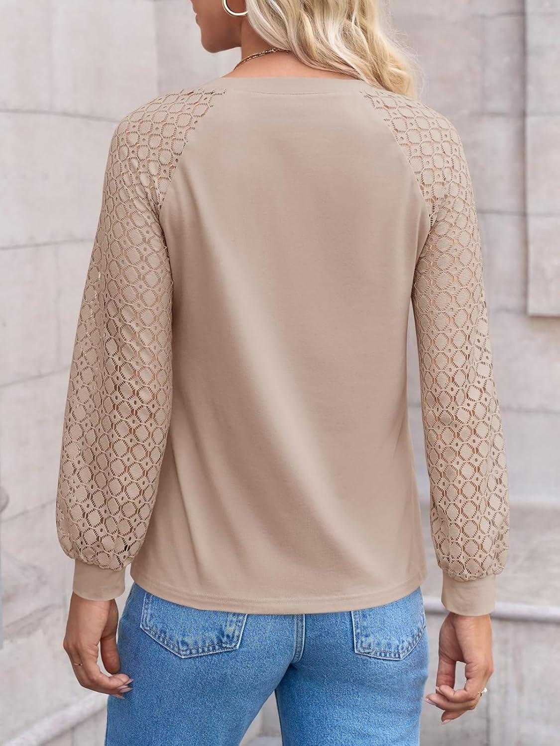 Tankaneo Womens Lace Puff Long Sleeve Tunic Tops Hollow Out Casual Dressy Work Blouse Loose Fit Crew Neck Seam Shirts(Light Khaki)