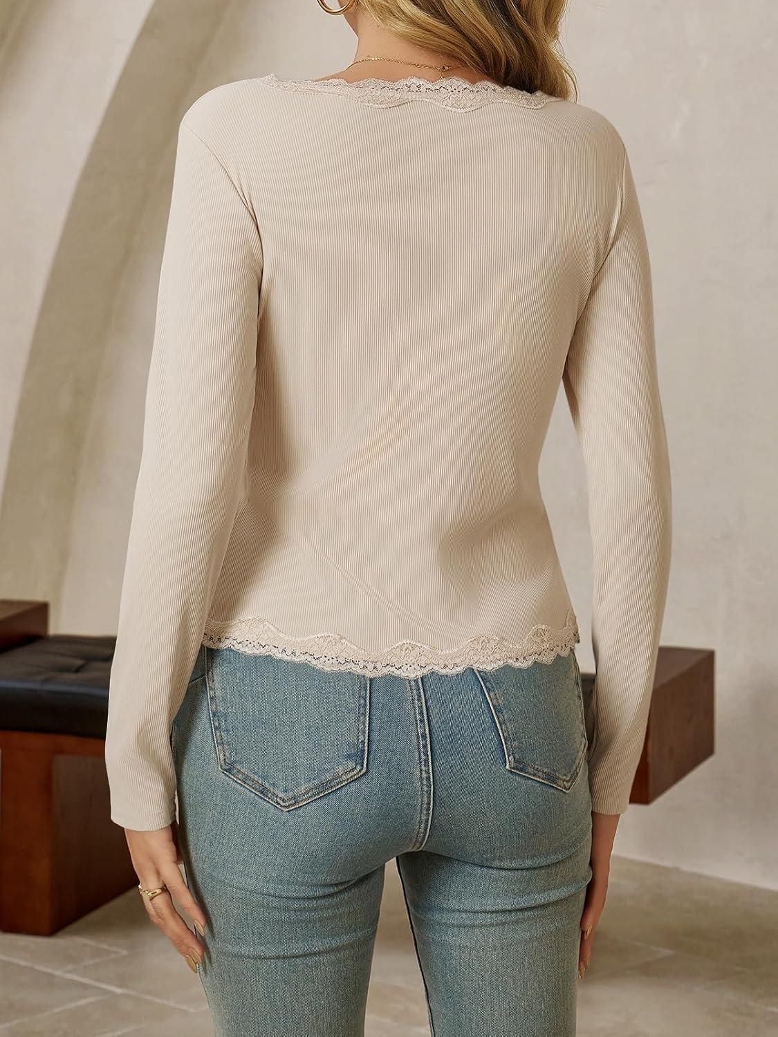 Tankaneo Womens Lace V Neck Shirts Long Sleeve Button Fitted Tops Fall Ribbed Knit Tees(Beige)