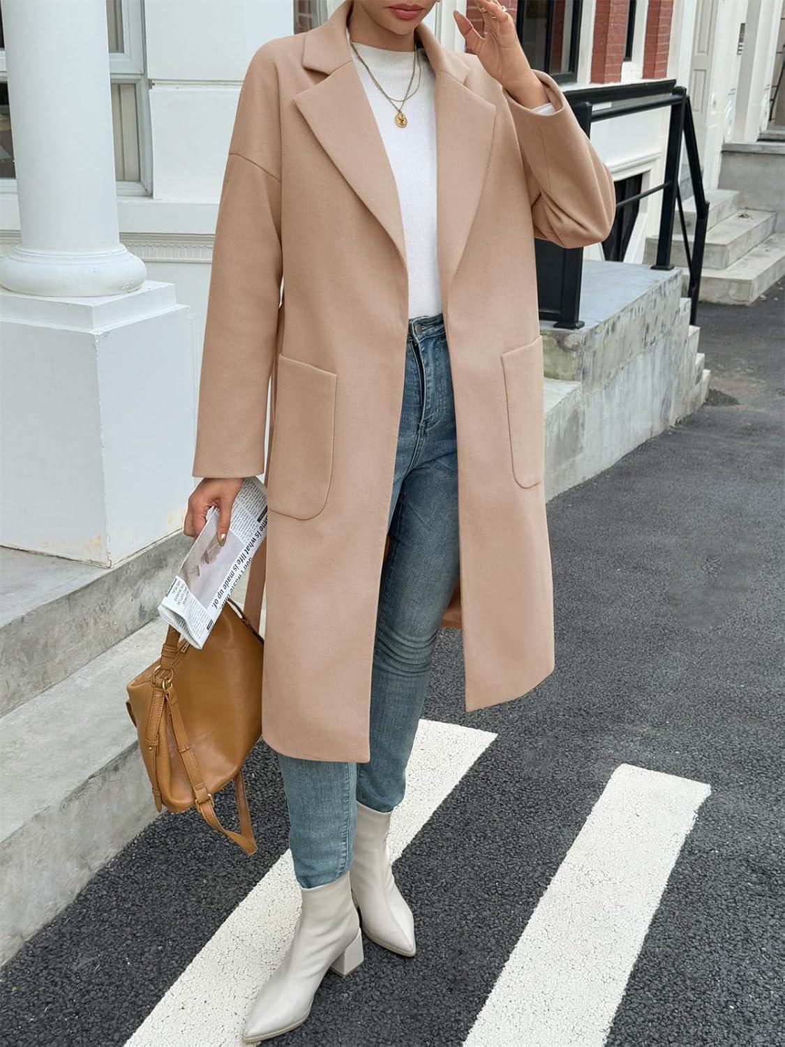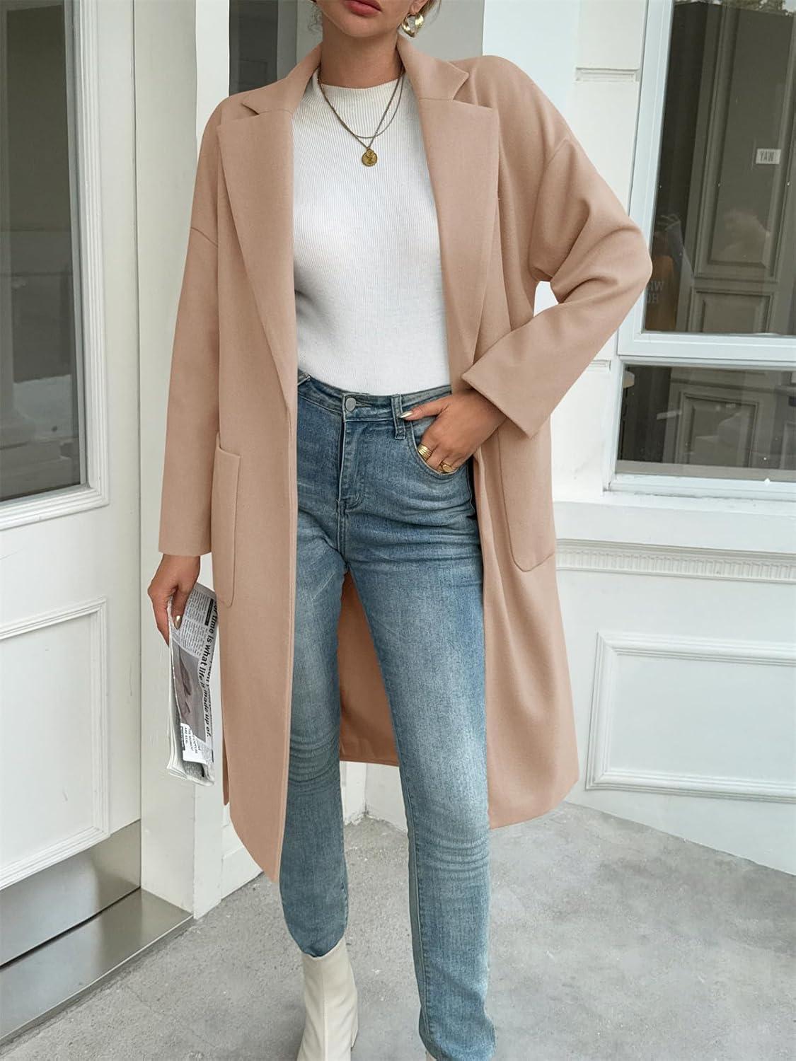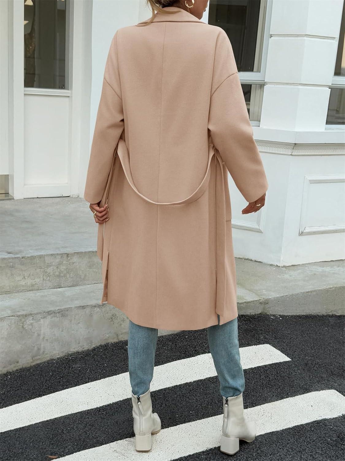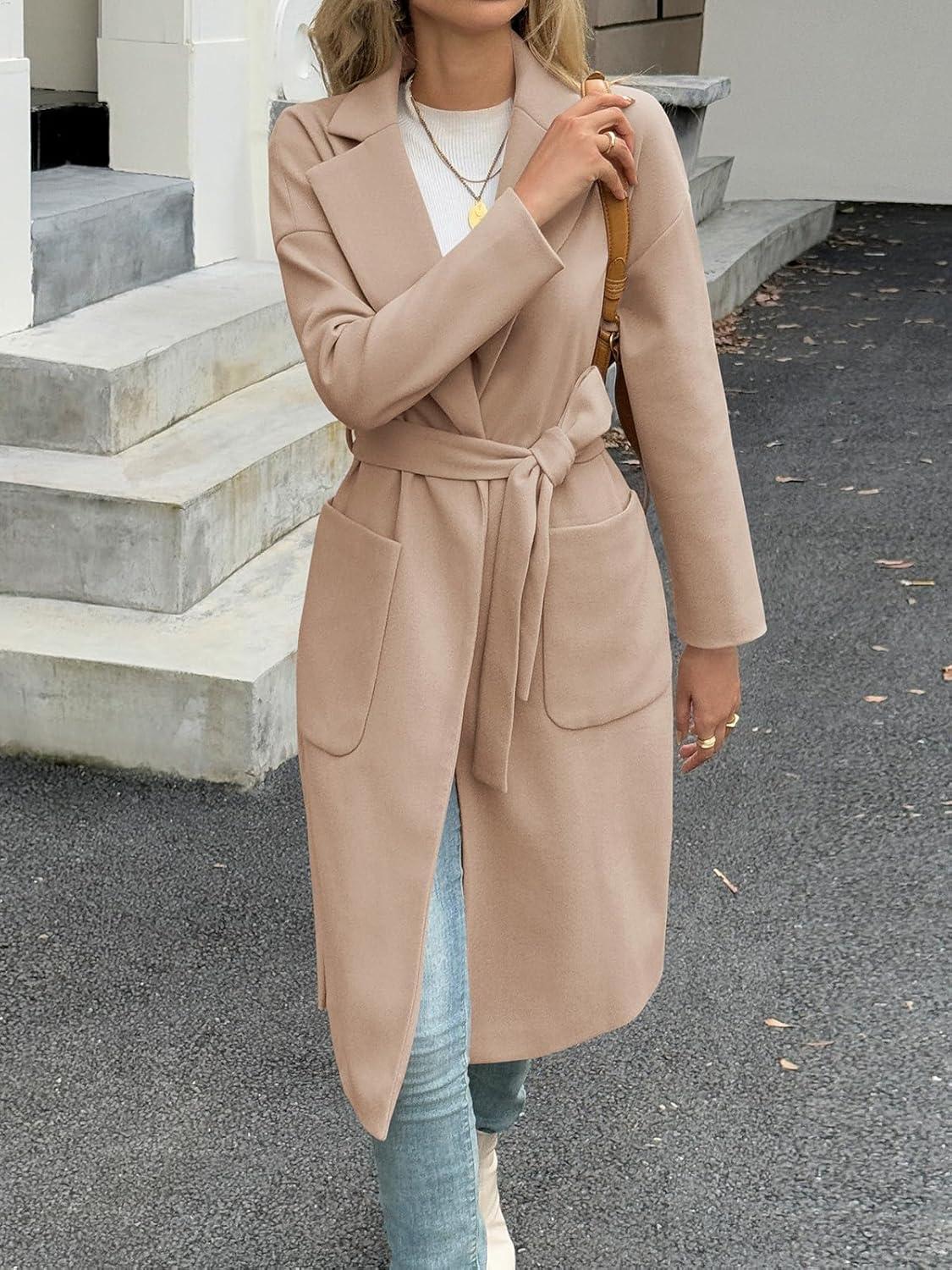 Tankaneo Womens Long Pea Coats Open Front Lapel Jackets Casual Belted Trench Coat Overcoats with Pockets(Khaki)