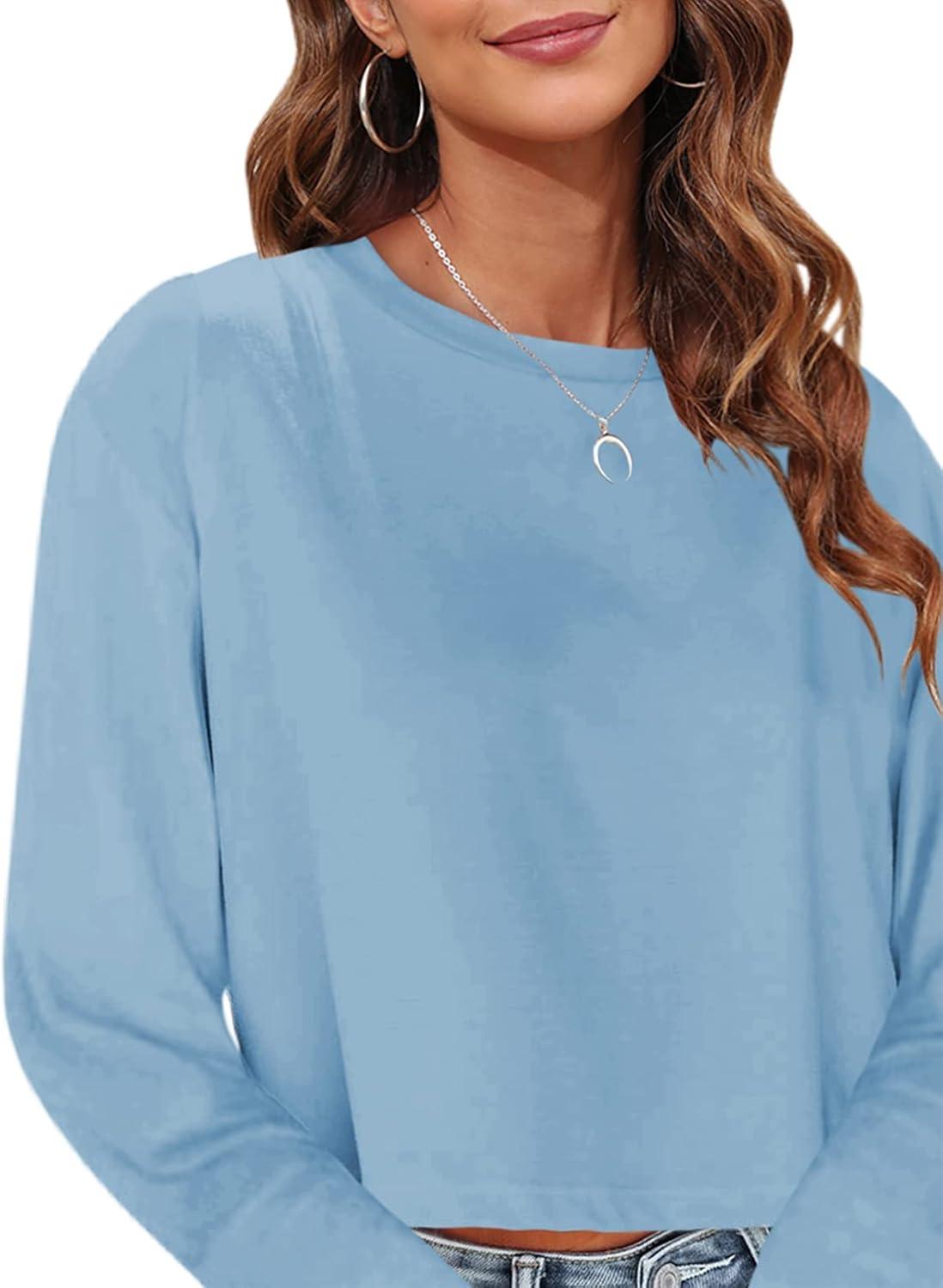 Tankaneo Womens Long Sleeve Crop Tops Loose Fit Fall Cropped Tshirt 2025 Crew Neck Casual Shirts(05-sky Blue)