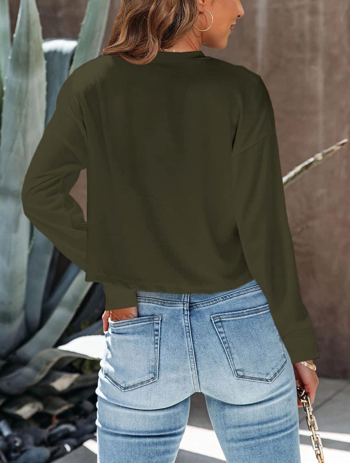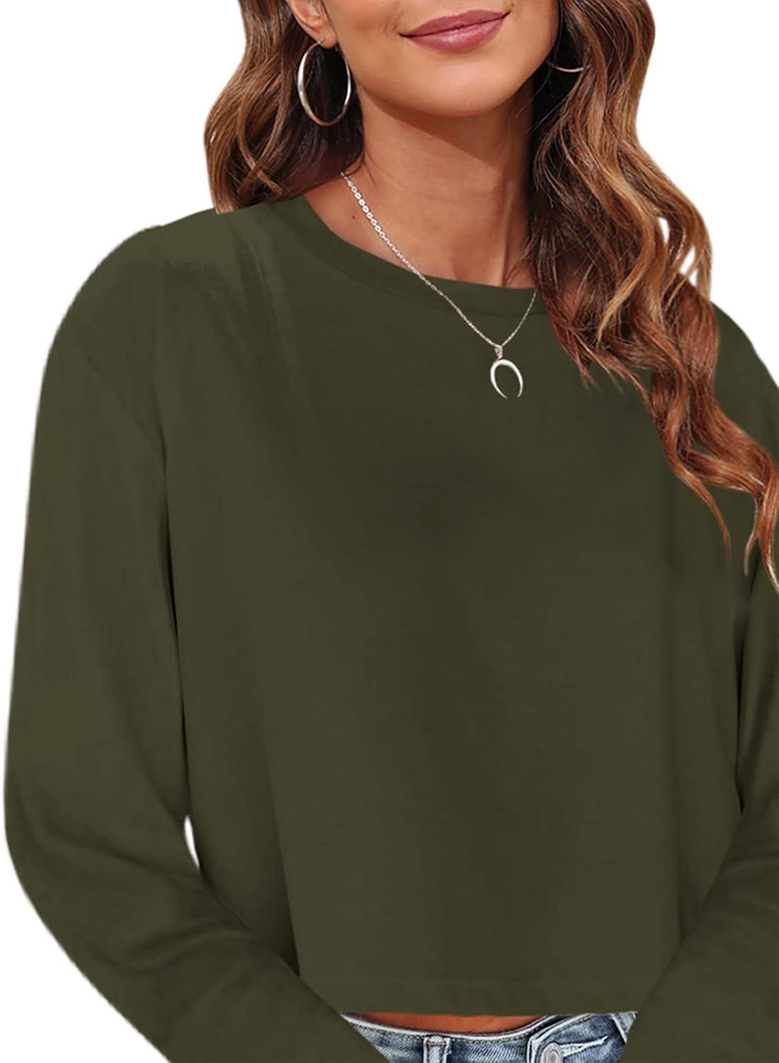 Tankaneo Womens Long Sleeve Crop Tops Loose Fit Fall Cropped Tshirt 2025 Crew Neck Casual Shirts(07-army Green)