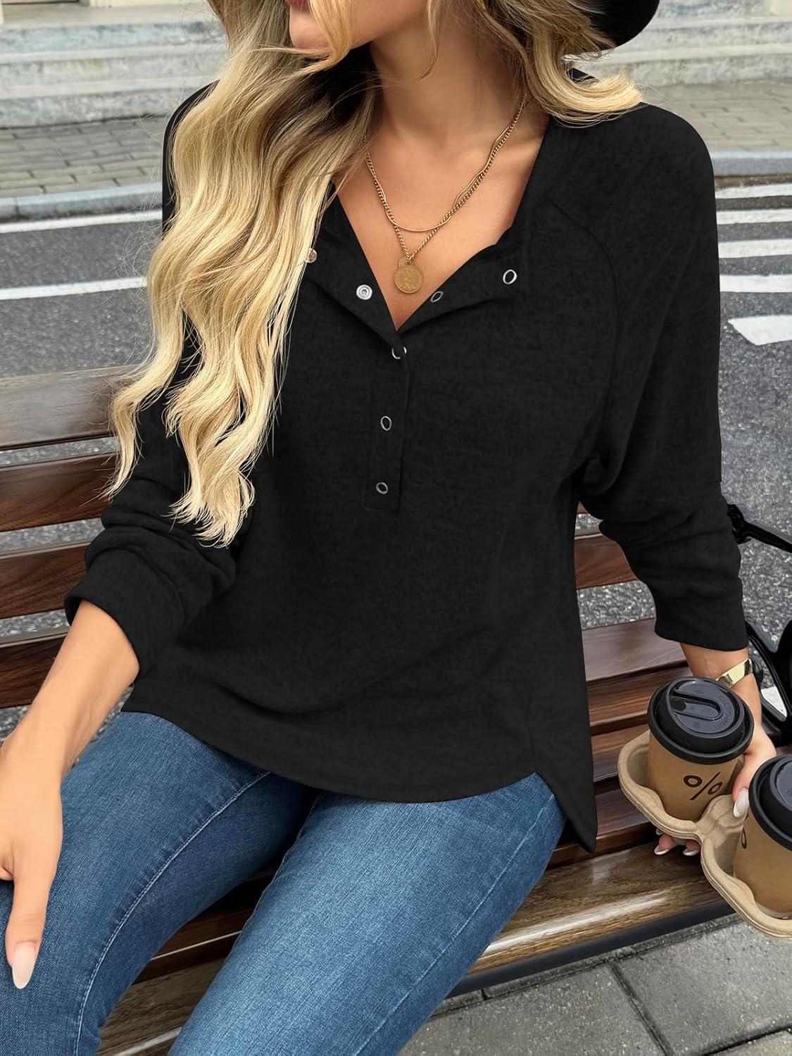 Tankaneo Womens Long Sleeve Henley Shirts Oversized Round Neck Sweatshirts Fall Tunic Tops Casual Loose Fit Tops(Black)