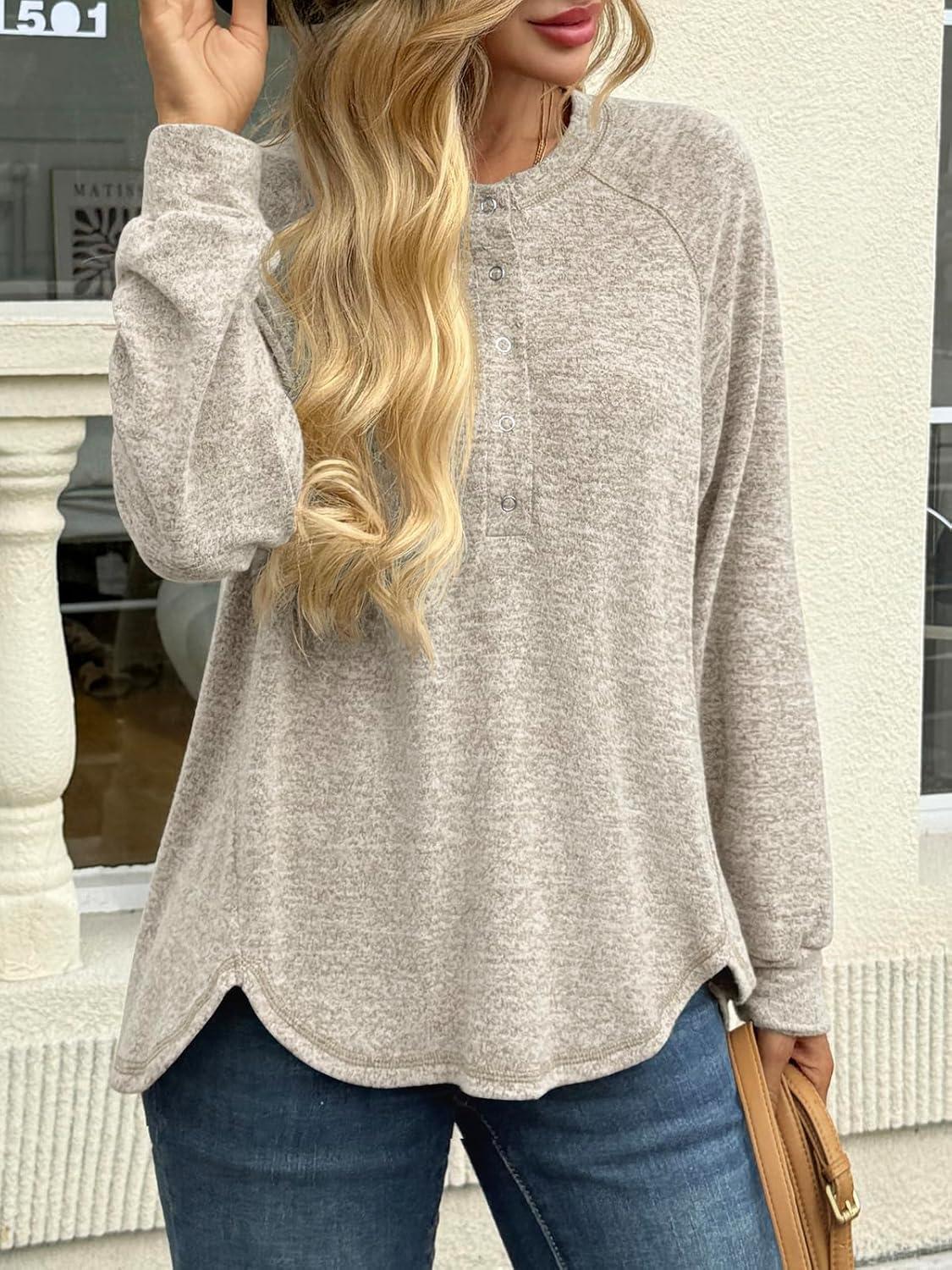 Tankaneo Womens Long Sleeve Henley Shirts Oversized Round Neck Sweatshirts Fall Tunic Tops Casual Loose Fit Tops(Khaki)