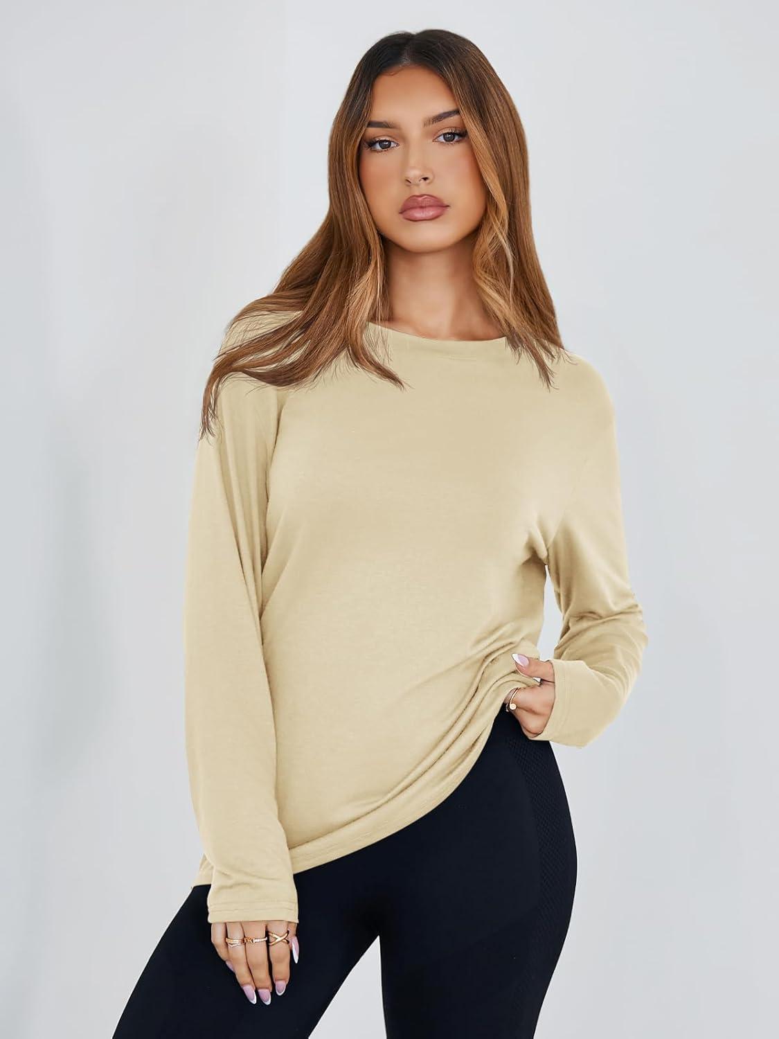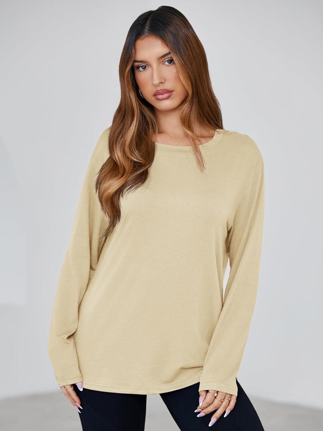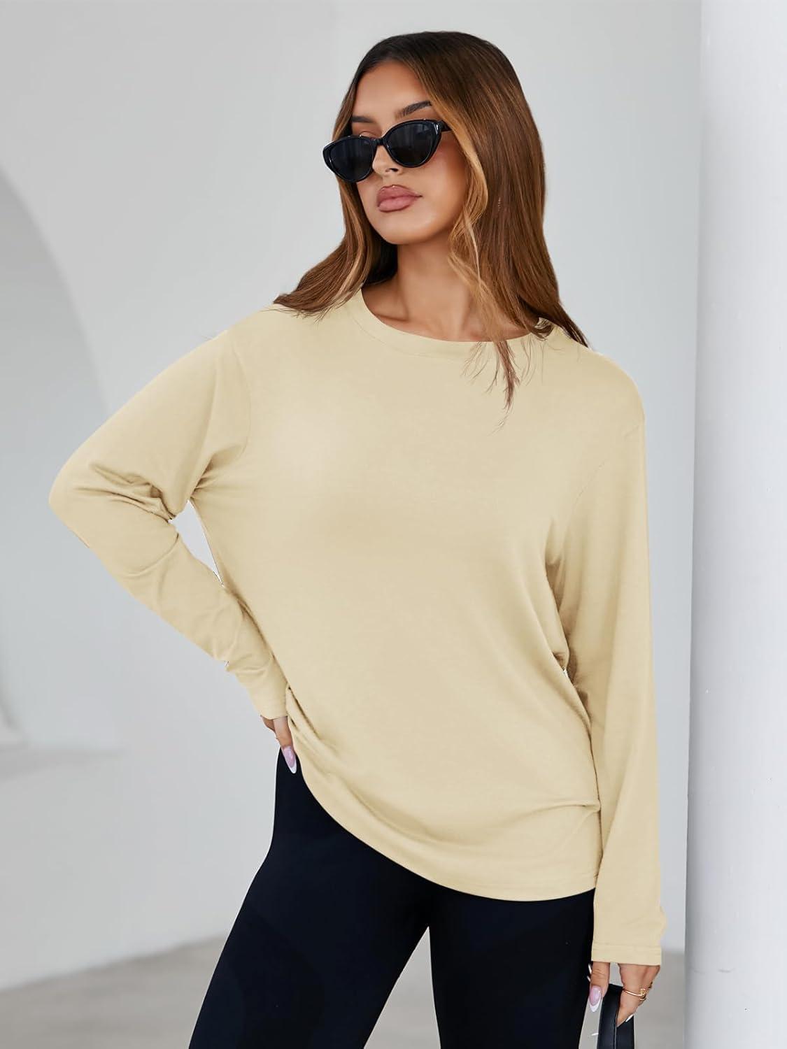 Tankaneo Womens Long Sleeve Oversized T Shirts Basic Crewneck Workout Tee Tops 2025 Fall Loose Fit Casual Y2K Clothes(Apricot)