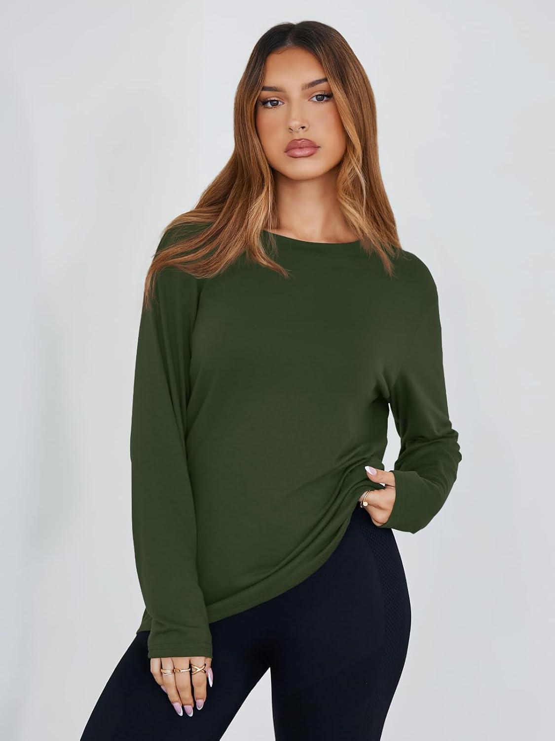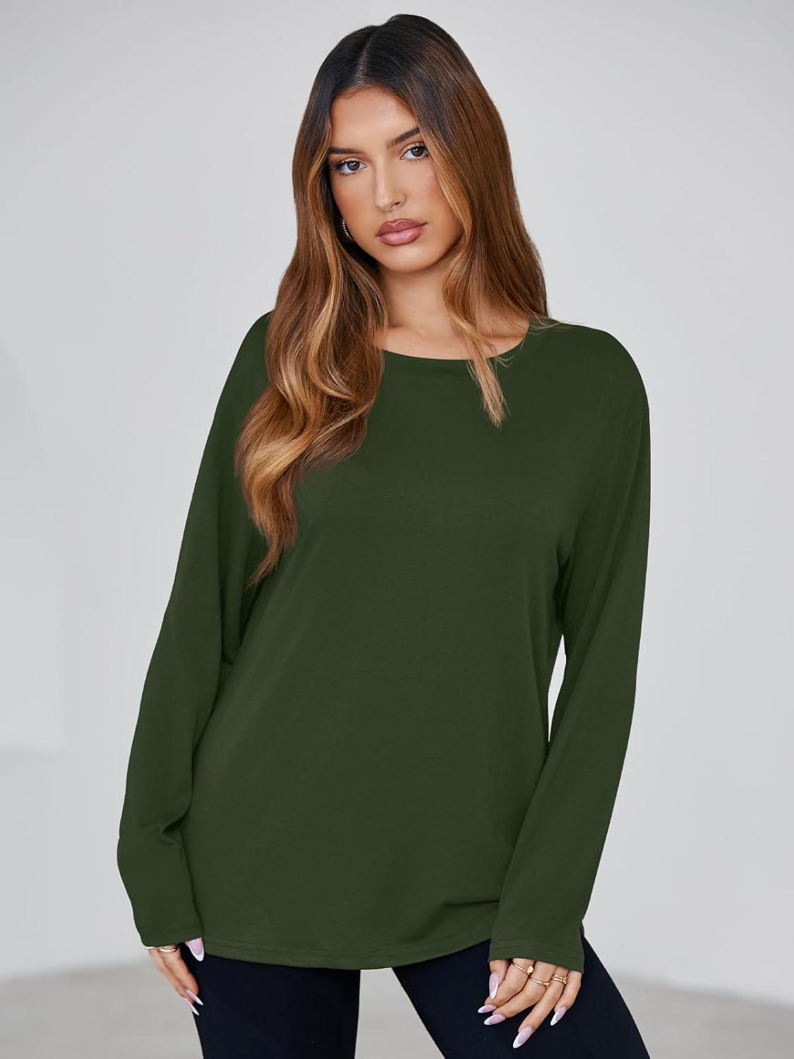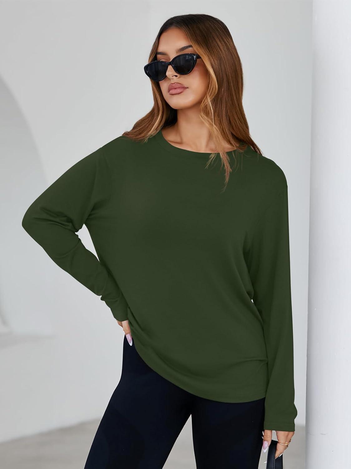 Tankaneo Womens Long Sleeve Oversized T Shirts Basic Crewneck Workout Tee Tops 2025 Fall Loose Fit Casual Y2K Clothes(Army Green)