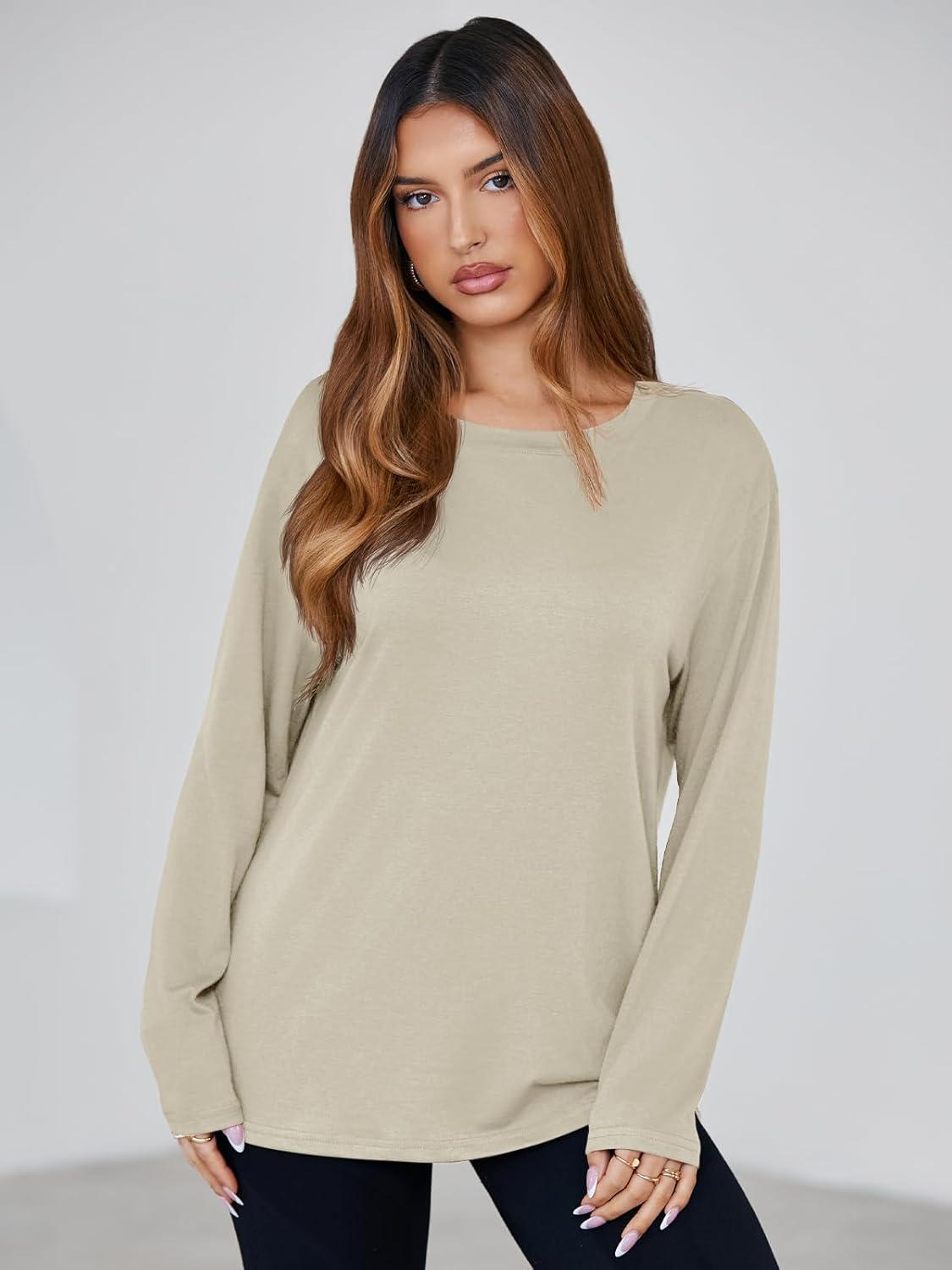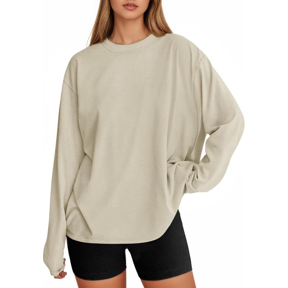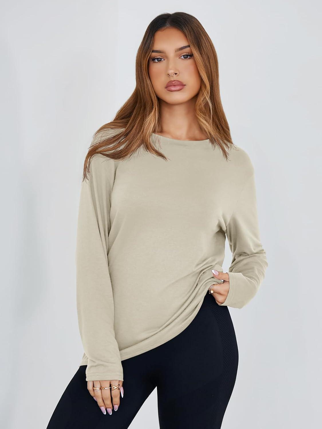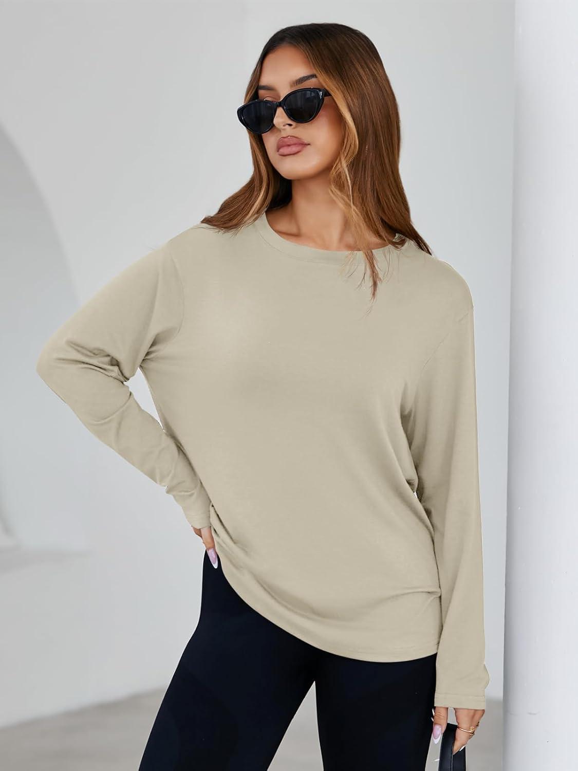 Tankaneo Womens Long Sleeve Oversized T Shirts Basic Crewneck Workout Tee Tops 2025 Fall Loose Fit Casual Y2K Clothes(Beige)