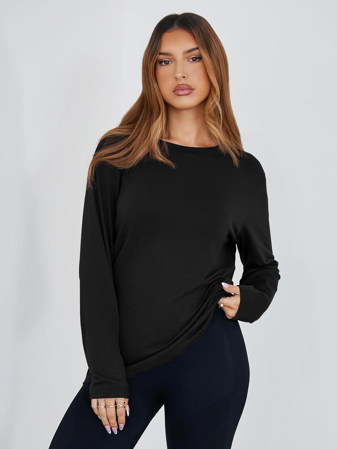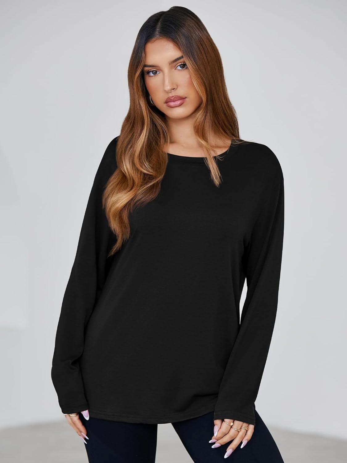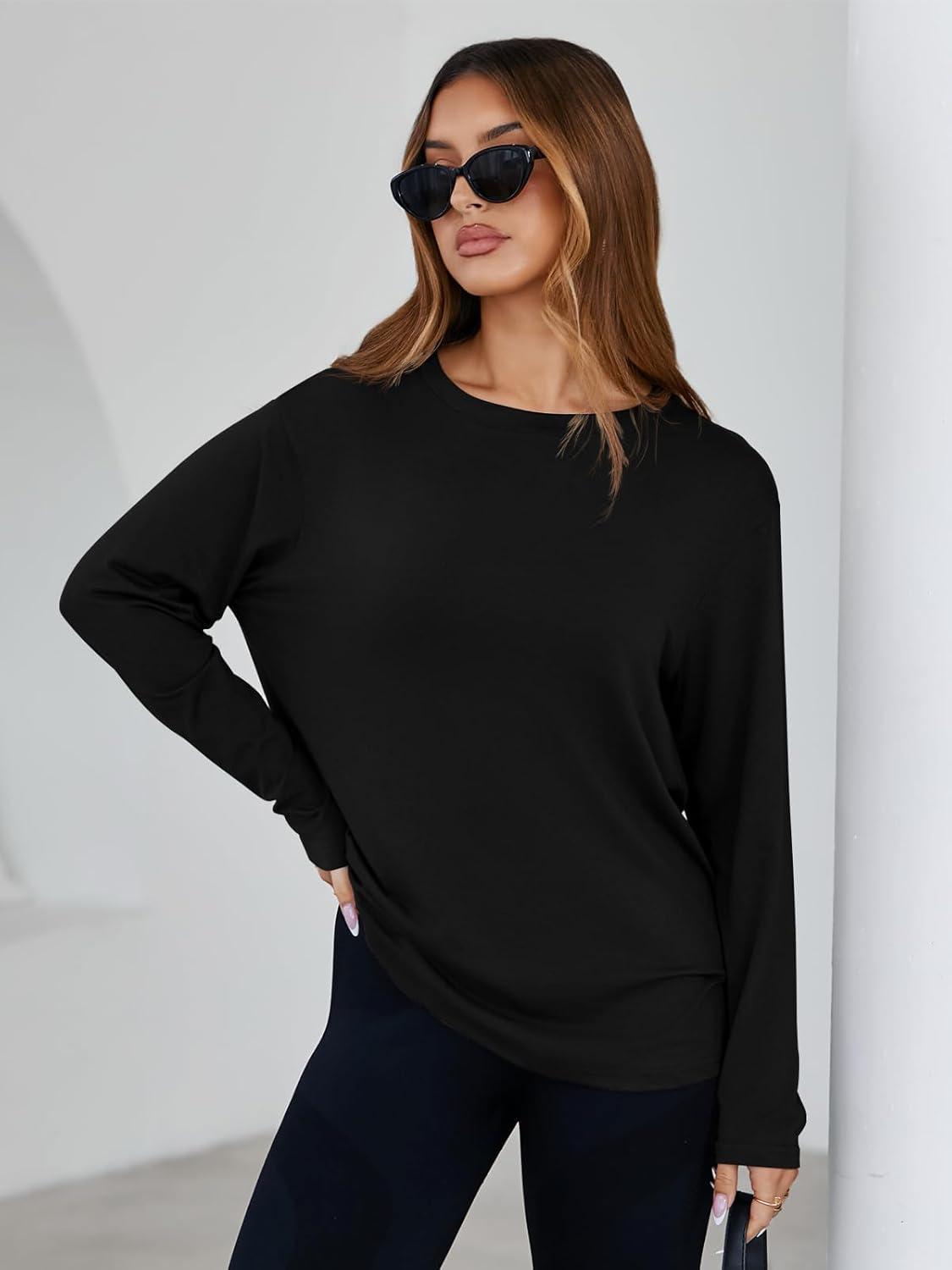 Tankaneo Womens Long Sleeve Oversized T Shirts Basic Crewneck Workout Tee Tops 2025 Fall Loose Fit Casual Y2K Clothes(Black)