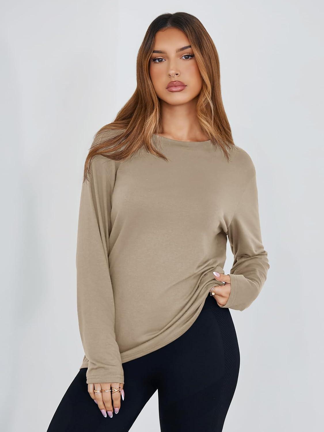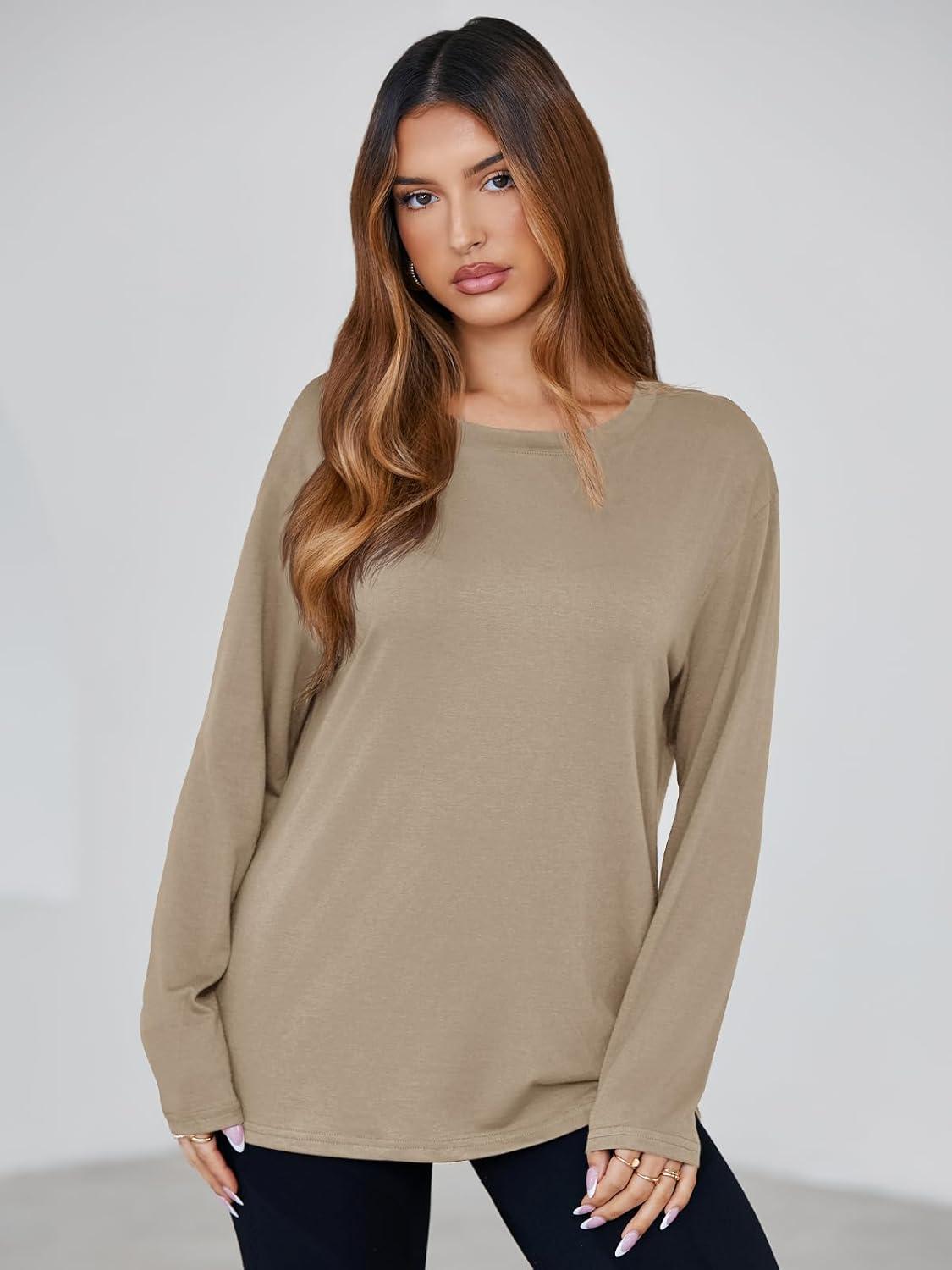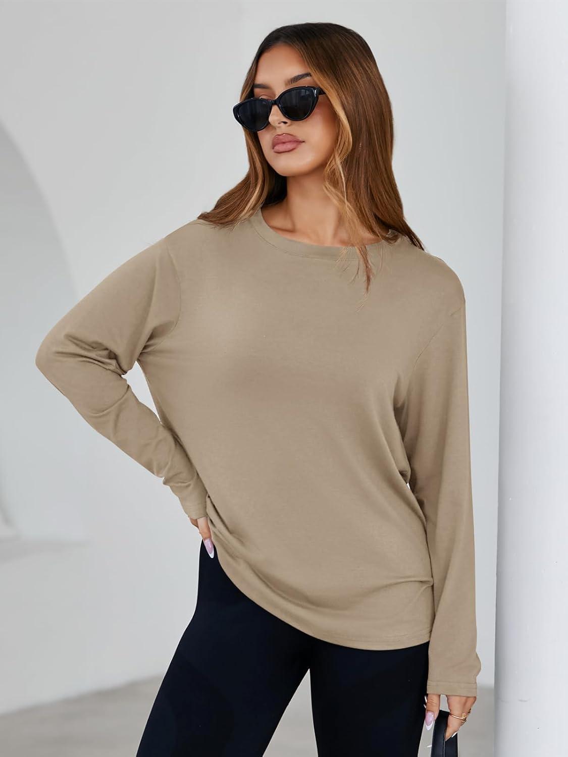 Tankaneo Womens Long Sleeve Oversized T Shirts Basic Crewneck Workout Tee Tops 2025 Fall Loose Fit Casual Y2K Clothes(Khaki)
