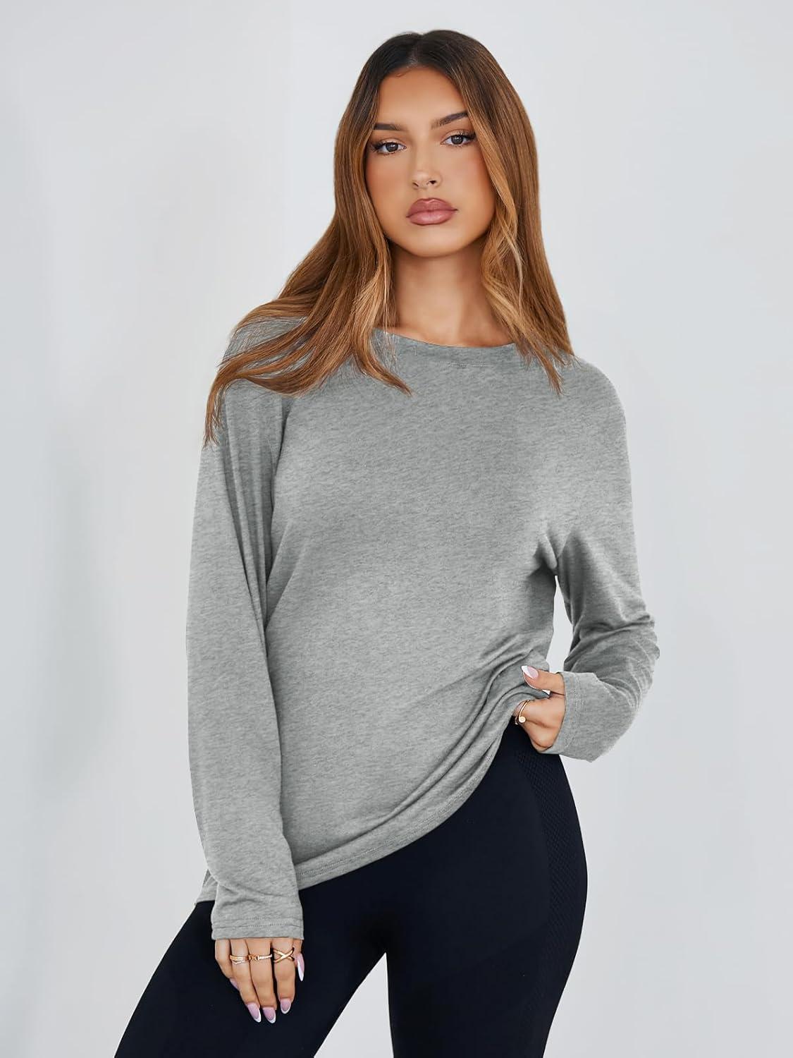 Tankaneo Womens Long Sleeve Oversized T Shirts Basic Crewneck Workout Tee Tops 2025 Fall Loose Fit Casual Y2K Clothes(Light Grey)