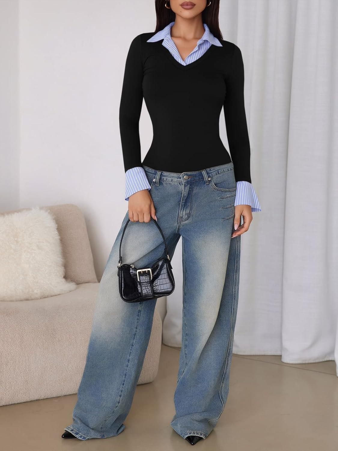 Tankaneo Womens Long Sleeve Polo Shirts Business Casual Work Tops Slim Fit V Neck Collared Patchwork Fall Outfits(Black)
