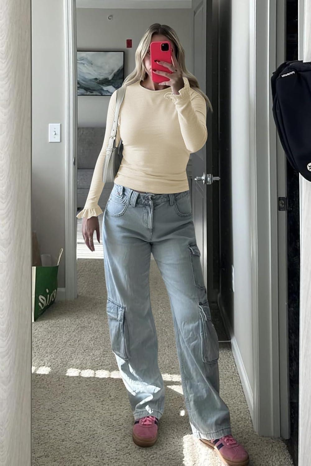 Tankaneo Womens Long Sleeve Shirts 2025 Fall Trendy Basic Tees Ruffle Going Out Tops Outfits Y2k Clothes(Beige)