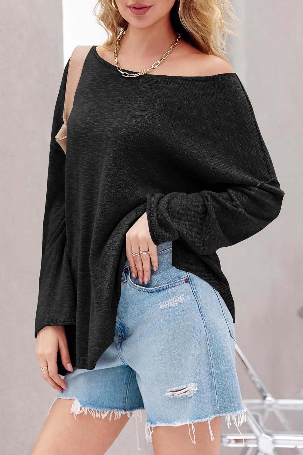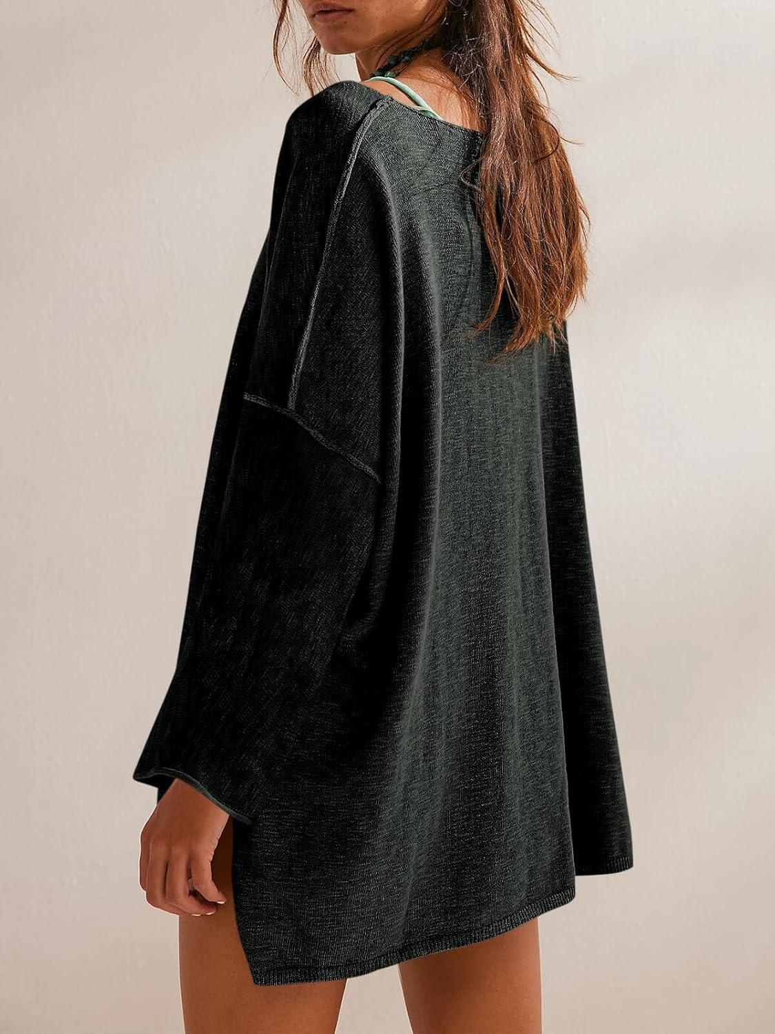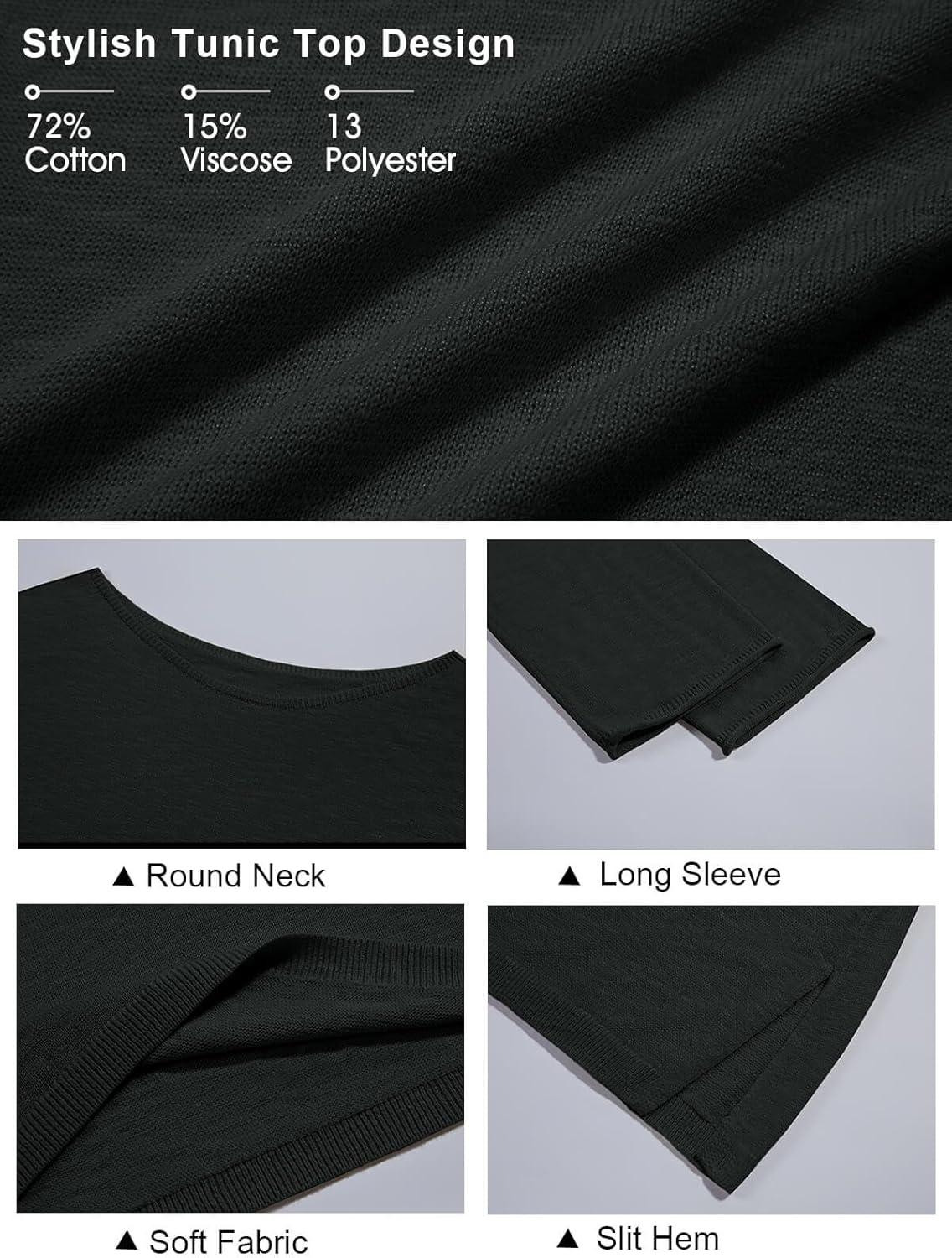 Tankaneo Womens Long Sleeve Shirts Oversized Lightweight Sweaters Crewneck Side Slit Hem Casual Blouse Tunic Tops(Black)