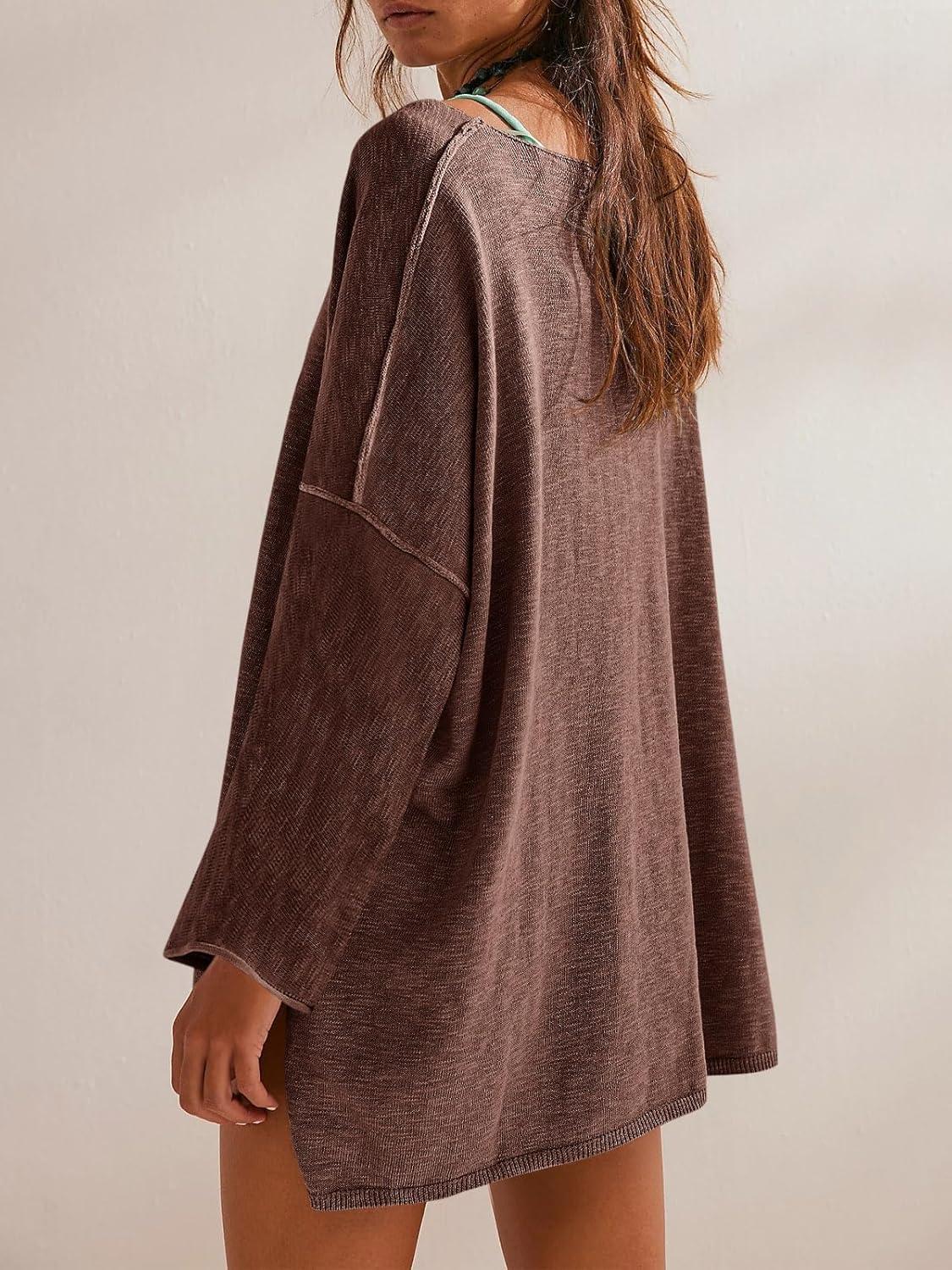 Tankaneo Womens Long Sleeve Shirts Oversized Lightweight Sweaters Crewneck Side Slit Hem Casual Blouse Tunic Tops(Coffee)