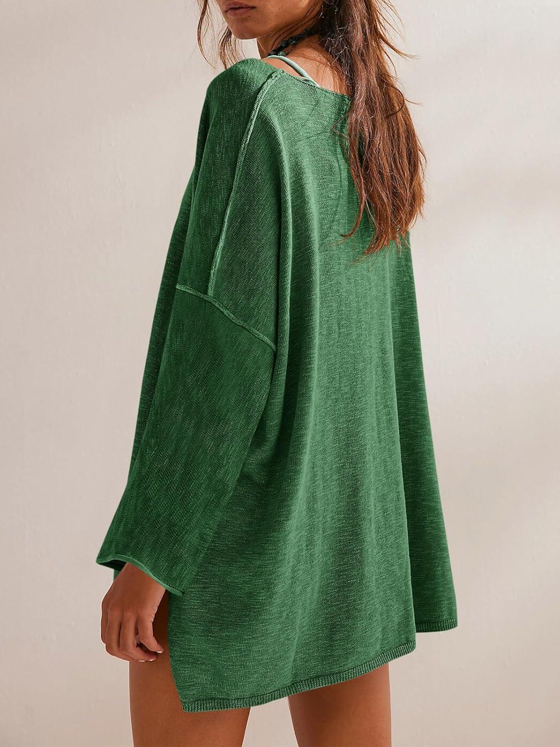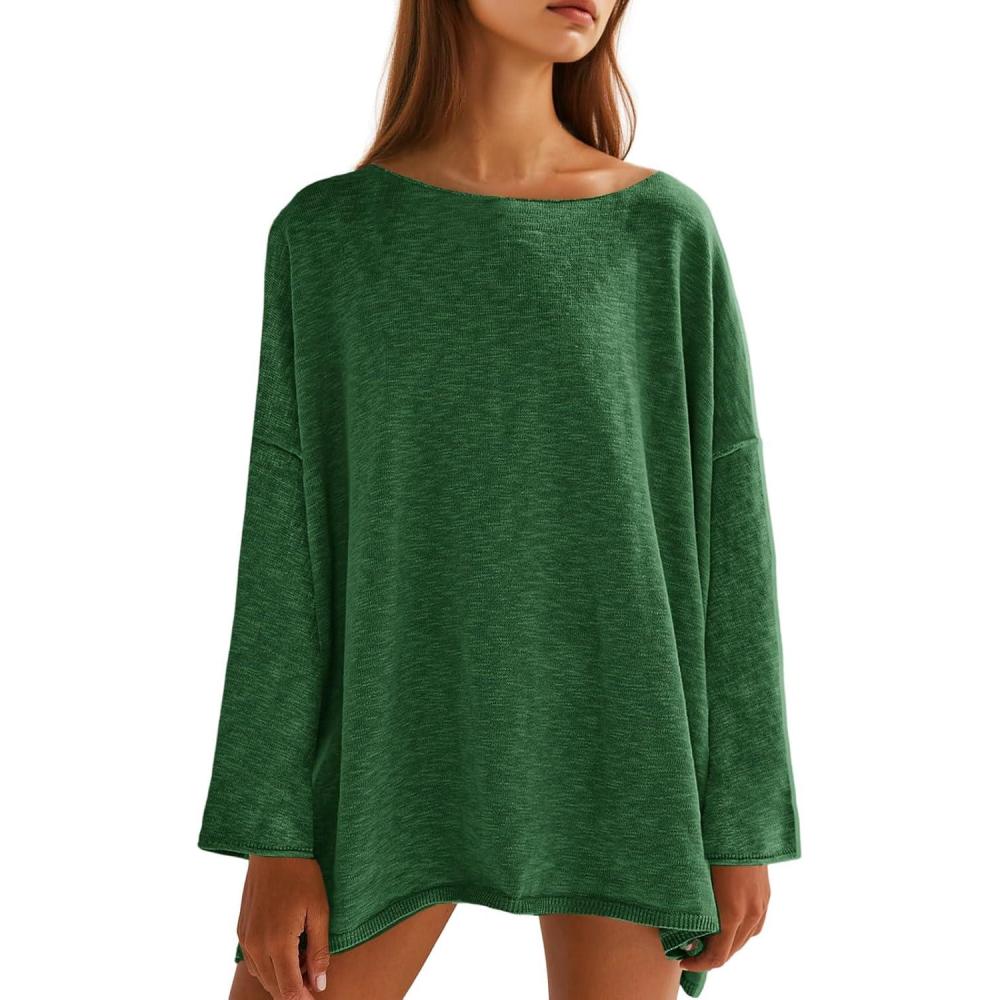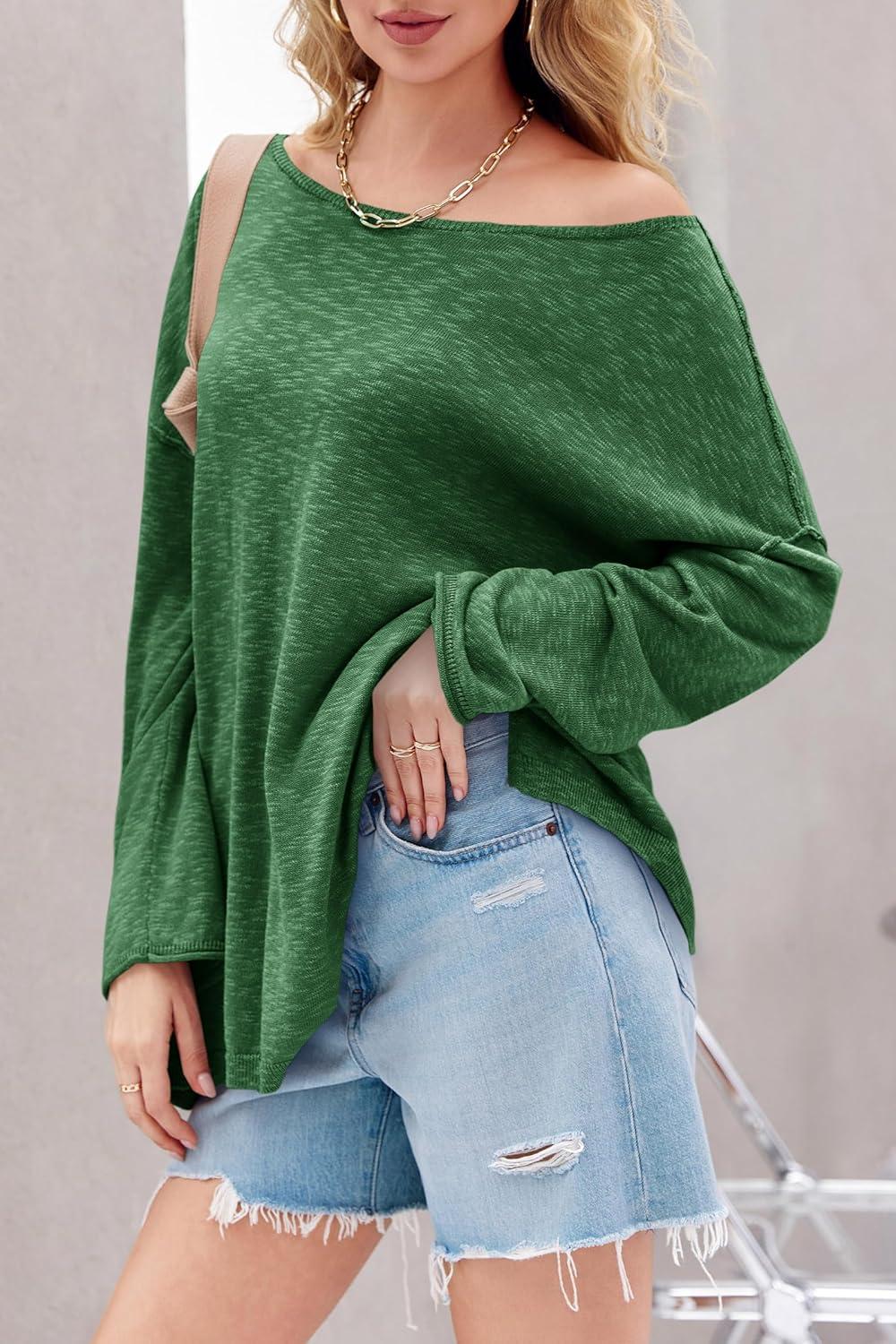 Tankaneo Womens Long Sleeve Shirts Oversized Lightweight Sweaters Crewneck Side Slit Hem Casual Blouse Tunic Tops(Green)