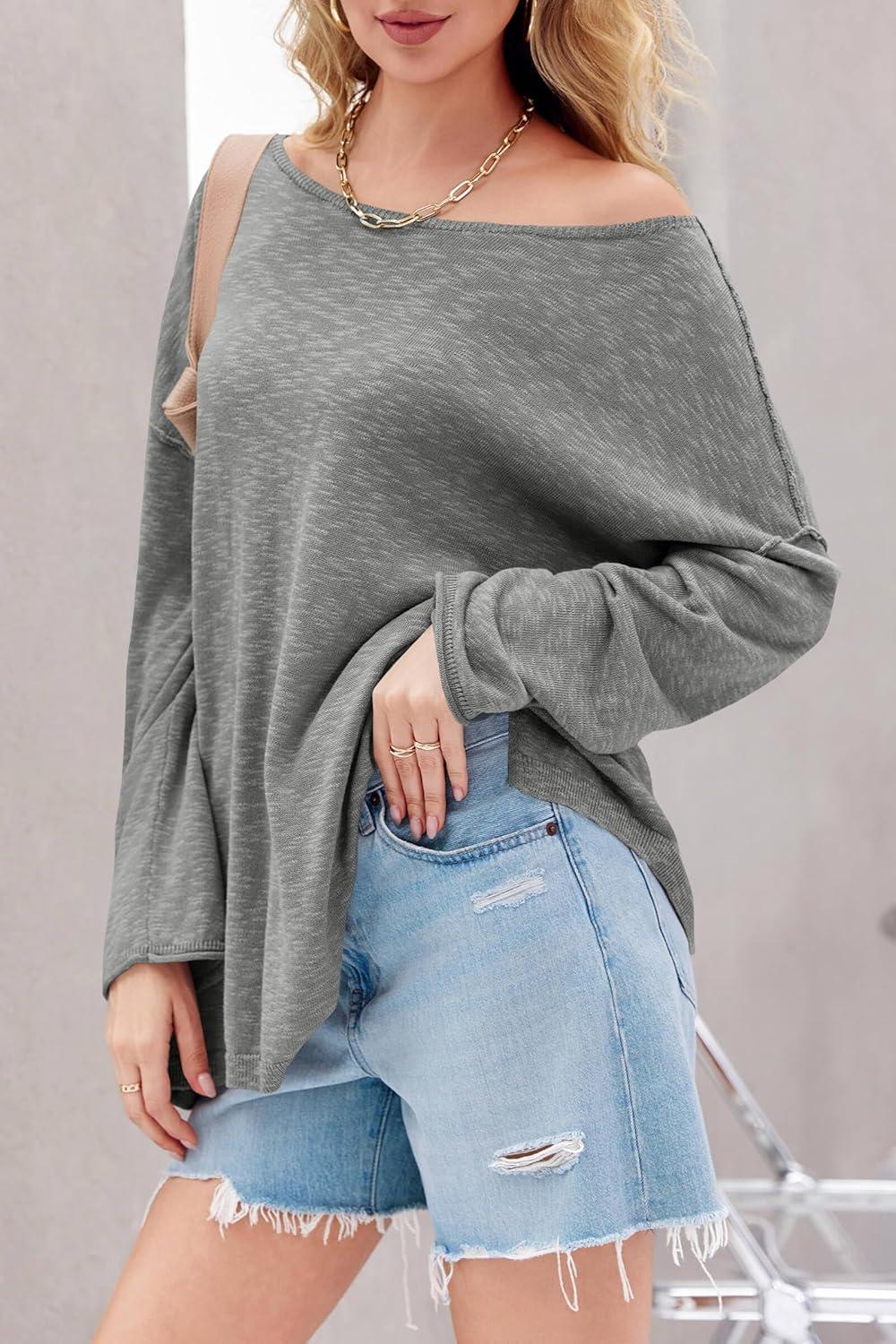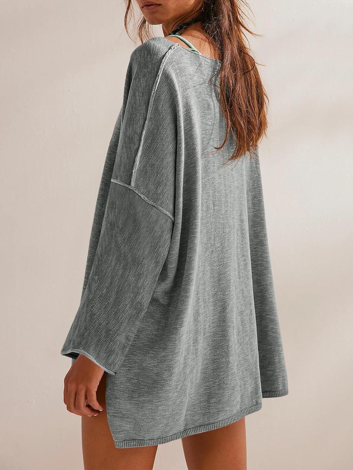 Tankaneo Womens Long Sleeve Shirts Oversized Lightweight Sweaters Crewneck Side Slit Hem Casual Blouse Tunic Tops(Grey)