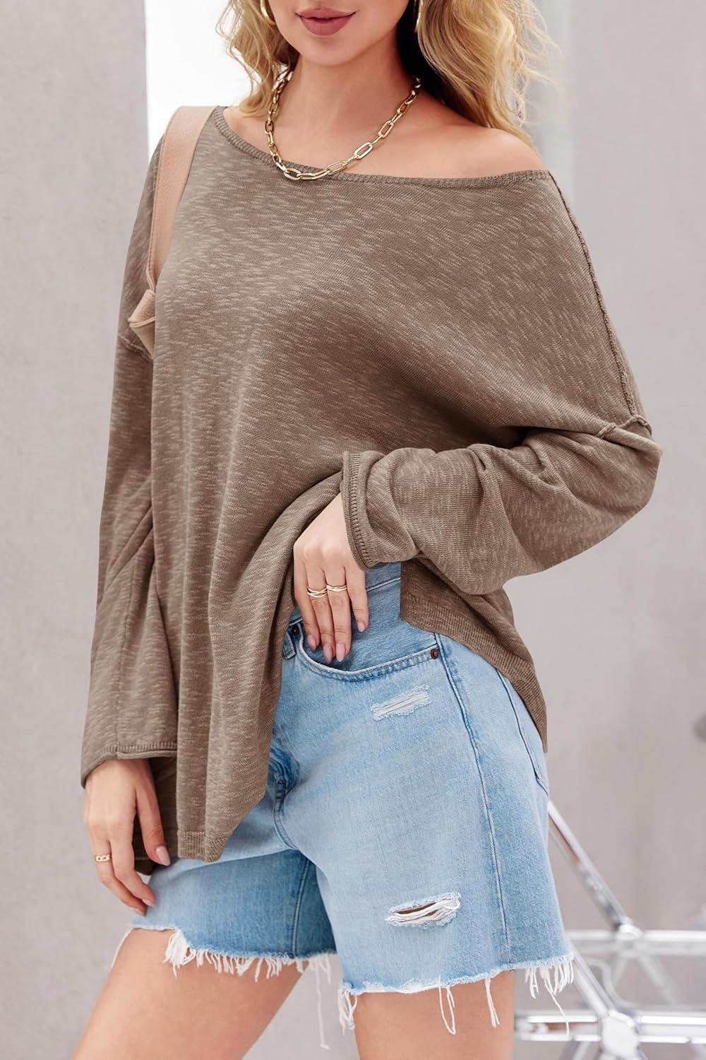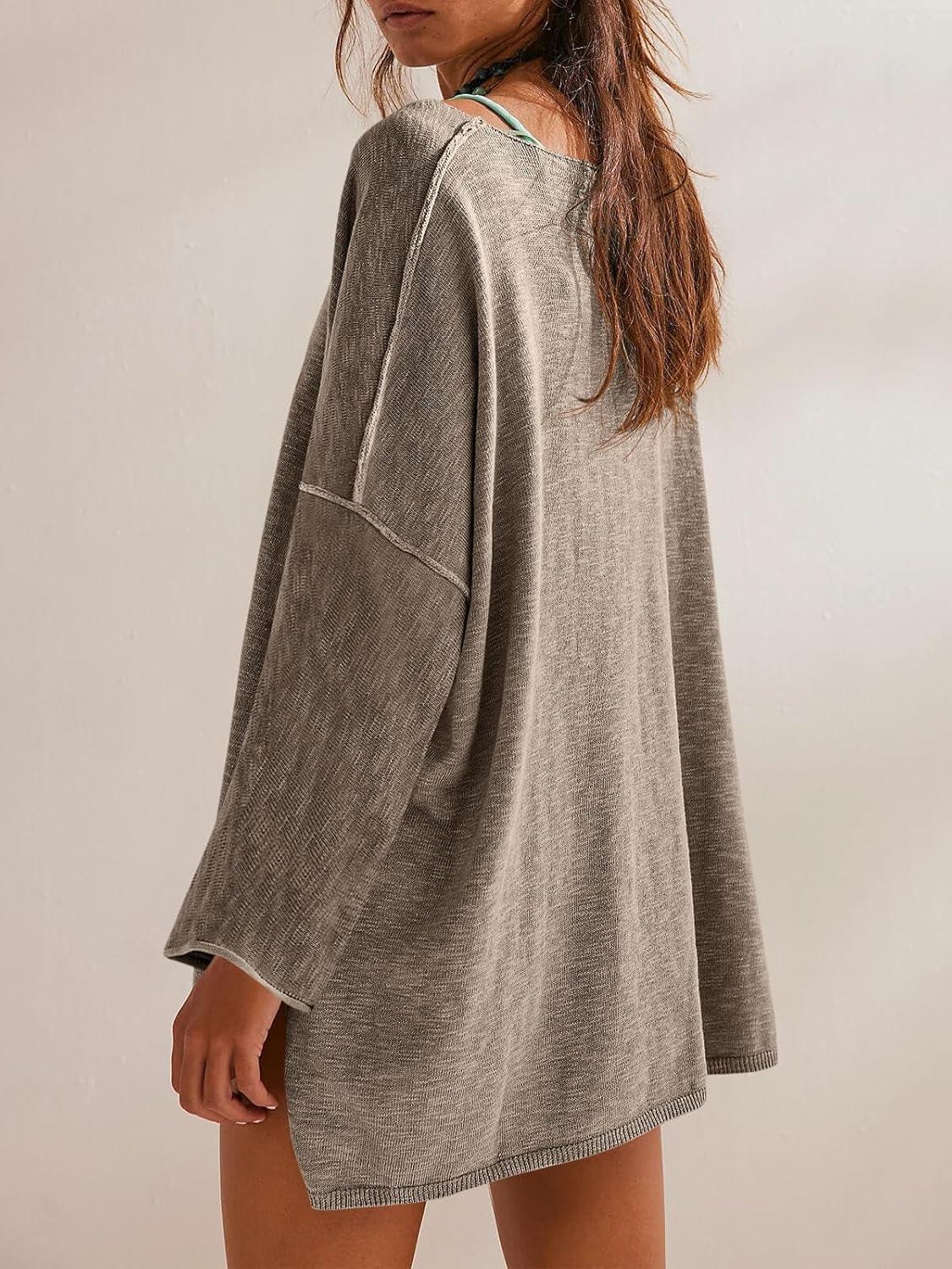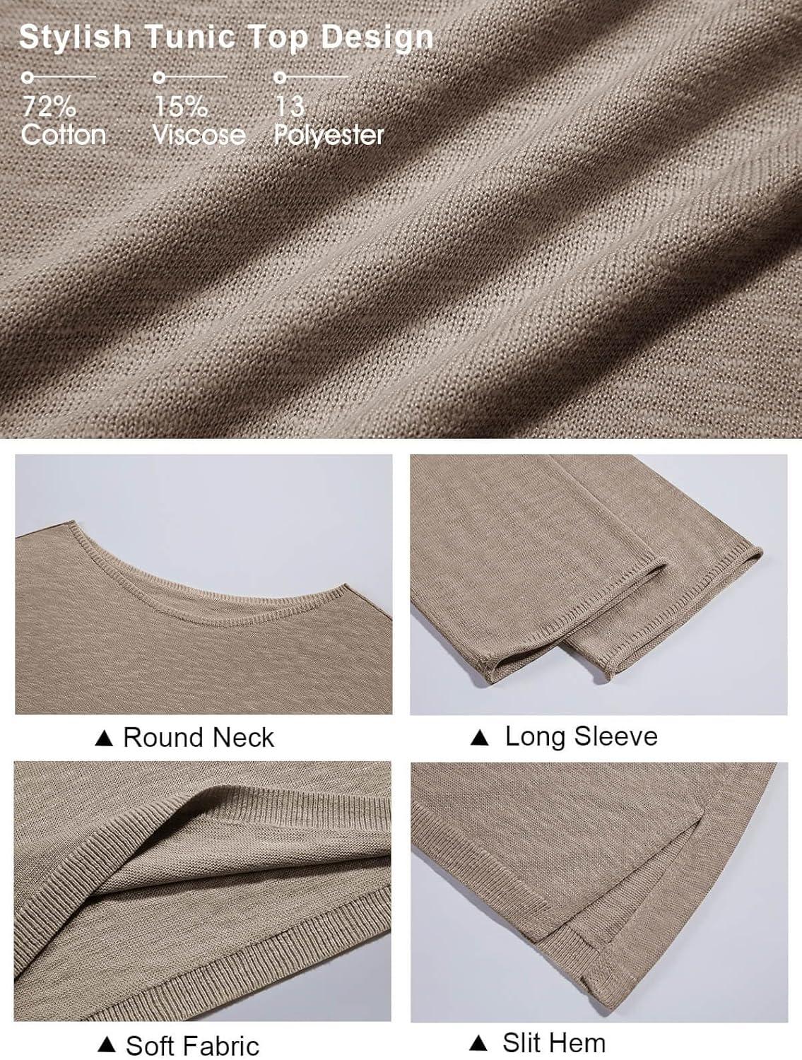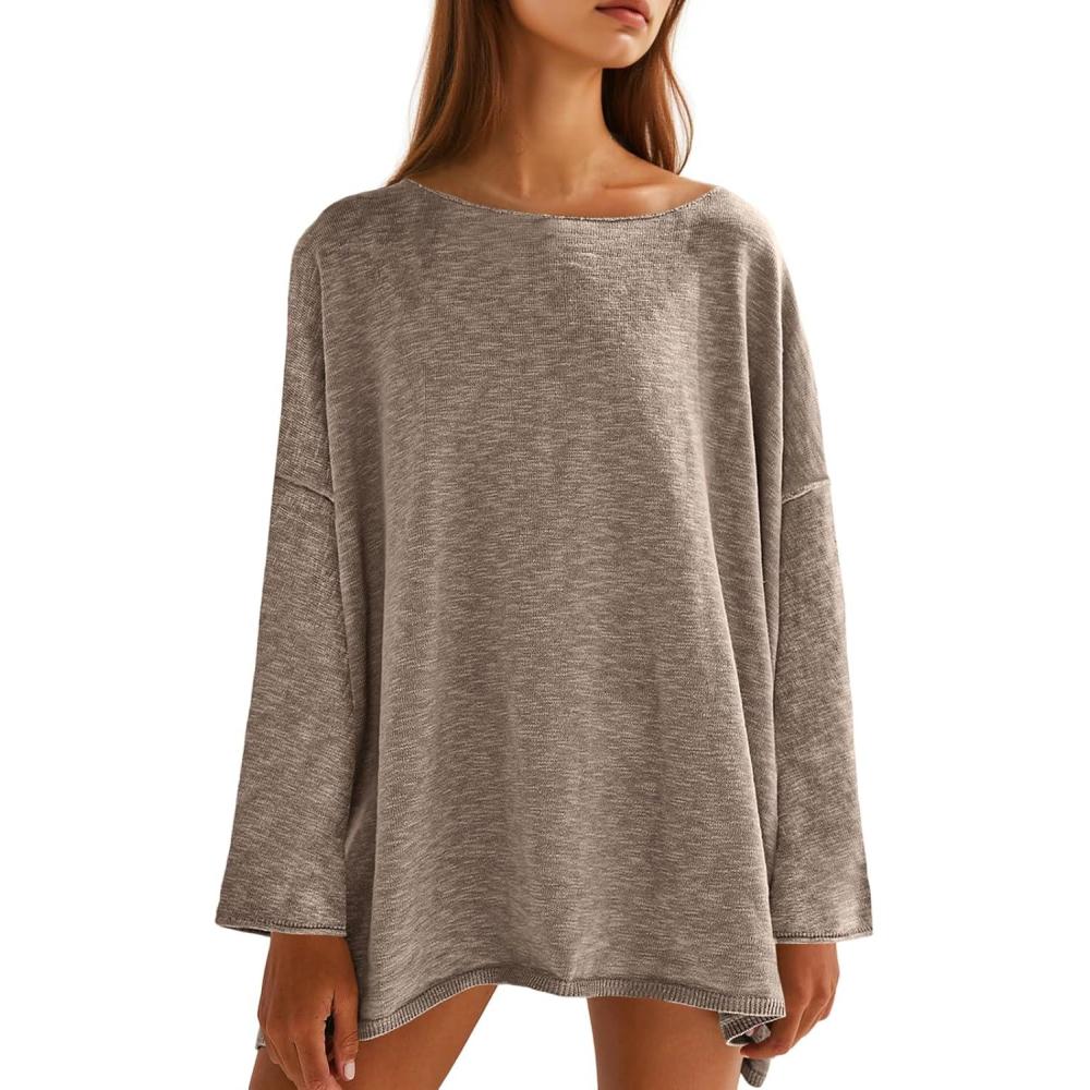 Tankaneo Womens Long Sleeve Shirts Oversized Lightweight Sweaters Crewneck Side Slit Hem Casual Blouse Tunic Tops(Khaki)