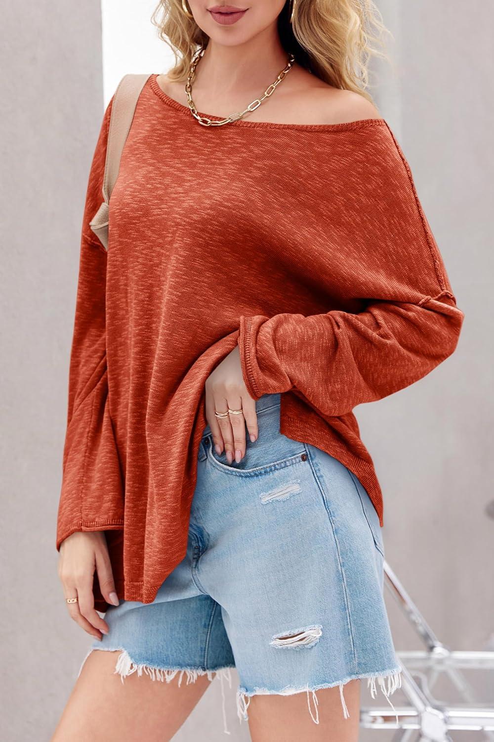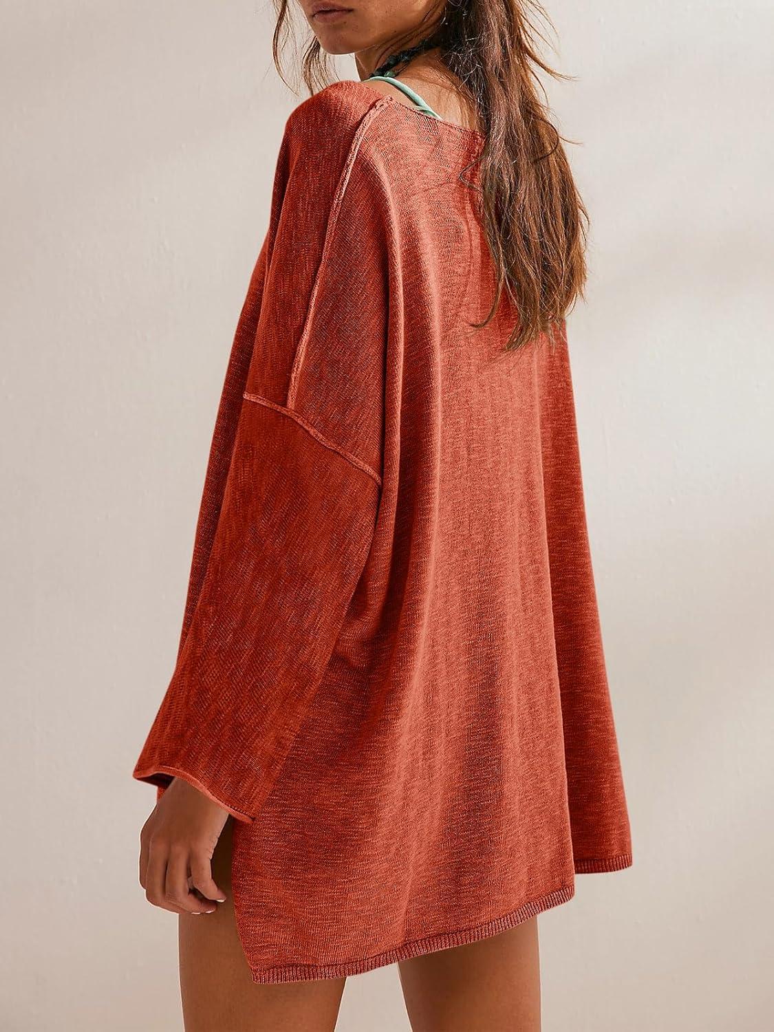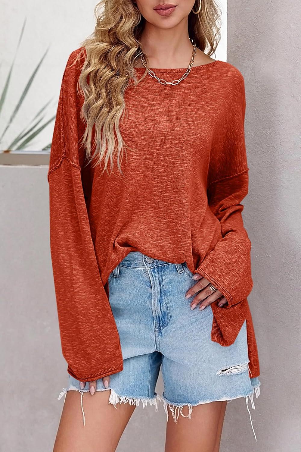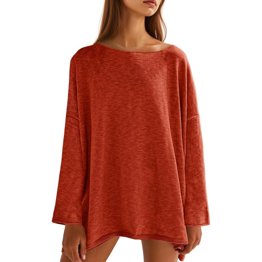 Tankaneo Womens Long Sleeve Shirts Oversized Lightweight Sweaters Crewneck Side Slit Hem Casual Blouse Tunic Tops(Red)