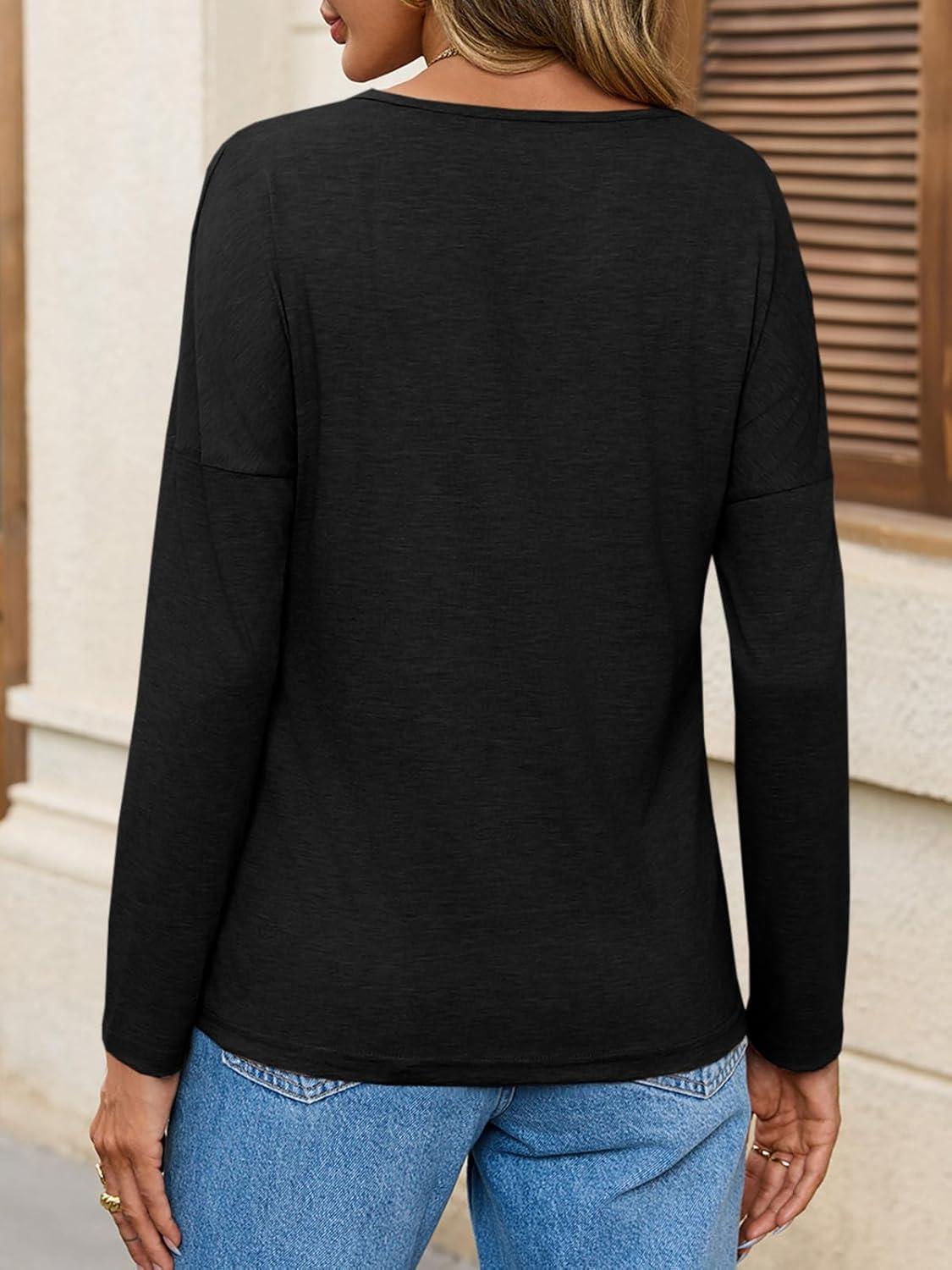Tankaneo Womens Long Sleeve T-Shirts Casual V Neck Loose Fit Shirts 2025 Fall Lightweight Basic Tees(Black)