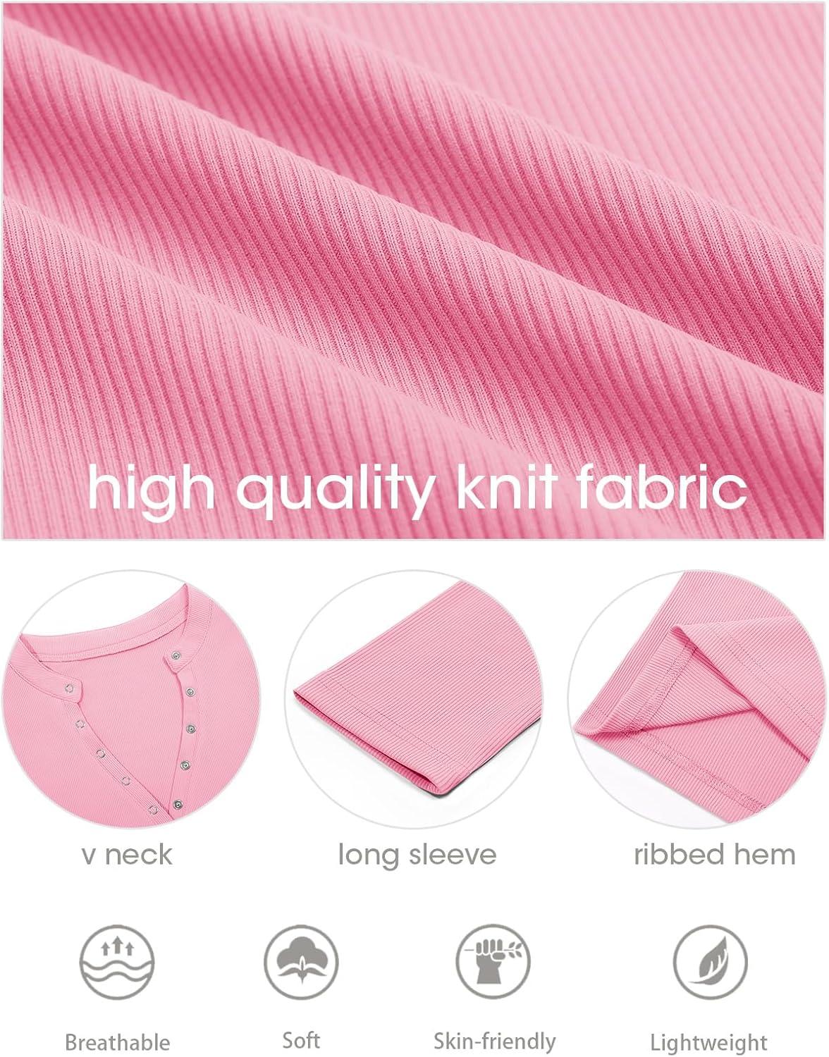 Tankaneo Womens Long Sleeve T-Shirts Deep V Neck Casual Cropped Henley Shirt Ribbed Knit Button Up 2025 Basic Tees(Pink)