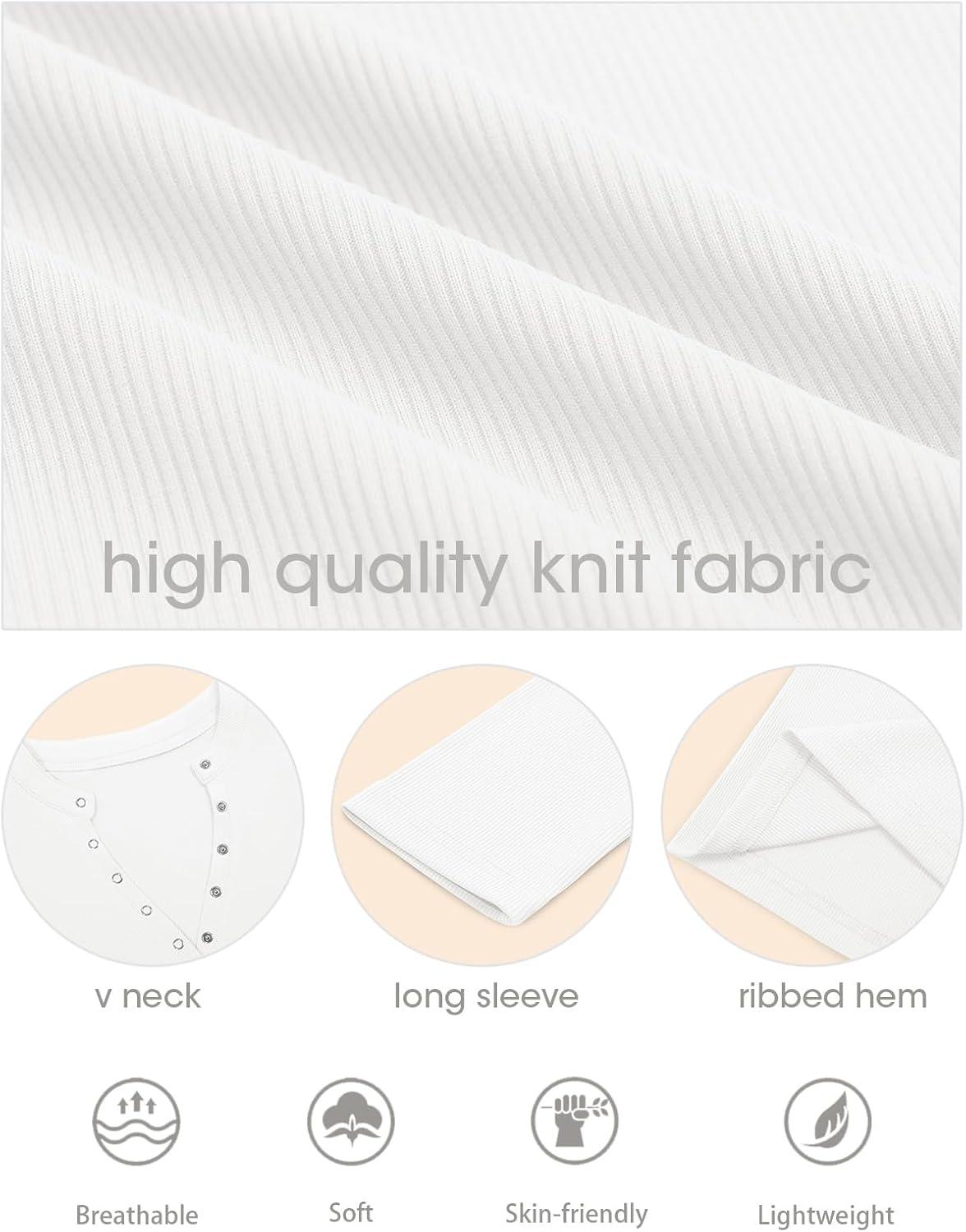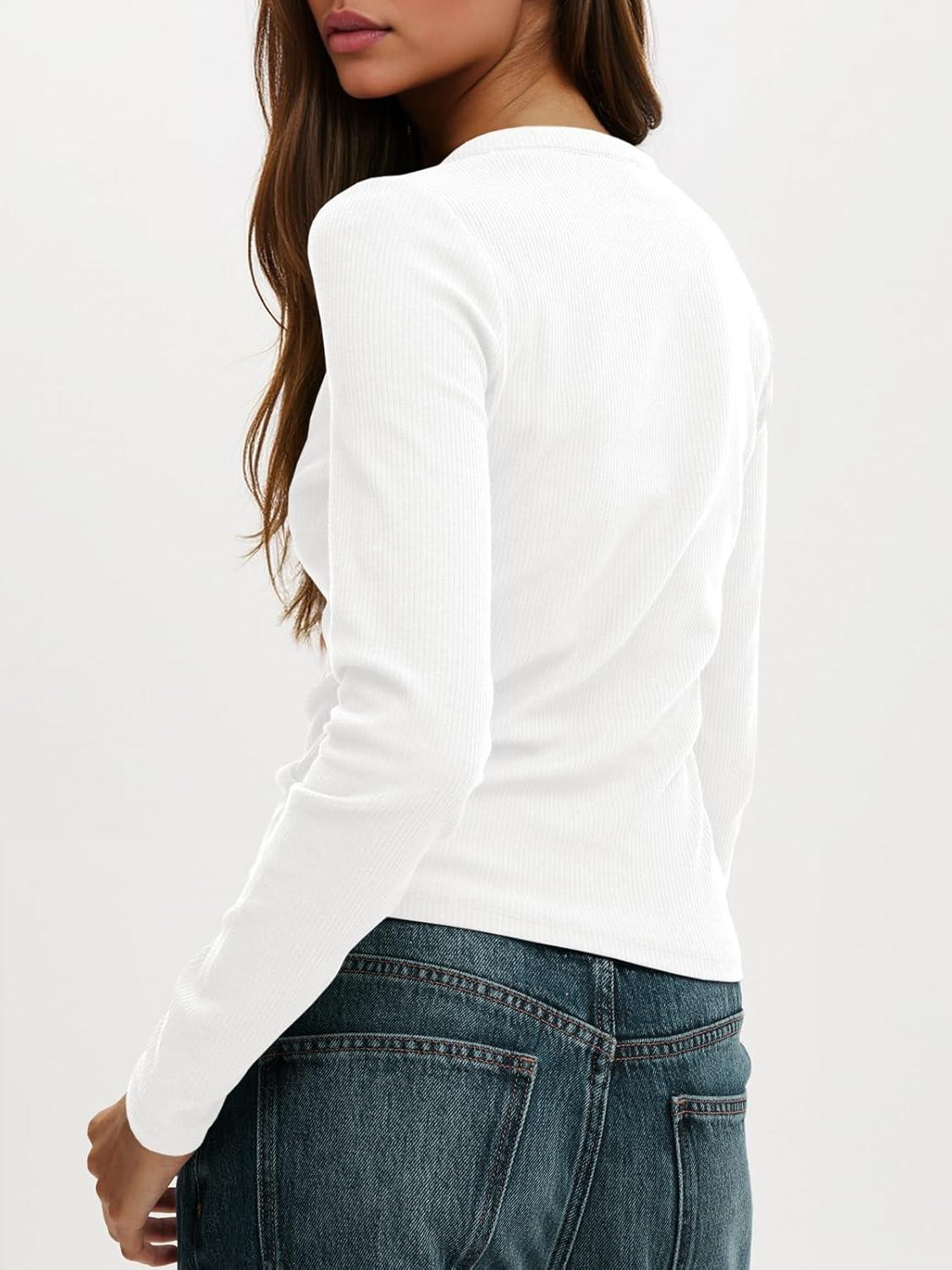 Tankaneo Womens Long Sleeve T-Shirts Deep V Neck Casual Cropped Henley Shirt Ribbed Knit Button Up 2025 Basic Tees(White)