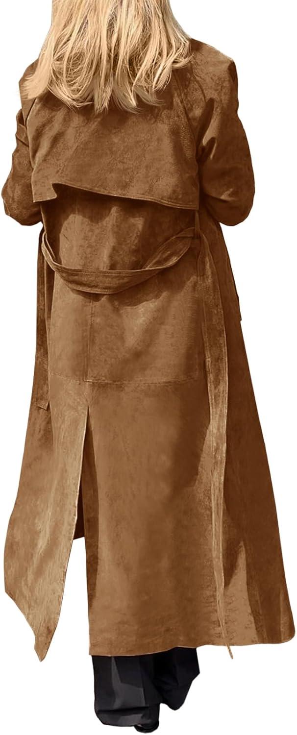 Tankaneo Womens Long Trench Coat Fall Faux Suede Jackets Double Breasted Lapel Pea Coat with Belt(Dark Khaki)