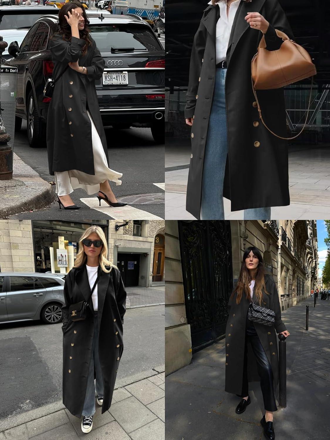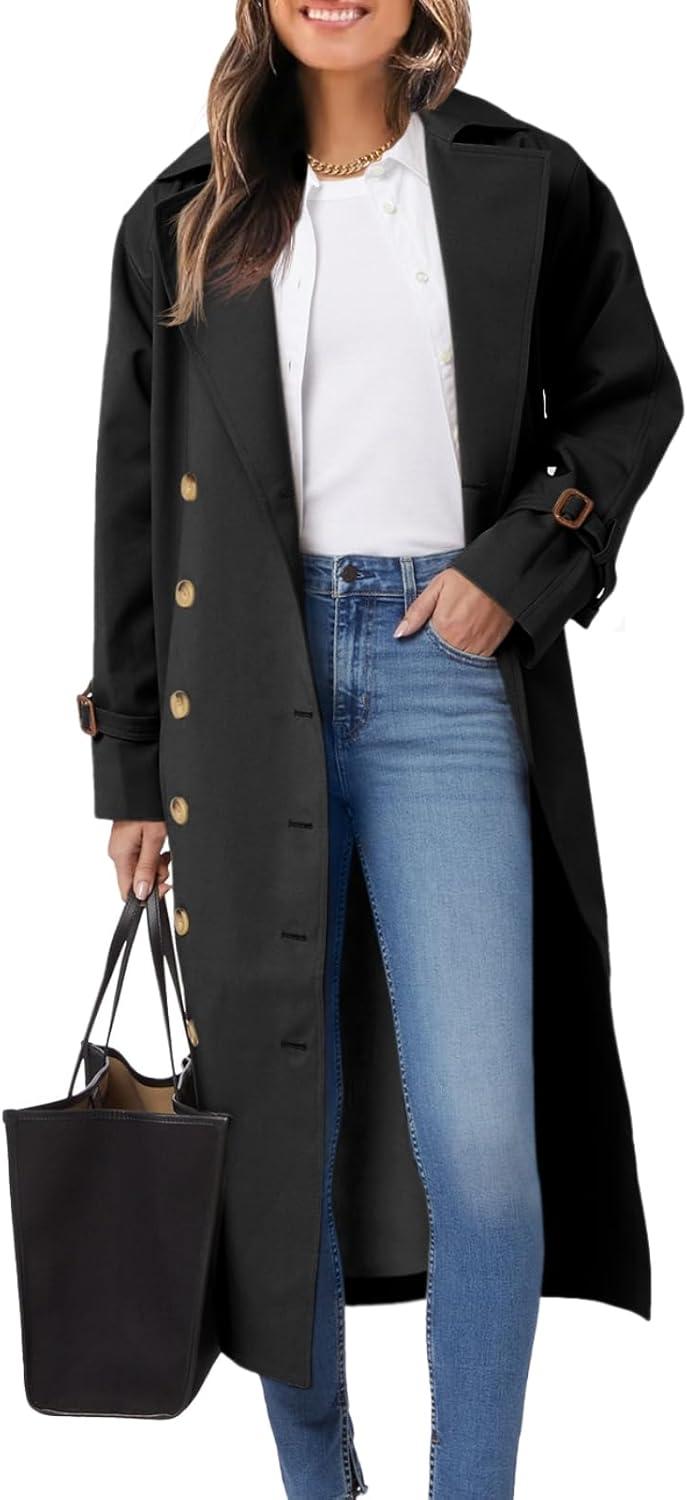 Tankaneo Womens Long Trench Coat Oversized Double Breasted Windproof Classic Lapel Casual Fall Overcoat(Black)