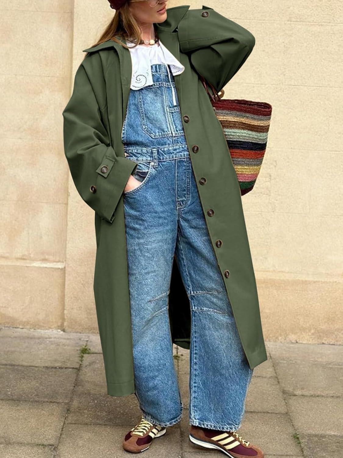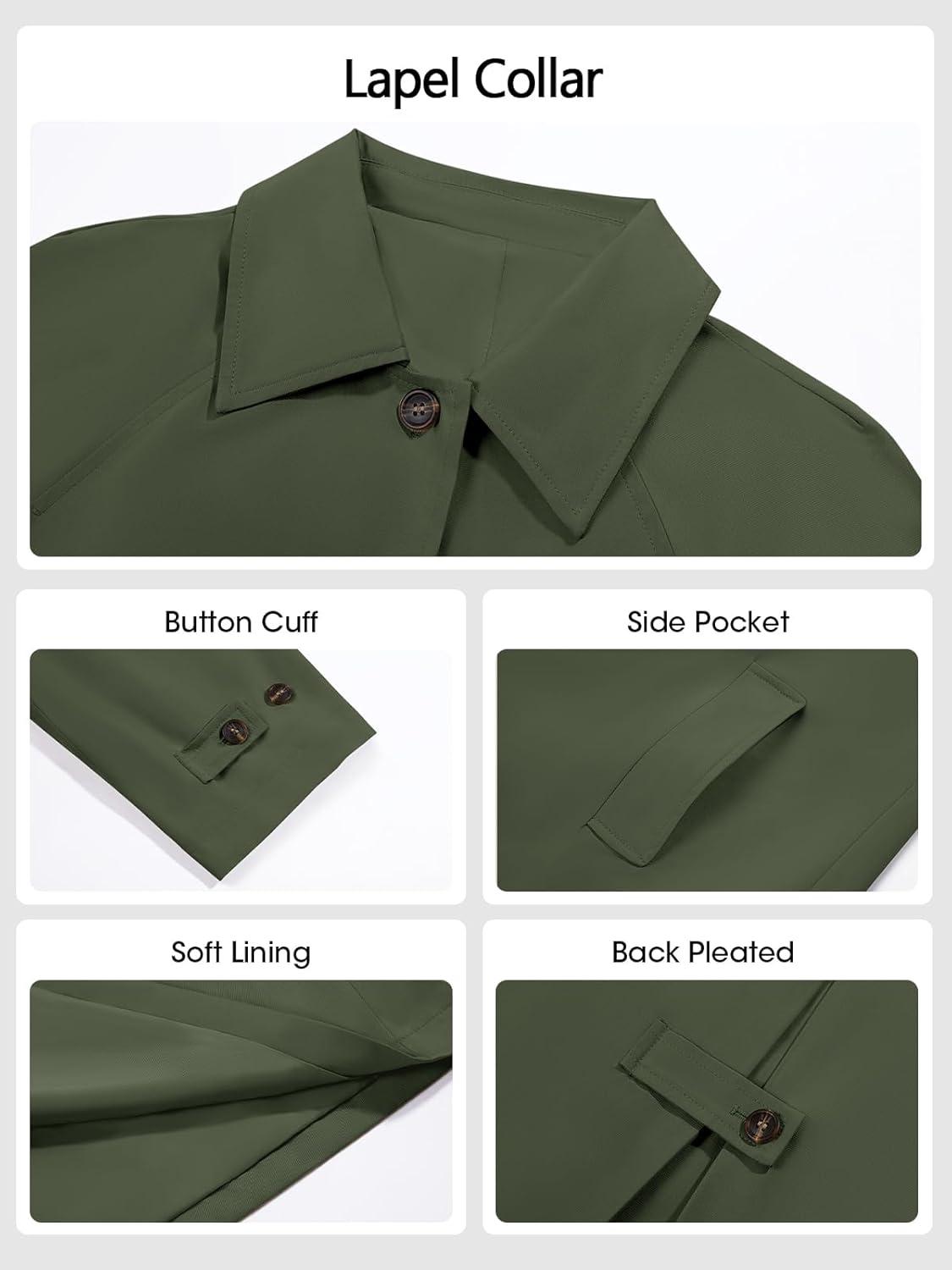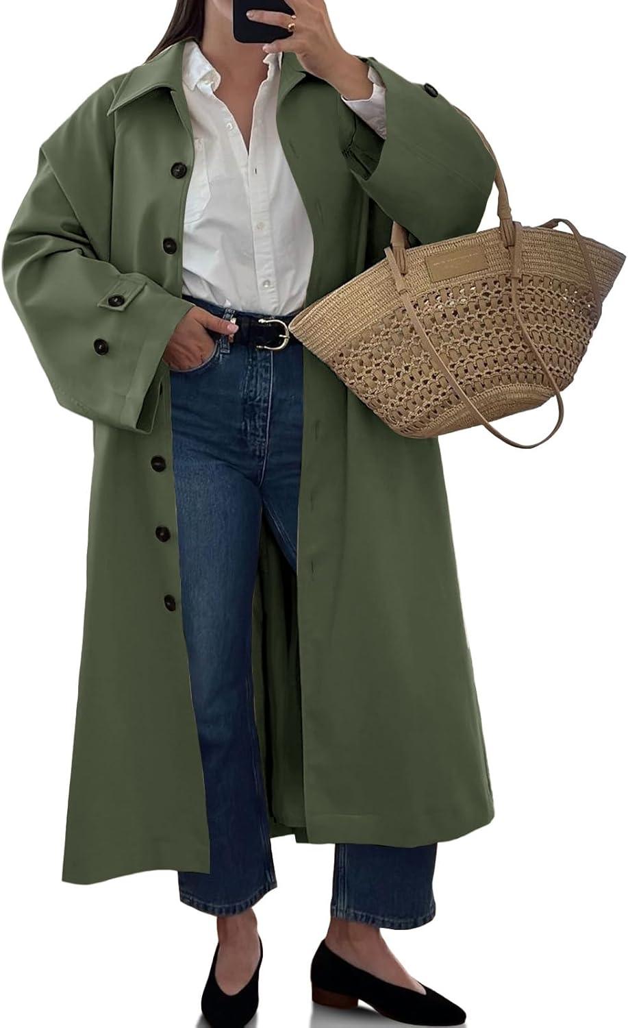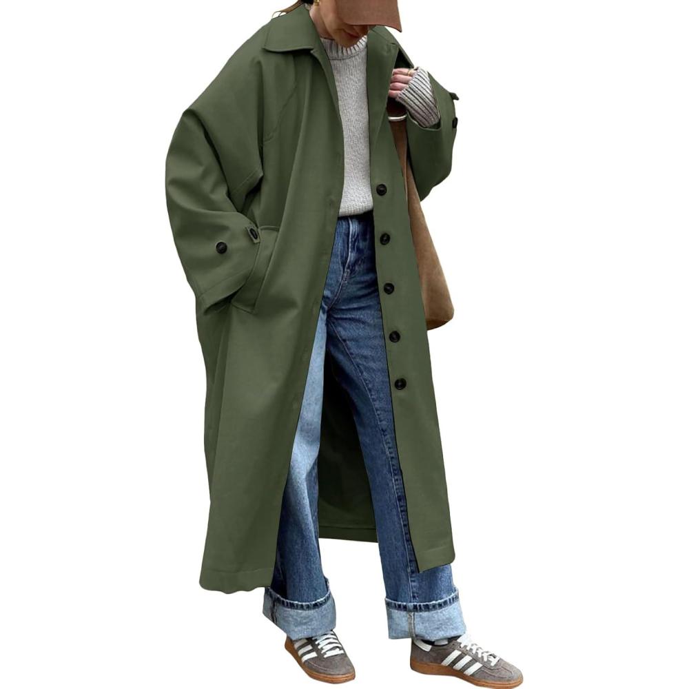 Tankaneo Womens Long Trench Coat Single Breasted Oversized Windproof Classic Lapel Fall Overcoat(Army Green)